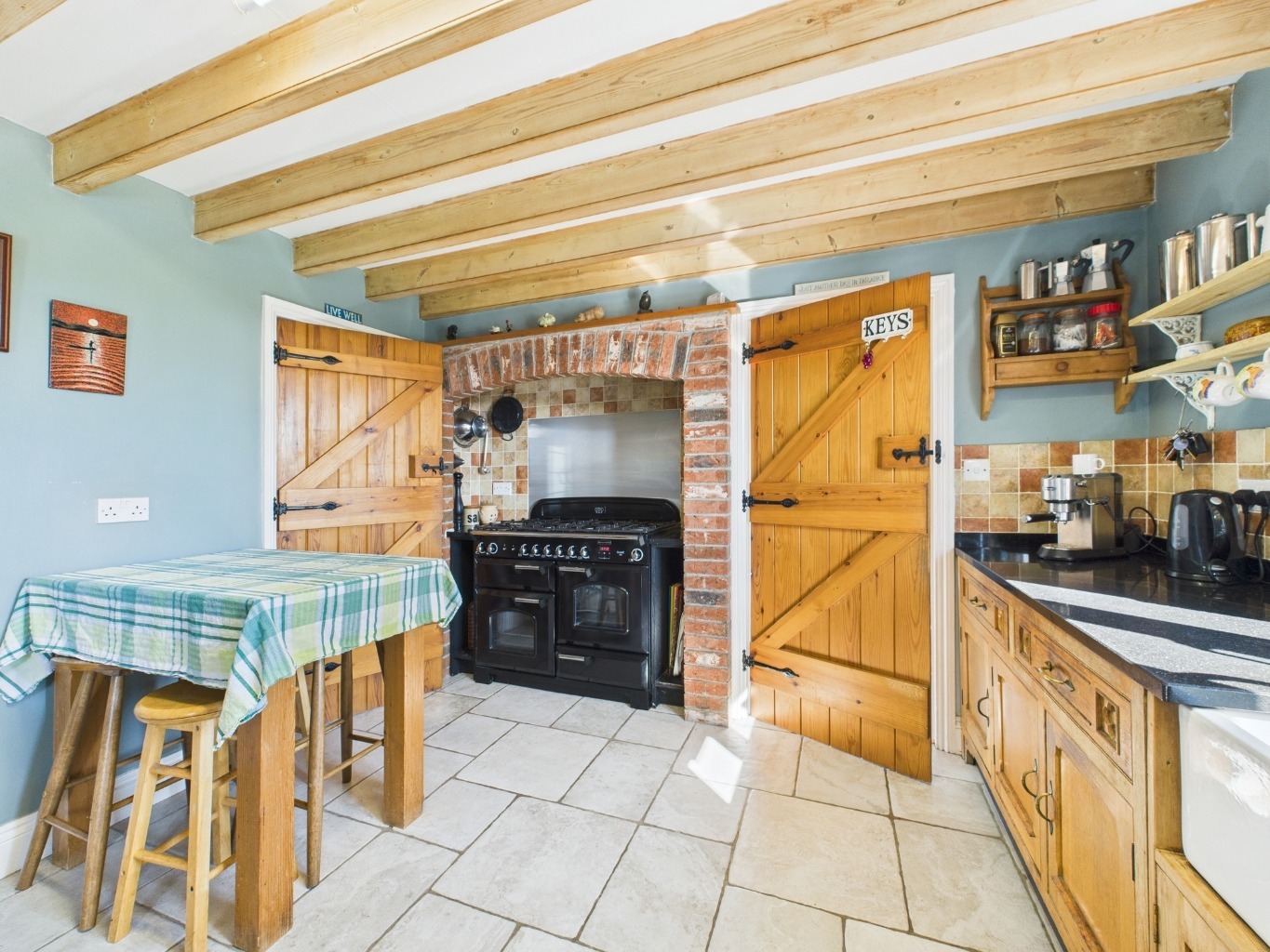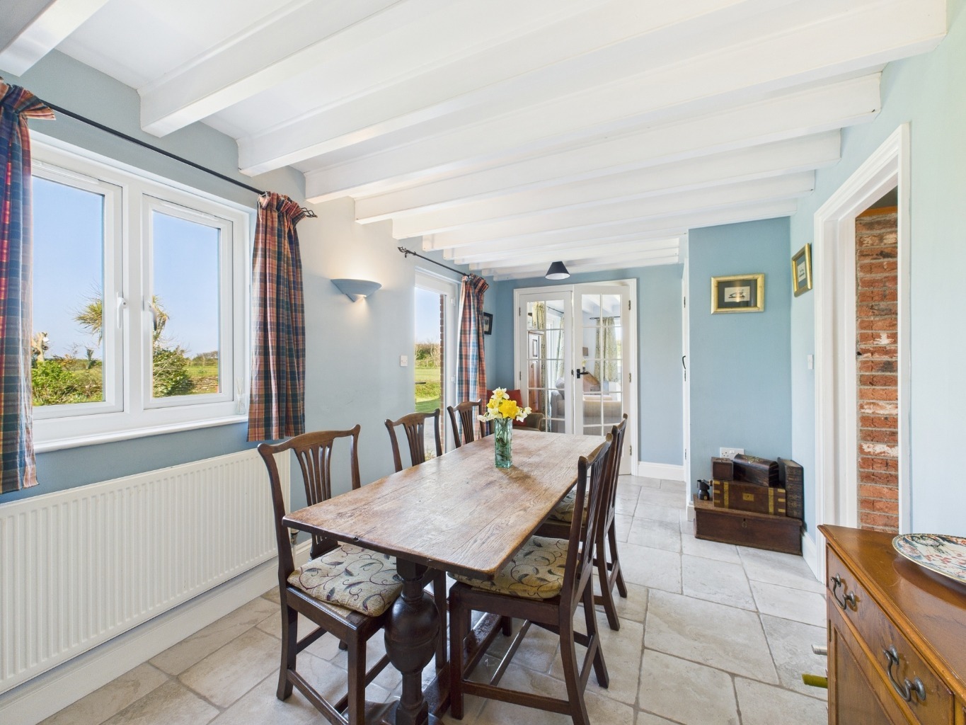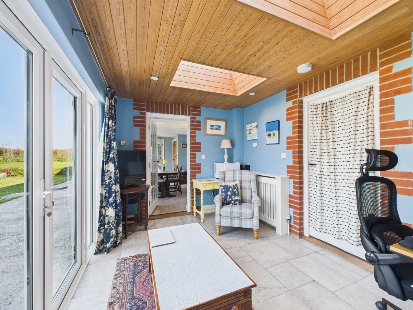 The kitchen is well-equipped with a range-style cooker and bespoke timber cabinetry, blending practicality with rustic charm. Leading directly off the kitchen is a generous utility room with further storage and appliance space — a practical addition for busy family life. Beyond this, a useful downstairs WC with ample storage completes this wing of the house, perfect for everyday convenience and muddy boots! An adjoining dining room enjoys direct access to the garden – perfect for entertaining or al fresco dining. A bright sunroom, currently used as a home office, provides yet another relaxing retreat with French doors opening onto the grounds.