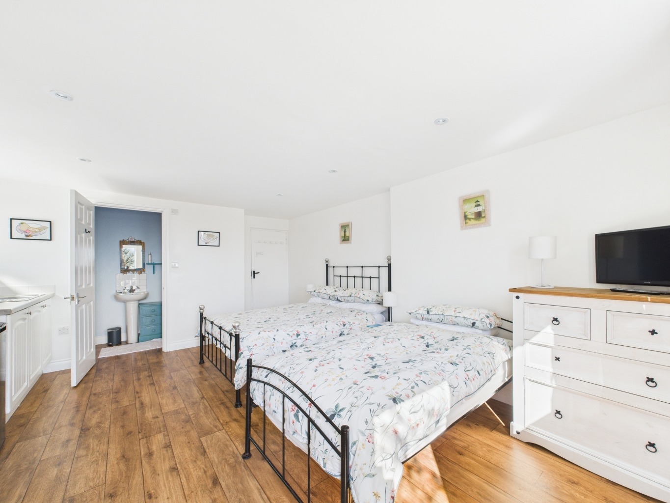 An inner hallway leads to the ground floor bedrooms. Bedroom Four is a generous double room with its own kitchenette and WC, as well as a private door leading to the front driveway — historically used as a successful B&B room. This has operated in conjunction with Bedroom Five, also a good-sized double, and a family shower room, offering flexibility for income generation or guest accommodation.