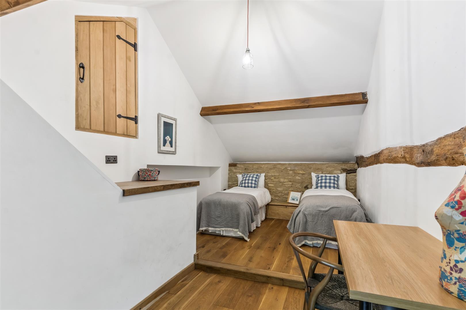 Leaving the kitchen/breakfast room, a hallway leads to the living areas and includes a useful large store room with exposed brickwork to one wall. Through an open doorway the capacious combined living and dining rooms stretch before you. The vaulted ceiling with its exposed timber "A" frames lends emphasis to the grandiose impression of space. Bi-fold doors open to the terrace and gardens, A pleasing period feature is the retention of a rustic interior hanging barn door with the mechanisms still intact. Flooring in this room is in engineered oak which continues around the rest of the ground floor which has underfloor heating installed. The heating is fuelled by LPG.