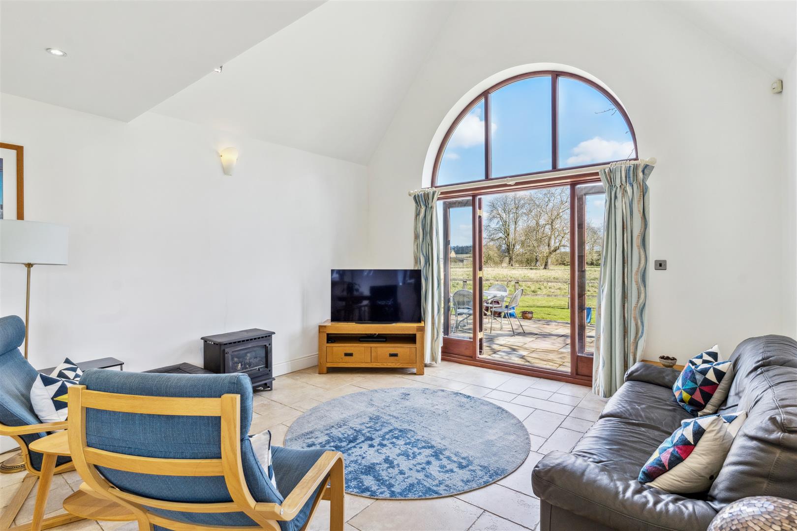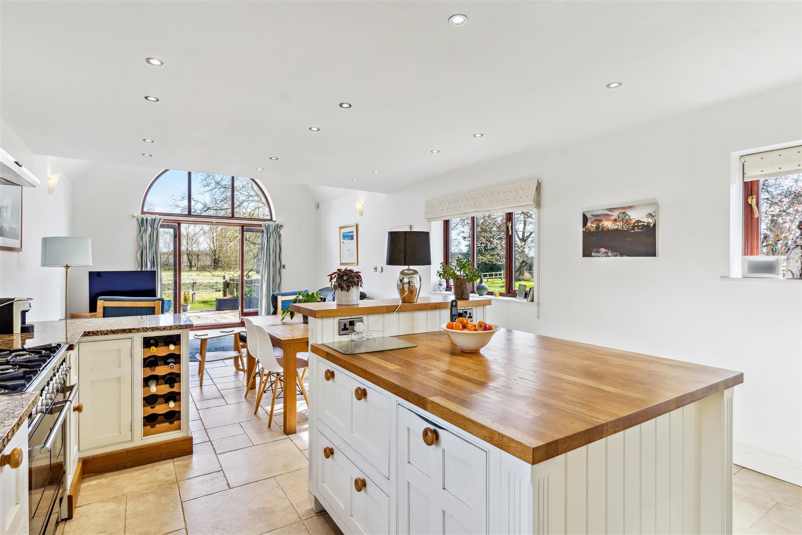 Property Walk Through - The entrance door opens into a spacious hallway. From the hallway a bespoke staircase with oak balustrades rises to the first floor. A cloakroom with WC and wash basin is found in the hallway. Entering the principal reception room, the Sitting Room and Orangery, a delightful focal point is the splendid stone fireplace mounted over a brick hearth which accommodates a wood burning stove. There are attractive aspects over the garden from the sitting room which is open plan to the Orangery. The present sellers are responsible for the building of this stunning Orangery which looks out over the carp pond towards the historic Grange. A dining room has double doors to the garden and a studio is located on the ground floor of the tower and is currently used as a music room and occasional hobby room. These rooms have a connecting door. The kitchen/breakfast room is open plan with a vaulted ceiling creating a light and airy ambience with an arched window to the gable end wall and double doors to the garden. This hand crafted kitchen has a vast array of cabinets arranged to base and high levels with deep storage drawers and wine store. Work surfaces are in granite whilst a central island provides additional storage as well as a raised breakfast bar. Integrated to the kitchen furniture are a fridge, dual fuel range cooker with two ovens, a six ring gas hob with extractor over. Space is available and plumbing provided for a dishwasher. The flooring is in Italian tile and this area has underfloor heating which continues into the family area where there is a log effect gas stove and delightful views over the garden and paddocks beyond. Alongside is a utility room with additional cupboard space, a sink unit and space and plumbing for white goods.