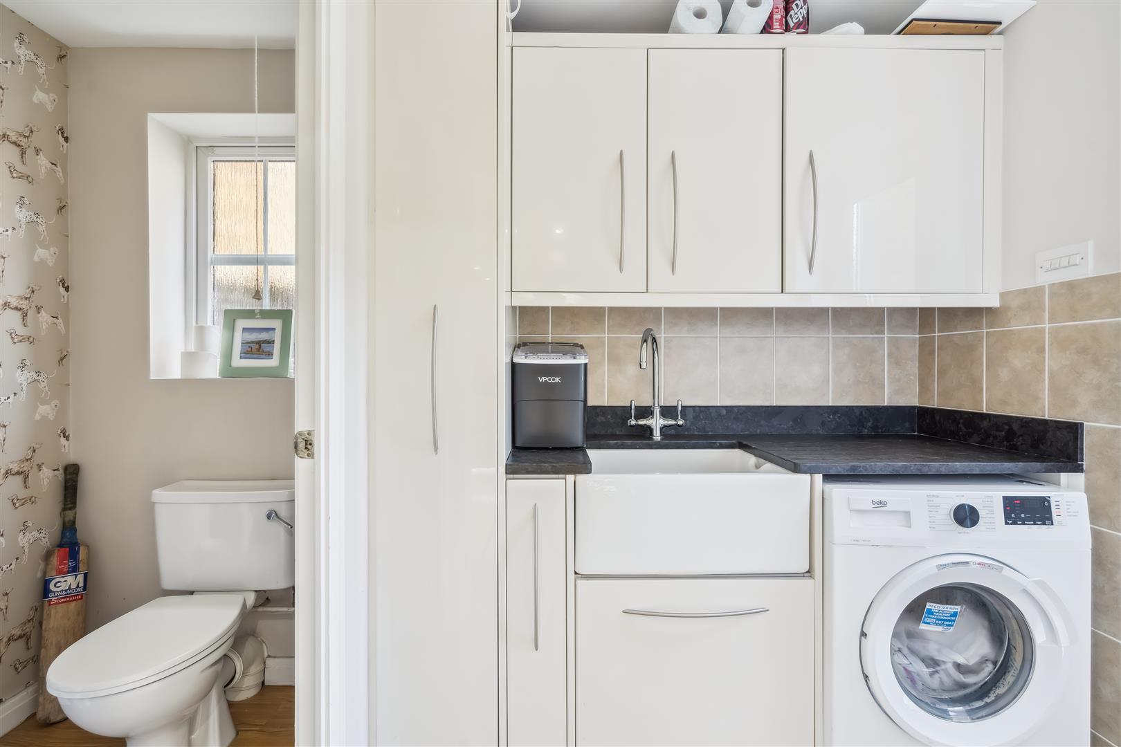 Utility room. Good range of fitted worksurfaces with inbuilt sink having mixer taps over and cupboards both under and at high levels. Plumbing and space for a washing machine. Double glazed door with inset cat flap opening to the rear elevation. There is wooden flooring, ceiling down lighters and an extractor fan. Door to: