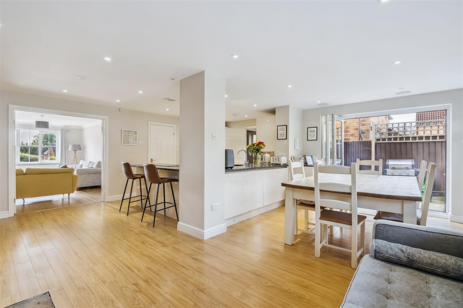 The kitchen is fitted with a range of base and eye level modern units having a "Franke" one and a half bowl sink unit with mixer tap over and cupboard under. There is a built-in fridge, freezer, "Bosch" dishwasher, Neff oven under an extractor hood and microwave. Wooden flooring and a good range of work tops. The generously proportioned dining/family room is the hub of the home. The dining area can comfortably seat six and has a built-in breakfast bar providing additional storage. Large windows to the rear aspect look onto the gardens and sliding double glazed bi-folding doors open to the side elevation and an outside patio area. Included to this area are ceiling downlights, a built-in "Cambridge" surround sound system with recessed speakers and a wall mounted LG television. Door to: