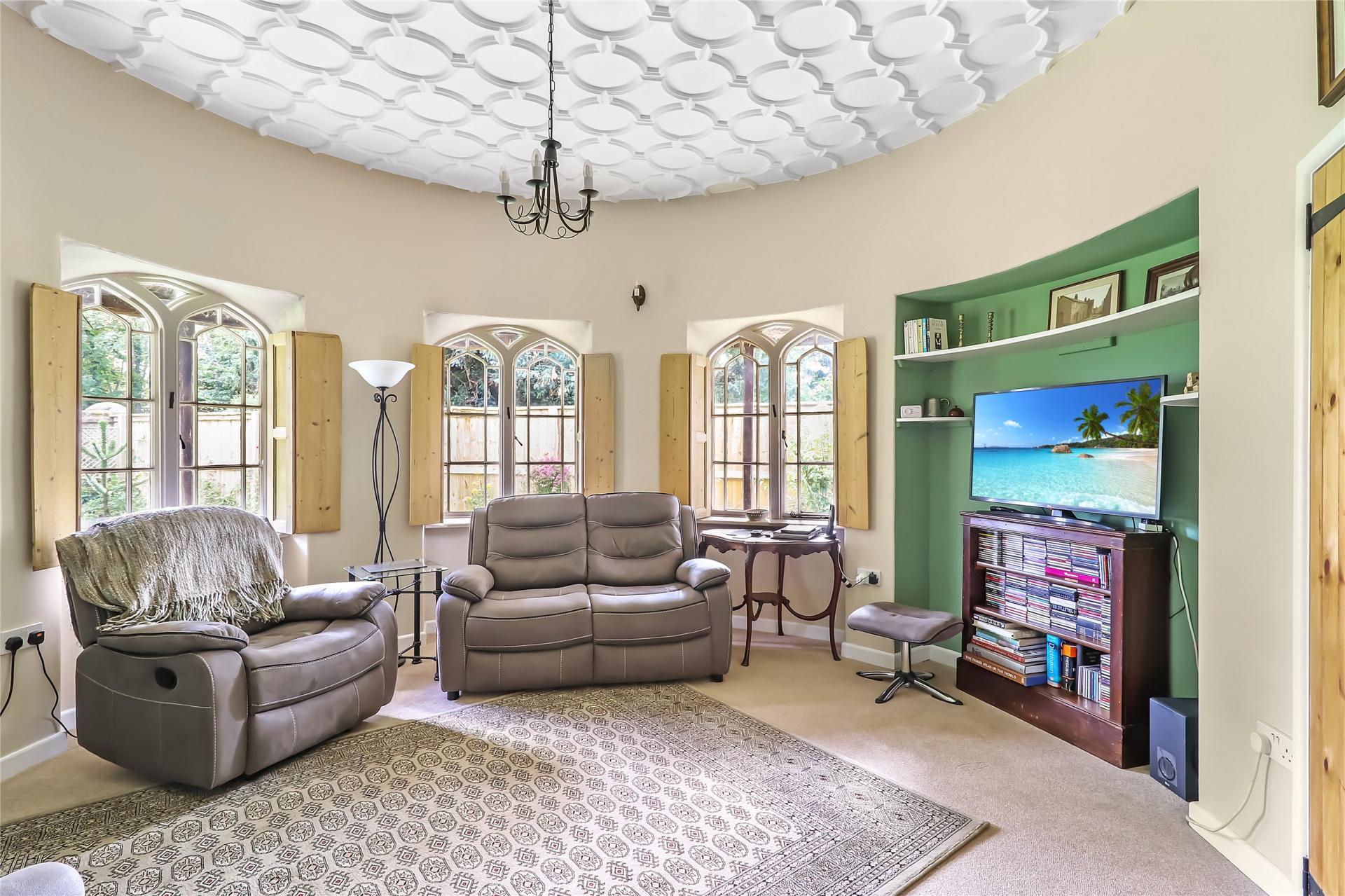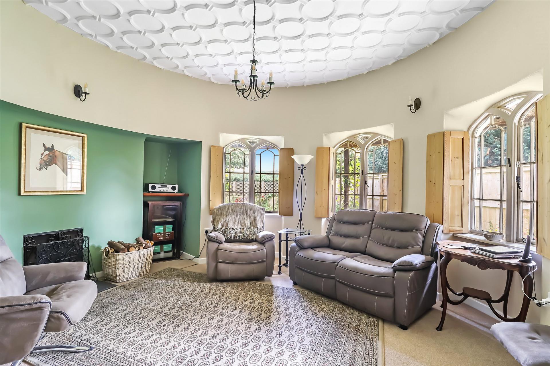Sitting room A most interesting circular room overlooking the gardens through three windows with shutters, ornate plaster ceiling, open fireplace with slate hearth, vertical radiator and fitted carpet.