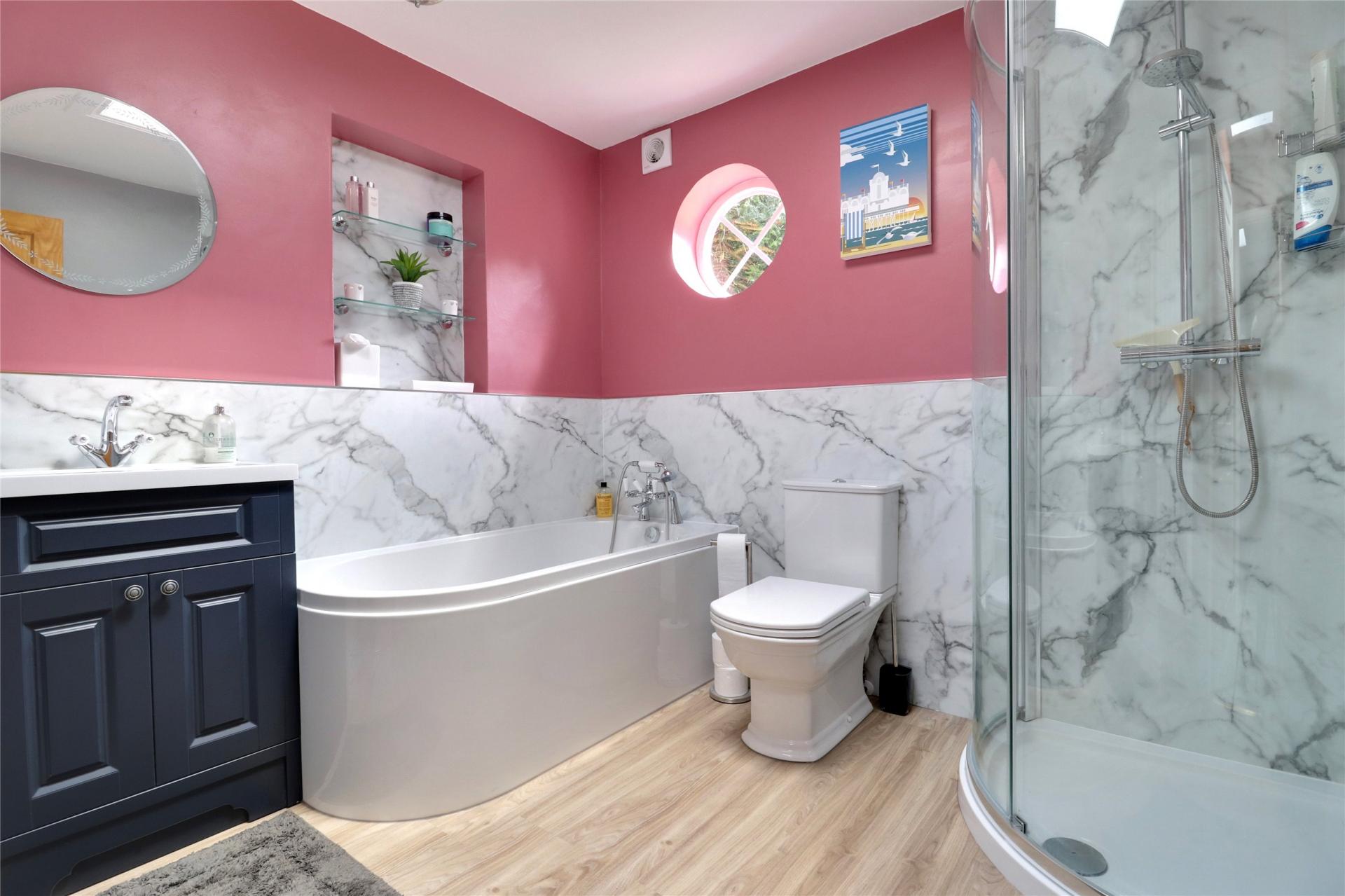 Bathroom Beautifully finished with a four piece white and chrome suite comprising; low level W.C, vanity wash basin, bath with mixer tap and hand shower, corner shower enclosure, feature porthole window, roof light, shelved recess, vertical radiator and vinyl flooring.