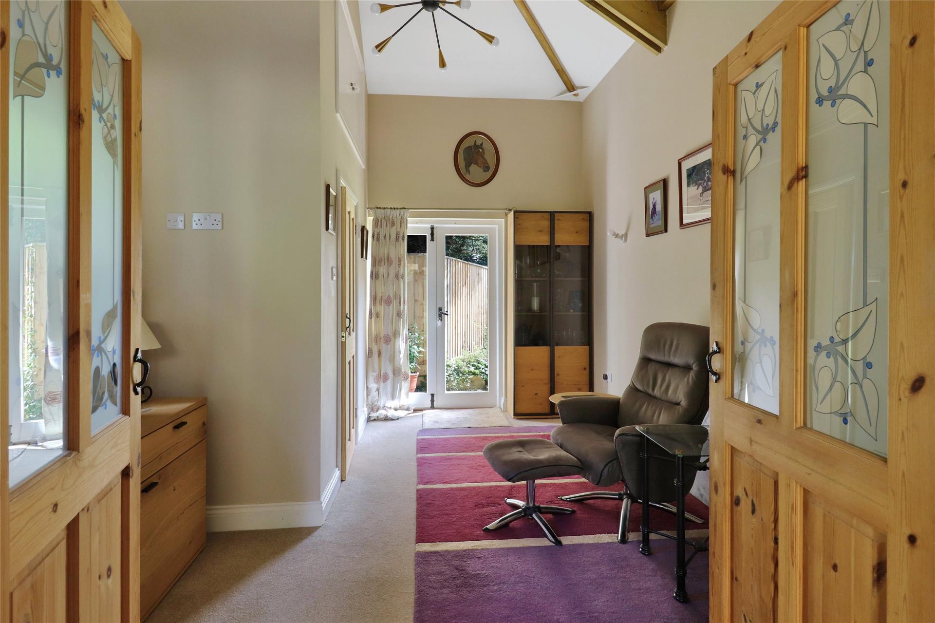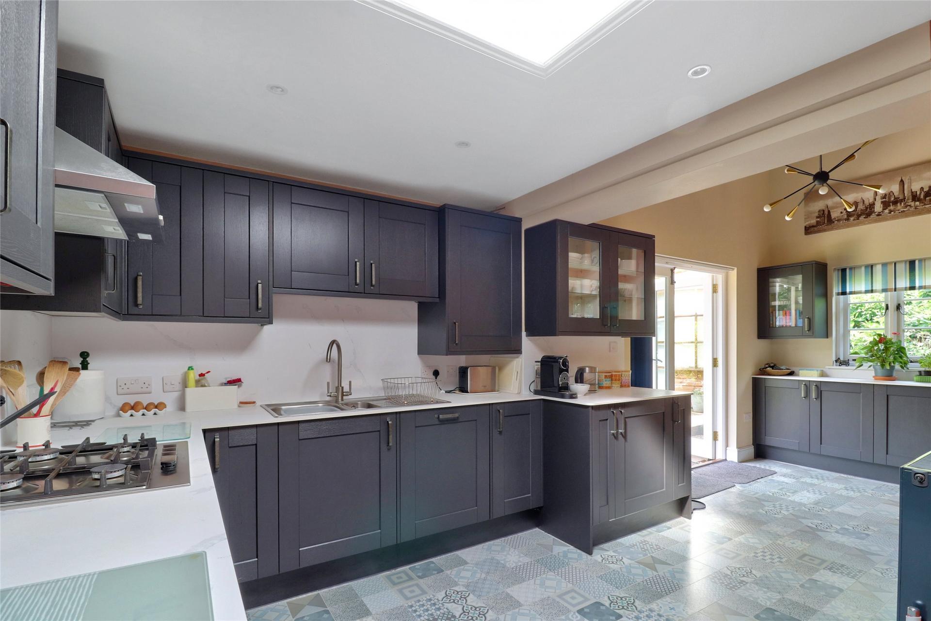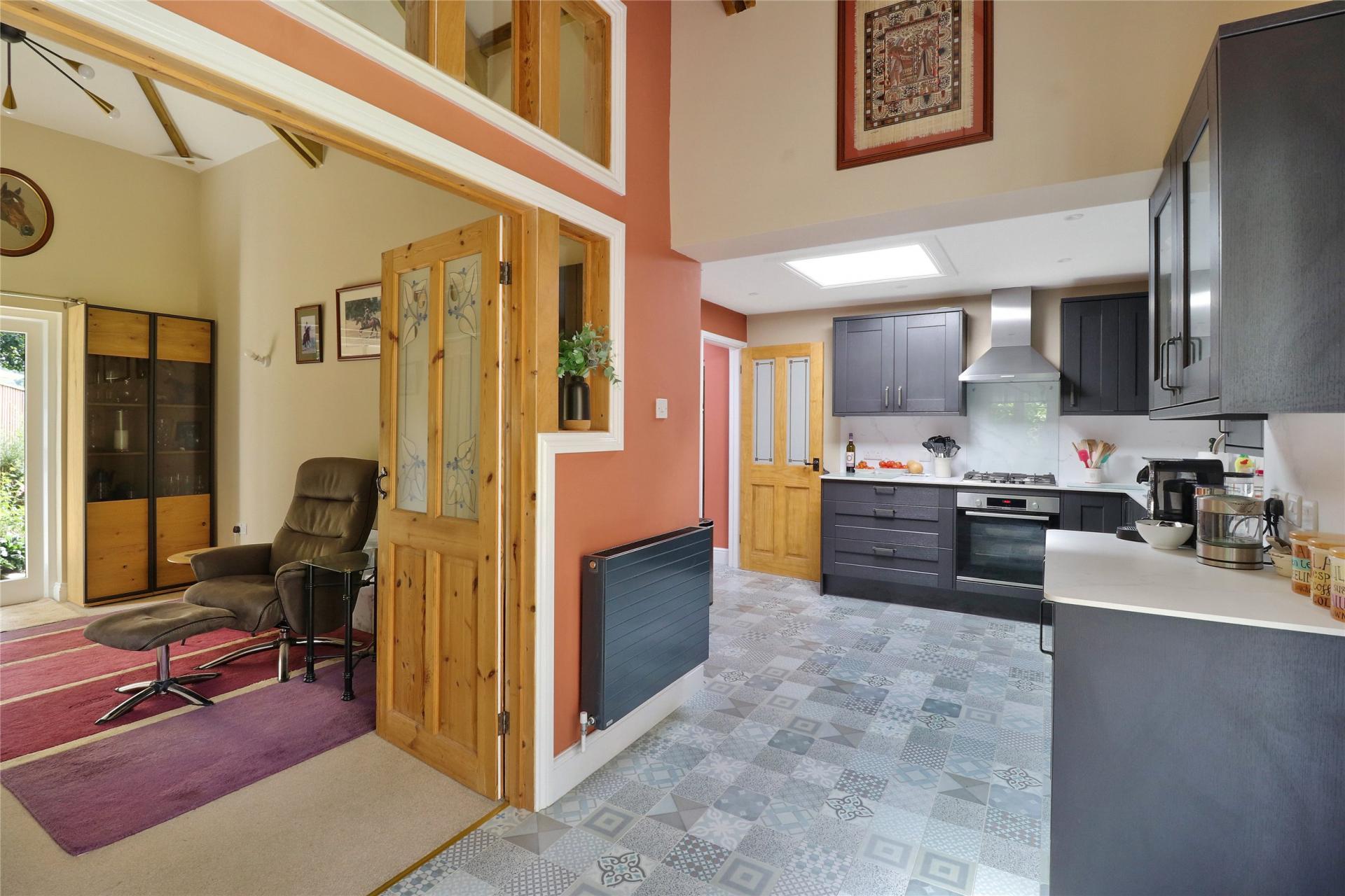 Fitted Kitchen/breakfast Room A double aspect room with double doors to outside and beautifully finished with a modern range of base and wall units with composite working surfaces and upstands, stainless steel single drainer sink unit with mixer tap, integrated appliances to include LPG hob, oven, fridge and dishwasher, stainless steel extractor hood with glass splashback, built in walk in double fronted cupboard, concealed LPG boiler heating the central heating and hot water, radiator, recessed spotlights, laminate flooring, part vaulted ceiling and roof light.
