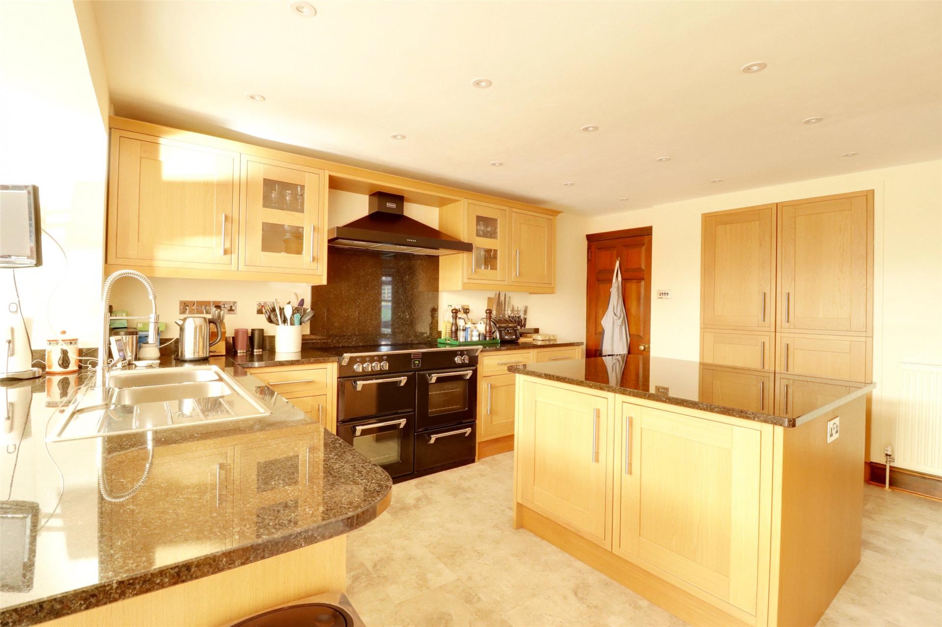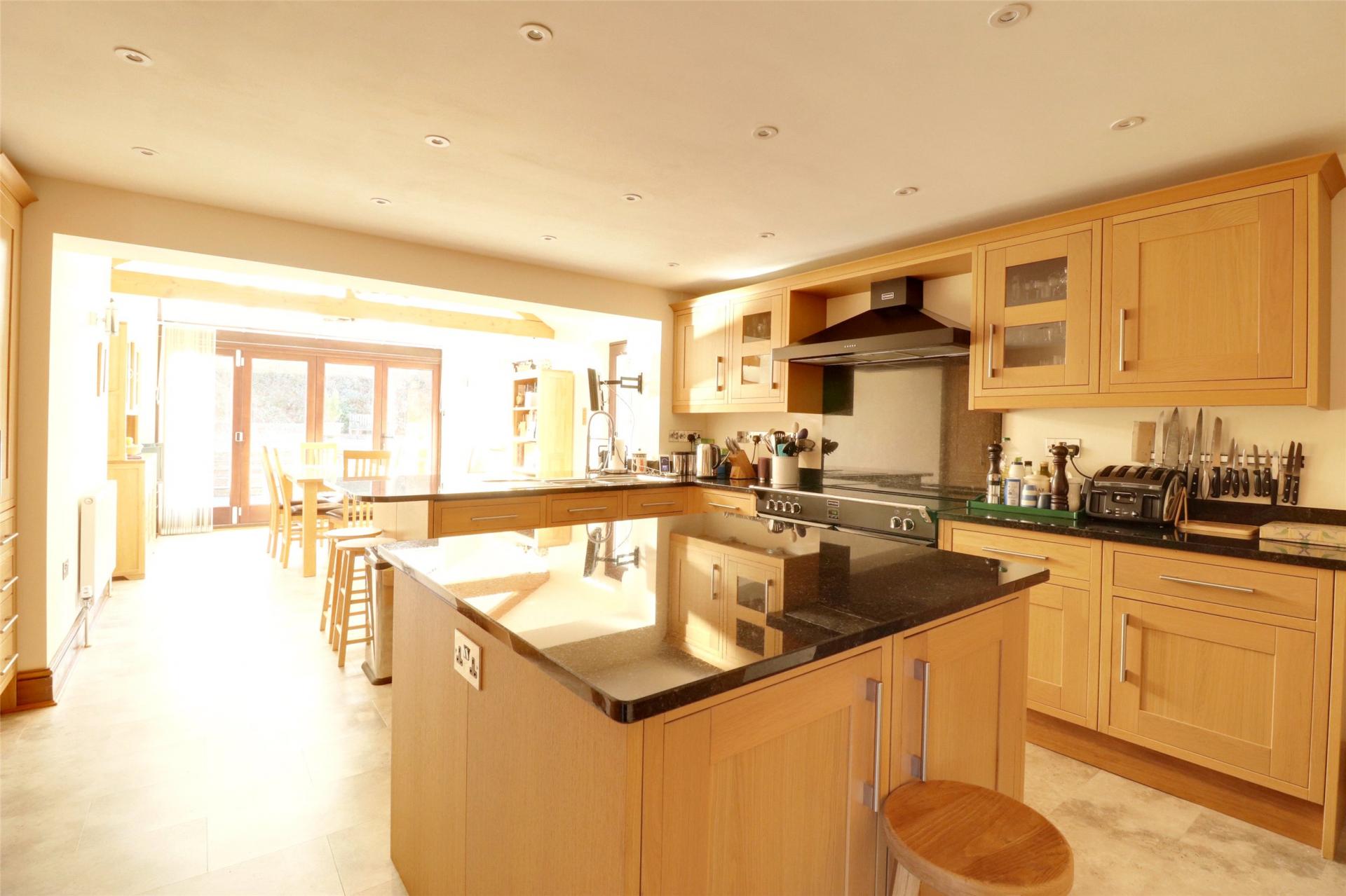 Superb Open Plan Kitchen/Breakfast Room. Extensively and comprehensively fitted with kitchen units. Comprising wall and base units, larder units, peninsular work surface and central island with storage under. Two recessed upright fridge units. Polished work surfaces, concealed under unit lighting, concealed display lighting, double bowl single drainer sink unit, “Stoves” range cooker with 5 ringed hob with ovens and grills under, fume canopy above. Double radiator, extensive supply of recessed halogen down lights. Breakfast end double aspect with full length glazed door to garden and folding full length glazed doors to gardens and patio at side. Vaulted ceiling with timbers, 2 double radiators.