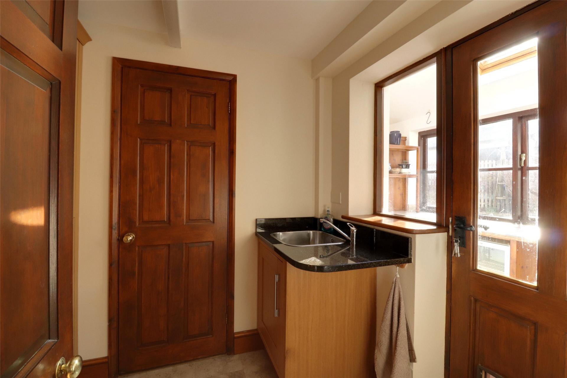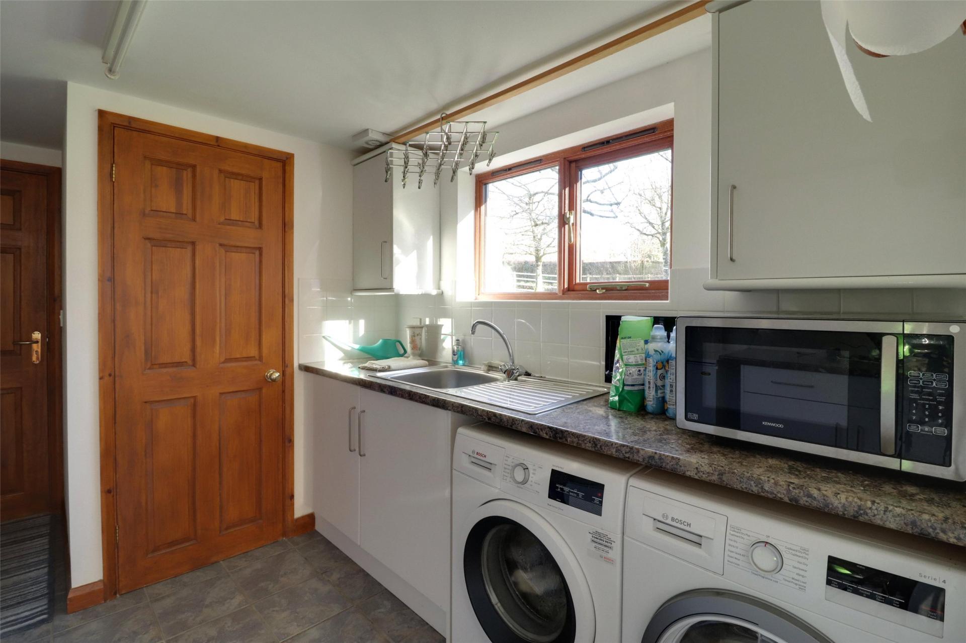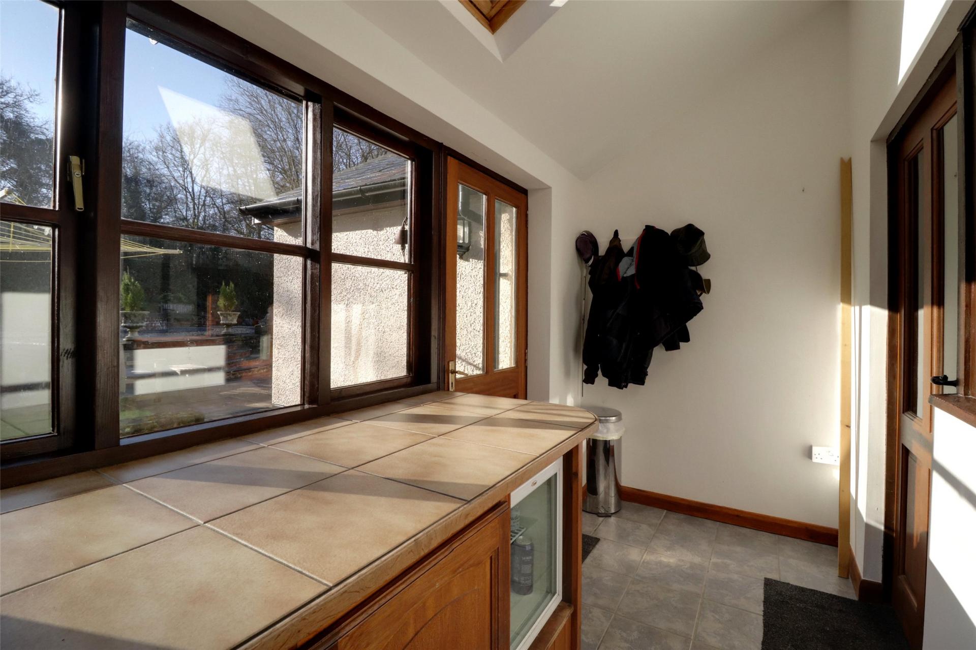 “L” Shaped Side Lobby and Utility Area. Tiled floor, window to front and side elevations, work surfaces and storage units/cupboards. Door to side, door to reception hall, door to small porch/lobby. Oil fired Grant boiler for domestic hot water and heating, single drainer sink unit, storage and plumbing for washing machines.