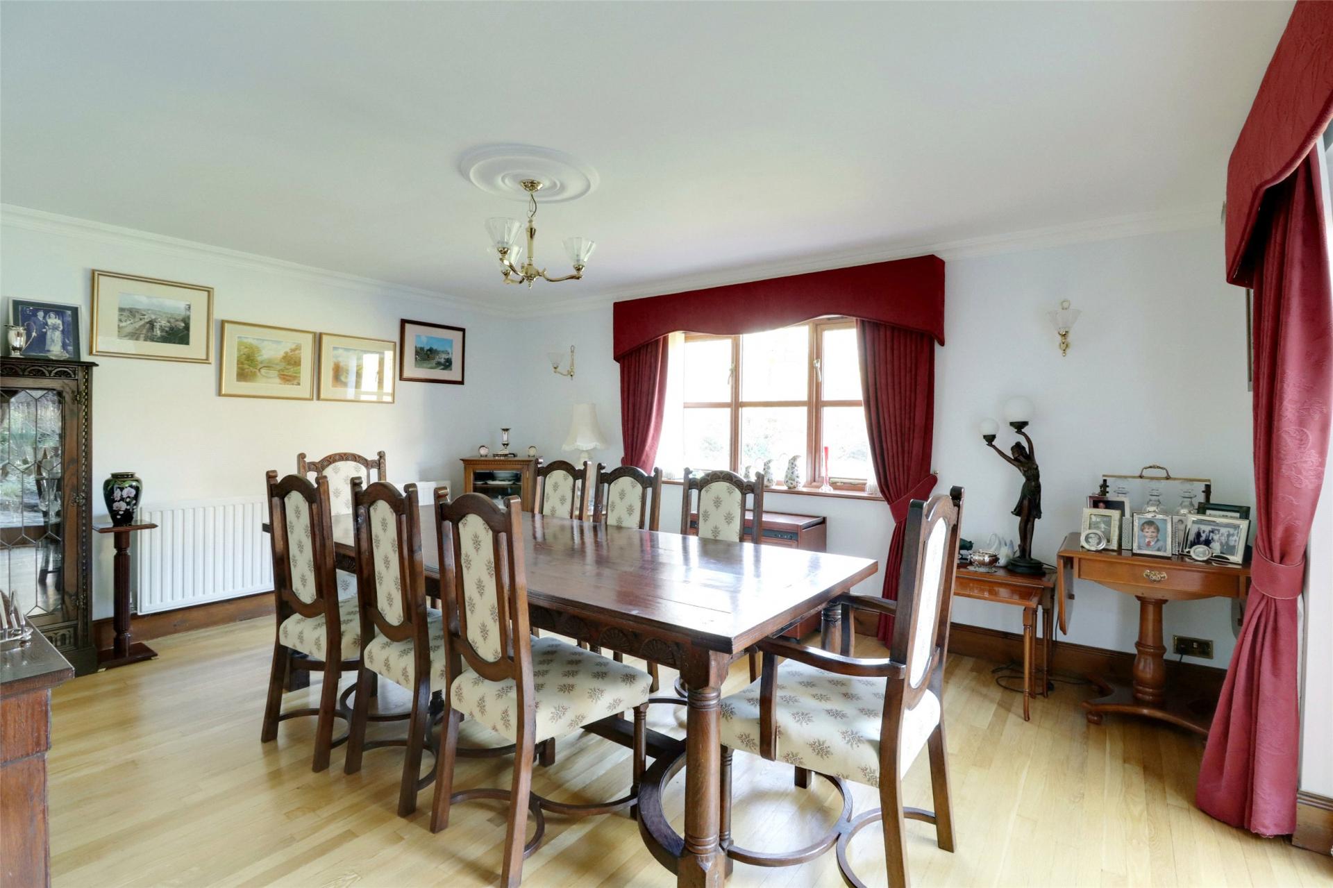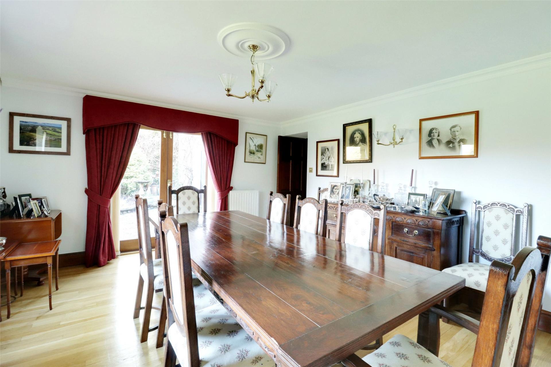 Dining Room. Double aspect with window to rear overlooking gardens and grounds, double full length glazed doors to patio and gardens, timber flooring and 2 double radiators.