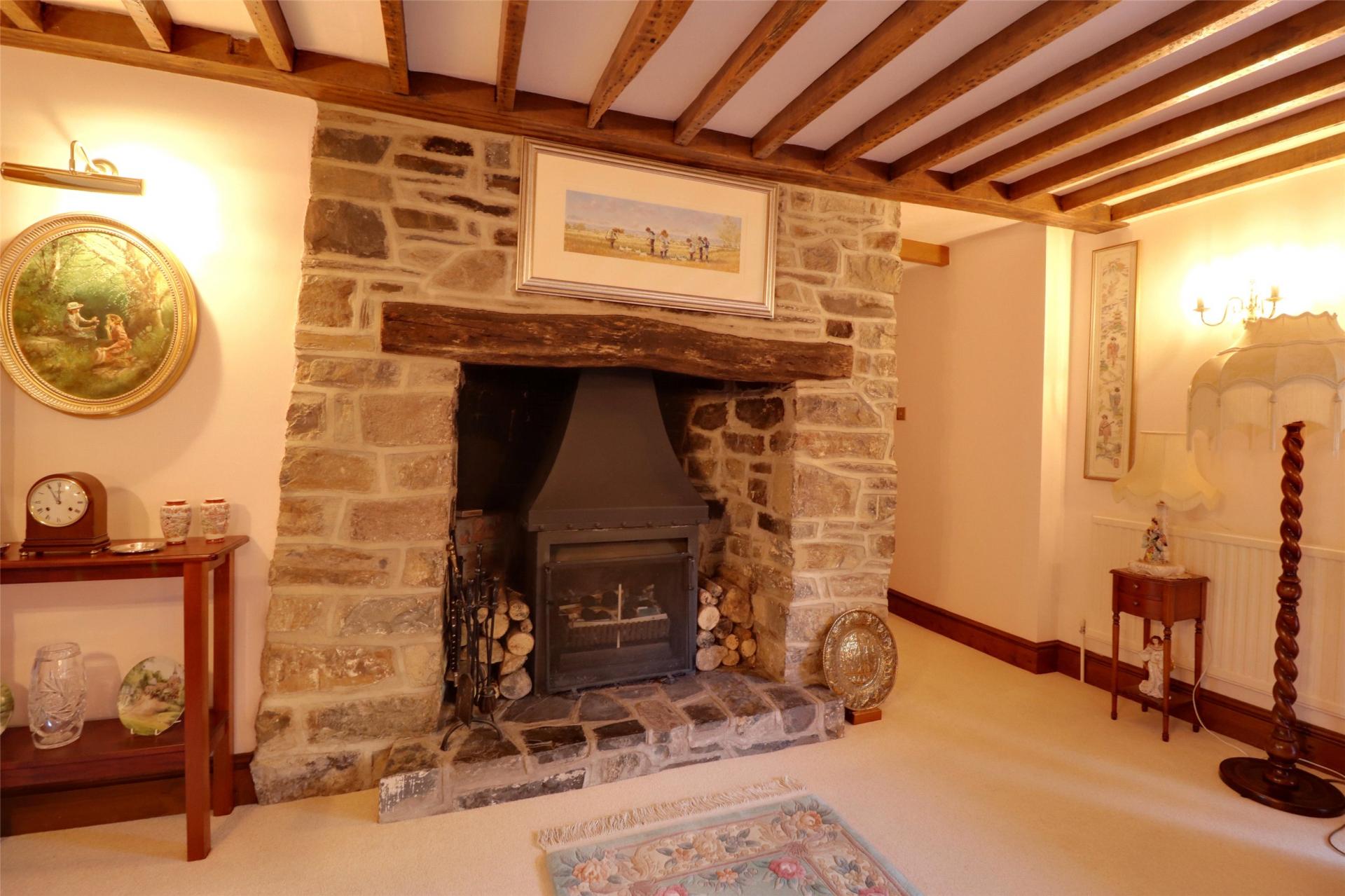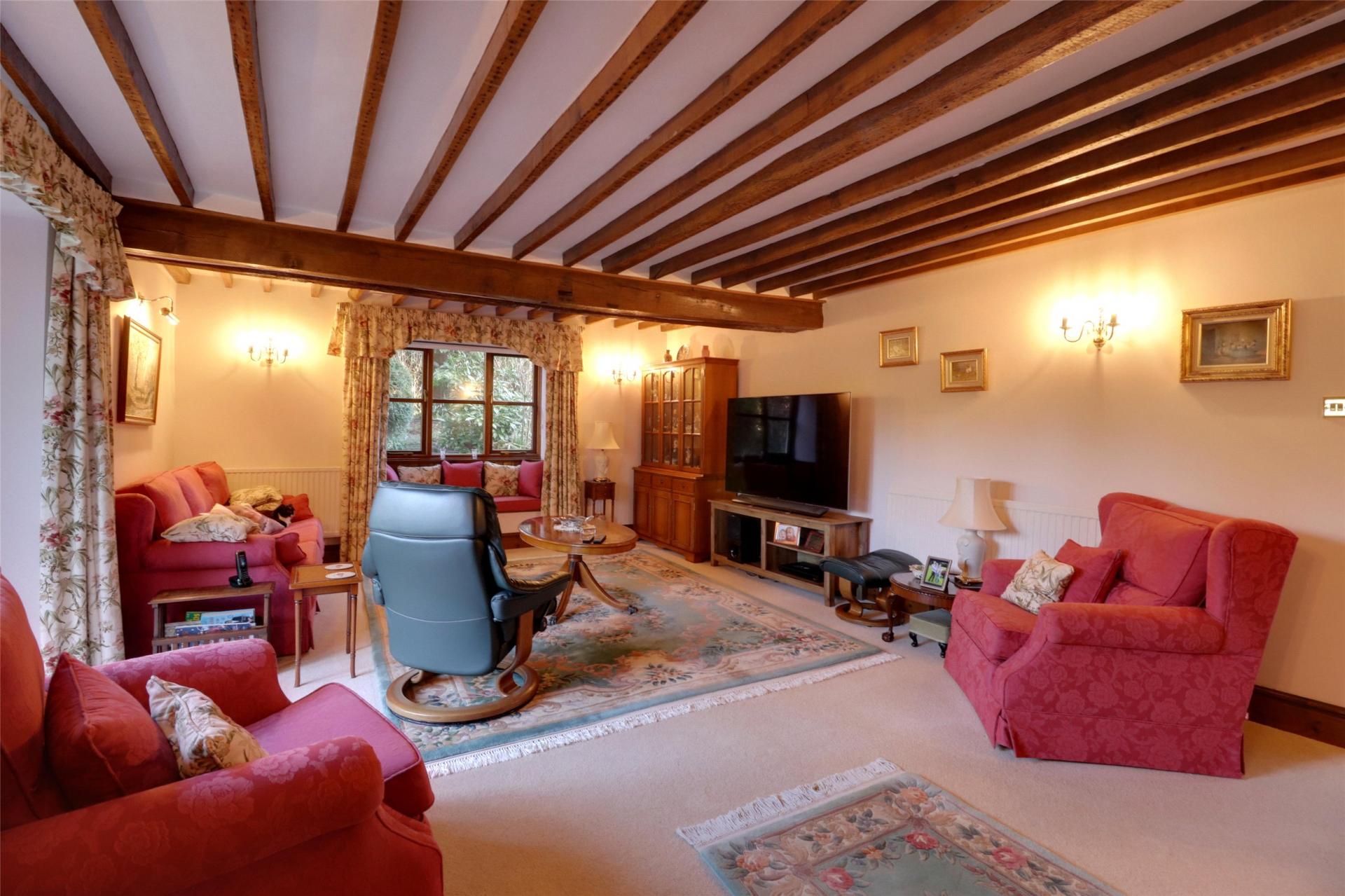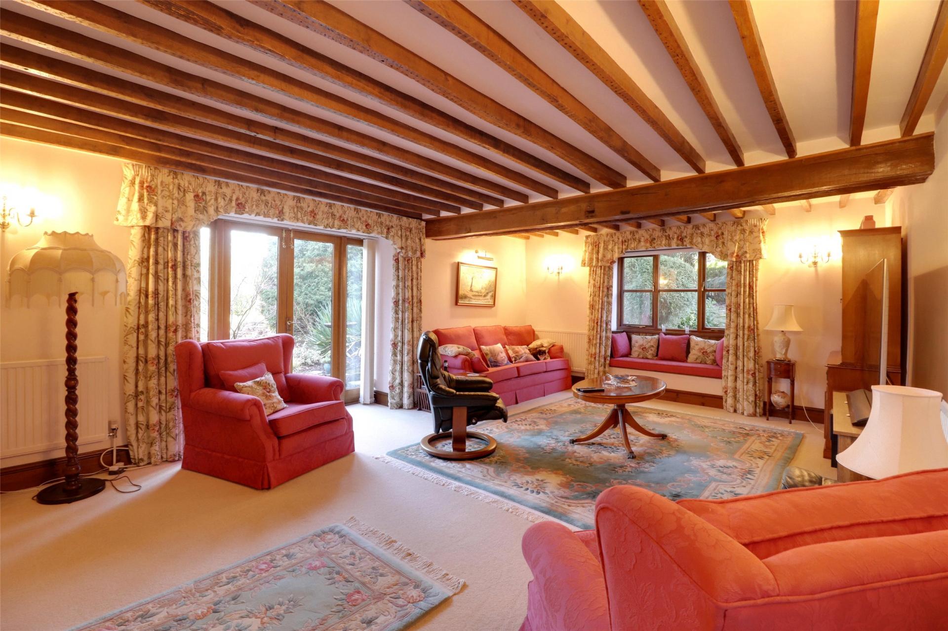 Living Room. Double aspect with window to side elevation (with window seat), feature full length glazed patio doors with windows at either side to patio and gardens, pointed stone fireplace with beam over, raised hearth with inset wood burning grate and canopy over. Beamed and timbered ceiling, 2 double and 2 single radiators.