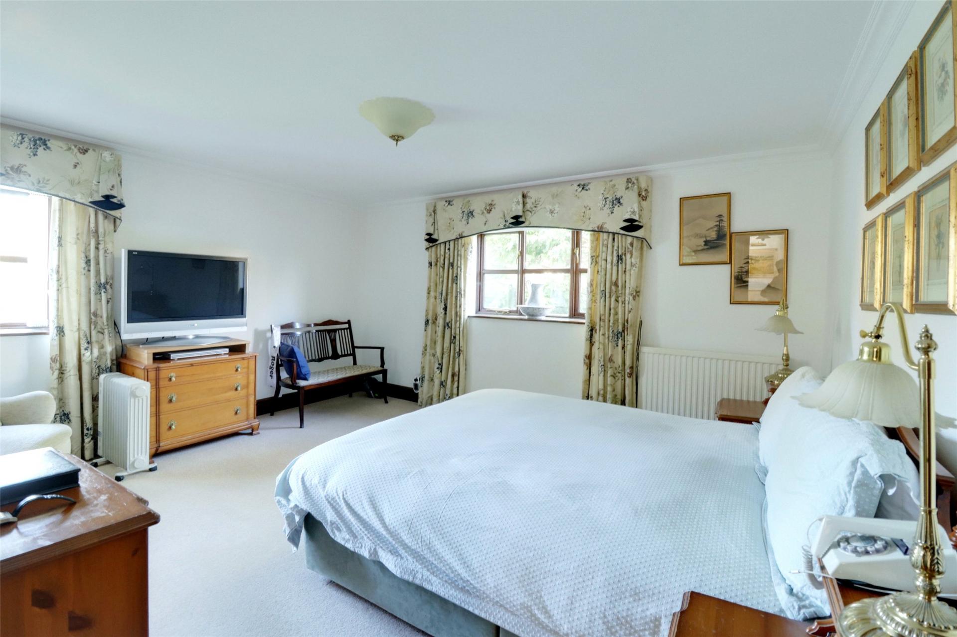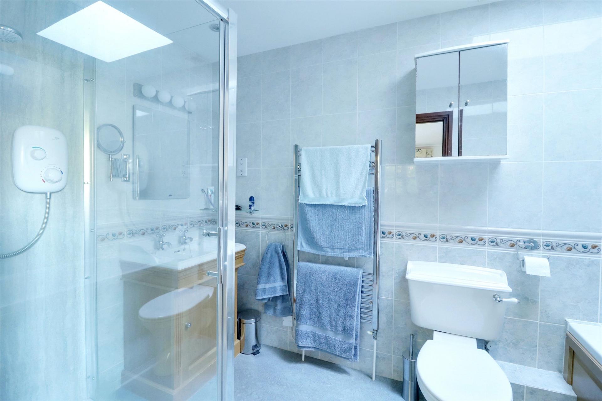 Principle Bedroom Suite. A double aspect bedroom with windows to side and rear, double and single radiator. Fully tiled En-suite Bathroom with bath, shower cubicle, W.C., wash hand basin, heated towel rail, sky light.