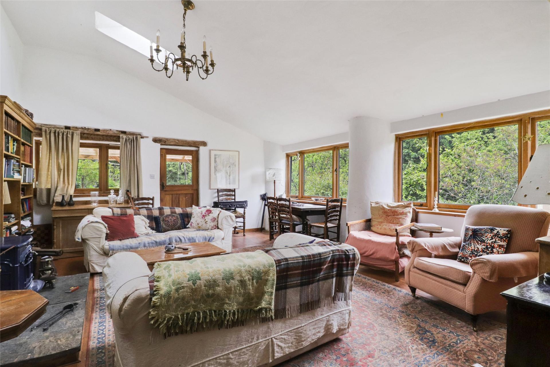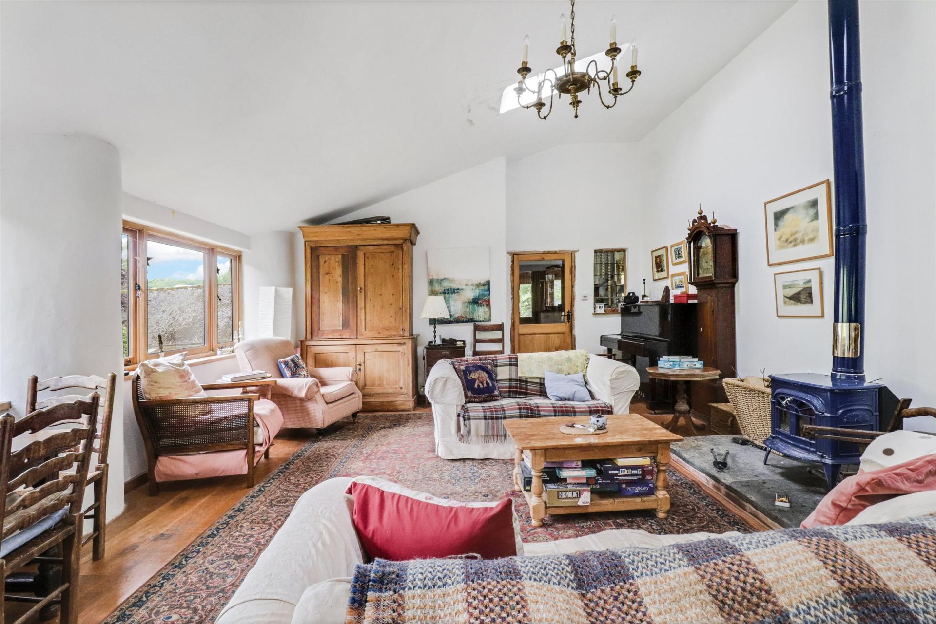 Arranged over two floors and split levels the accommodation in brief comprises; reception hall with exposed wide elm floorboards, cloakroom fitted with a two piece white suite, tiled floor and staying on this level there is a double bedroom with en-suite bathroom and shower over the bath and a study/fifth bedroom. A hallway leads off the hall where there is a pantry and steps down to an inner hall with exposed floor boards off which is an enclosed porch with door to outside, a utility/boiler room with Belfast sink, tiled topped surface and plumbing for washing machine. A super double aspect drawing room with vaulted ceiling, woodburner on a slate hearth, exposed timber flooring and stable door opens onto veranda and gardens.