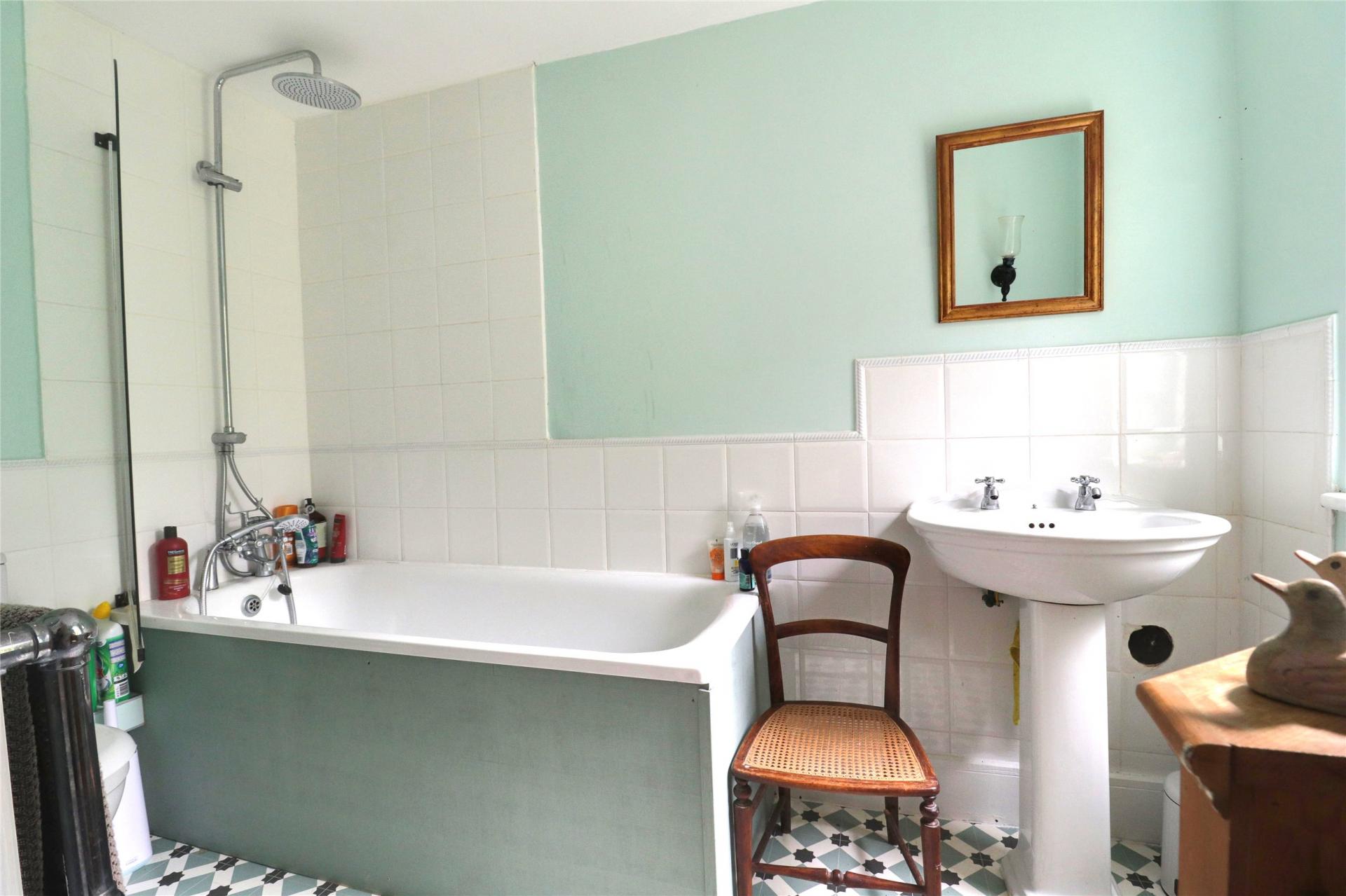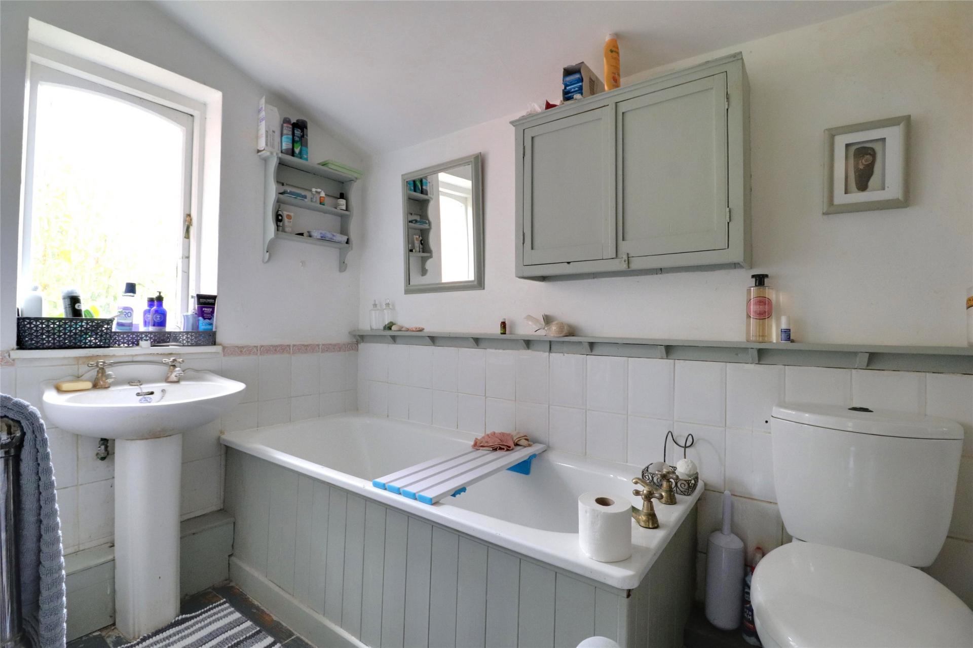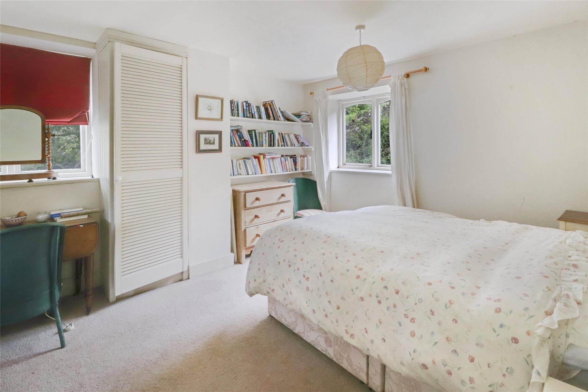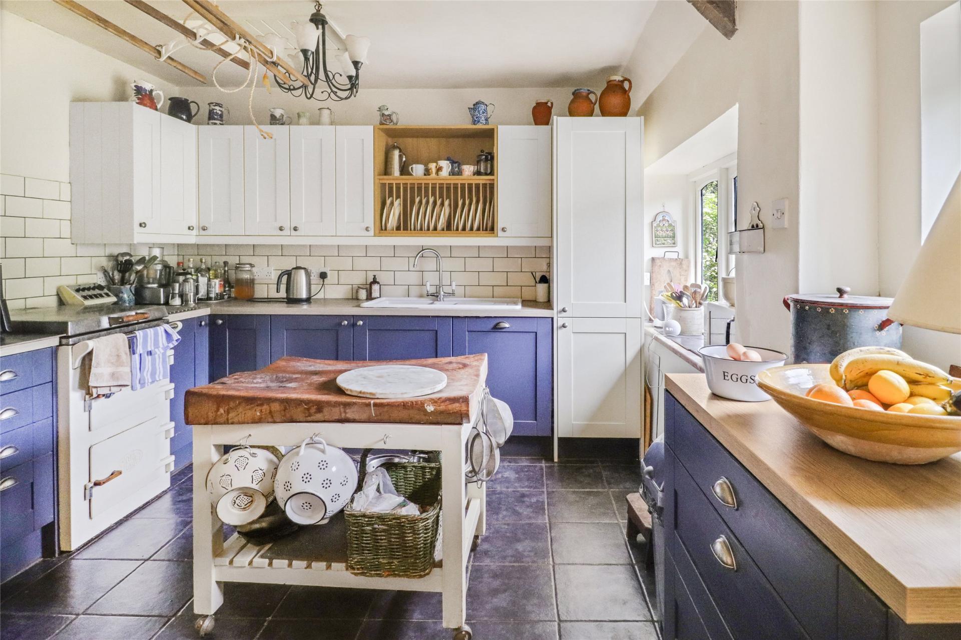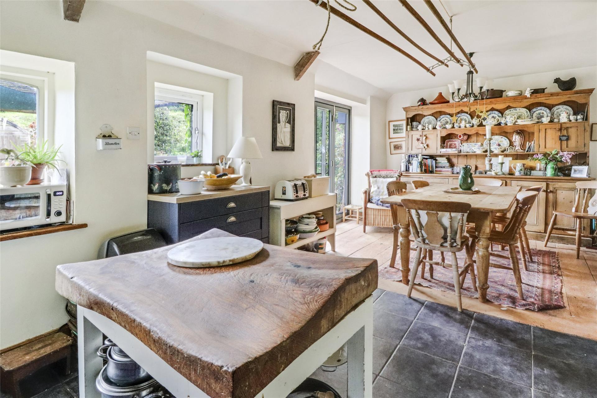 A short flight of stairs from the reception hall leads up to a higher ground floor level hallway off which is a double aspect sitting room with woodburner and exposed timber flooring, a kitchen/dining room with bi fold doors to garden and fitted with a range of base and wall units with square edge working surfaces, one and a half bowl single drainer sink unit with mixer tap, larder cupboard, pine dresser Everhot cooker, tall larder fridge and dishwasher. To complete the accommodation on this floor there is a principal double aspect bedroom with a range of fitted bedroom furniture and an en-suite bathroom with separate shower.