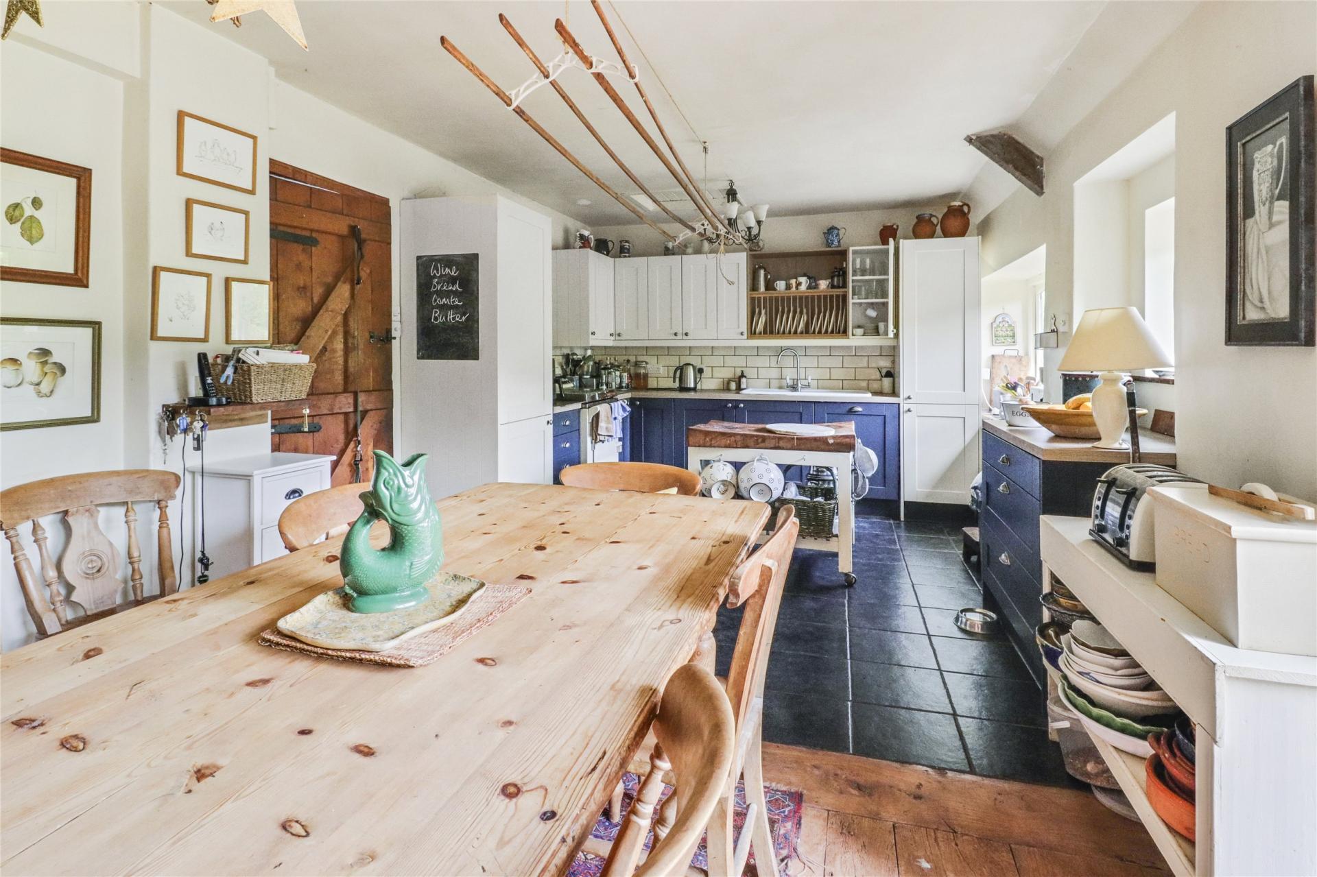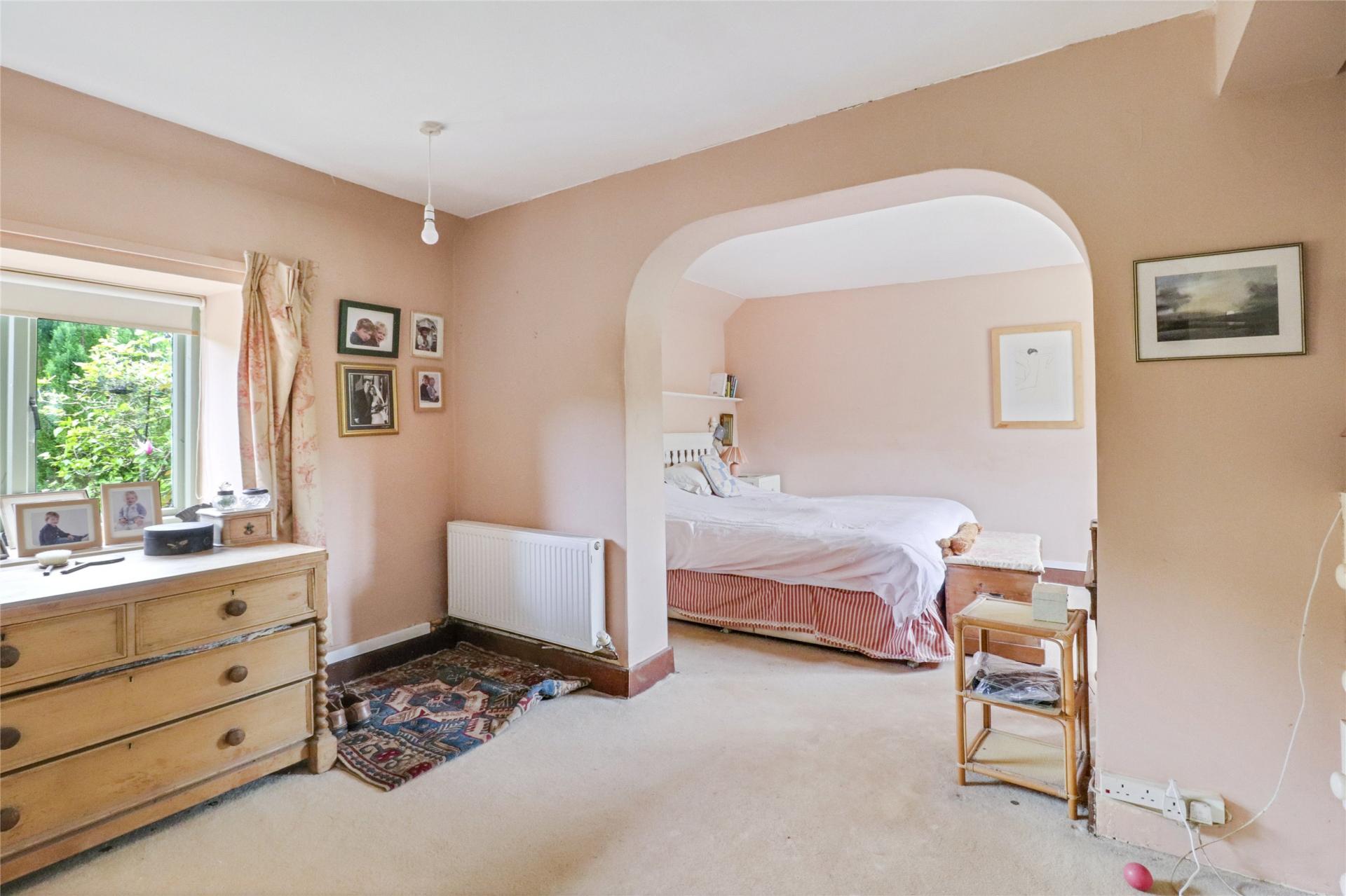 A short flight of stairs from the reception hall leads up to a higher ground floor level hallway off which is a double aspect sitting room with woodburner and exposed timber flooring, a kitchen/dining room with bi fold doors to garden and fitted with a range of base and wall units with square edge working surfaces, one and a half bowl single drainer sink unit with mixer tap, larder cupboard, pine dresser Everhot cooker, tall larder fridge and dishwasher. To complete the accommodation on this floor there is a principal double aspect bedroom with a range of fitted bedroom furniture and an en-suite bathroom with separate shower.