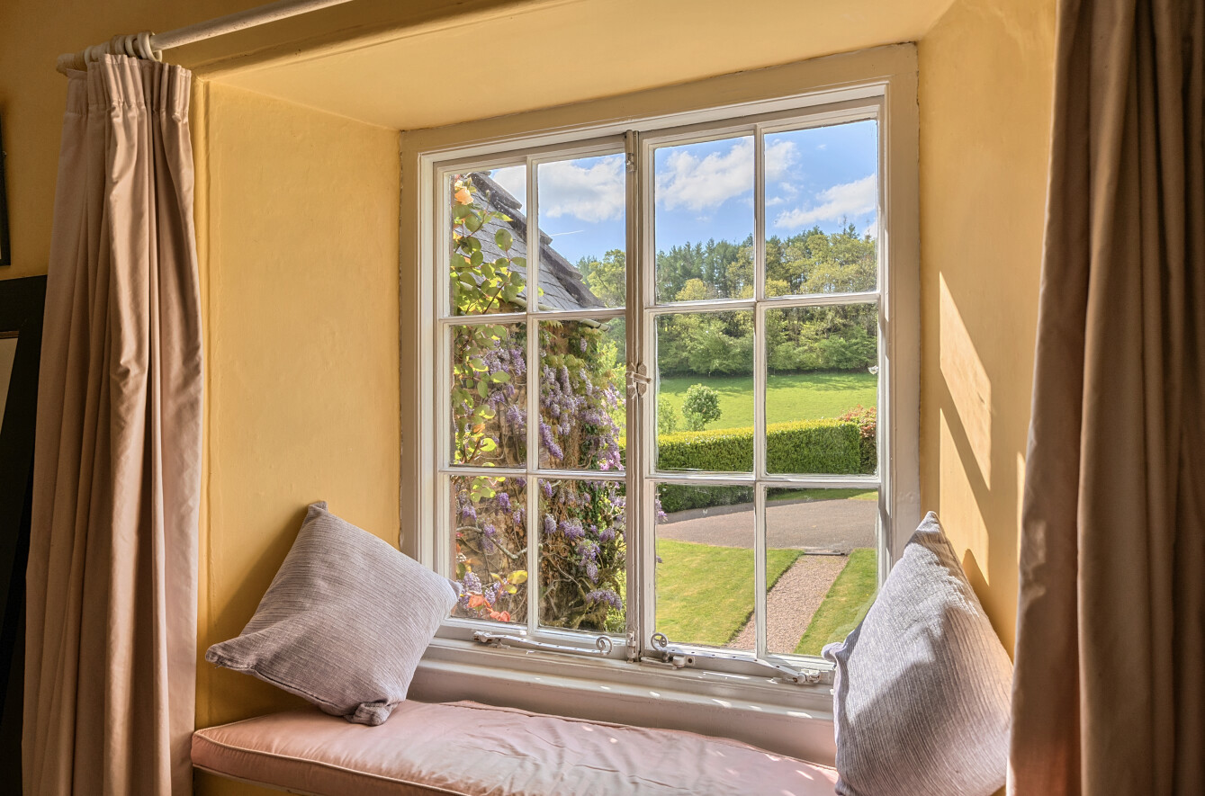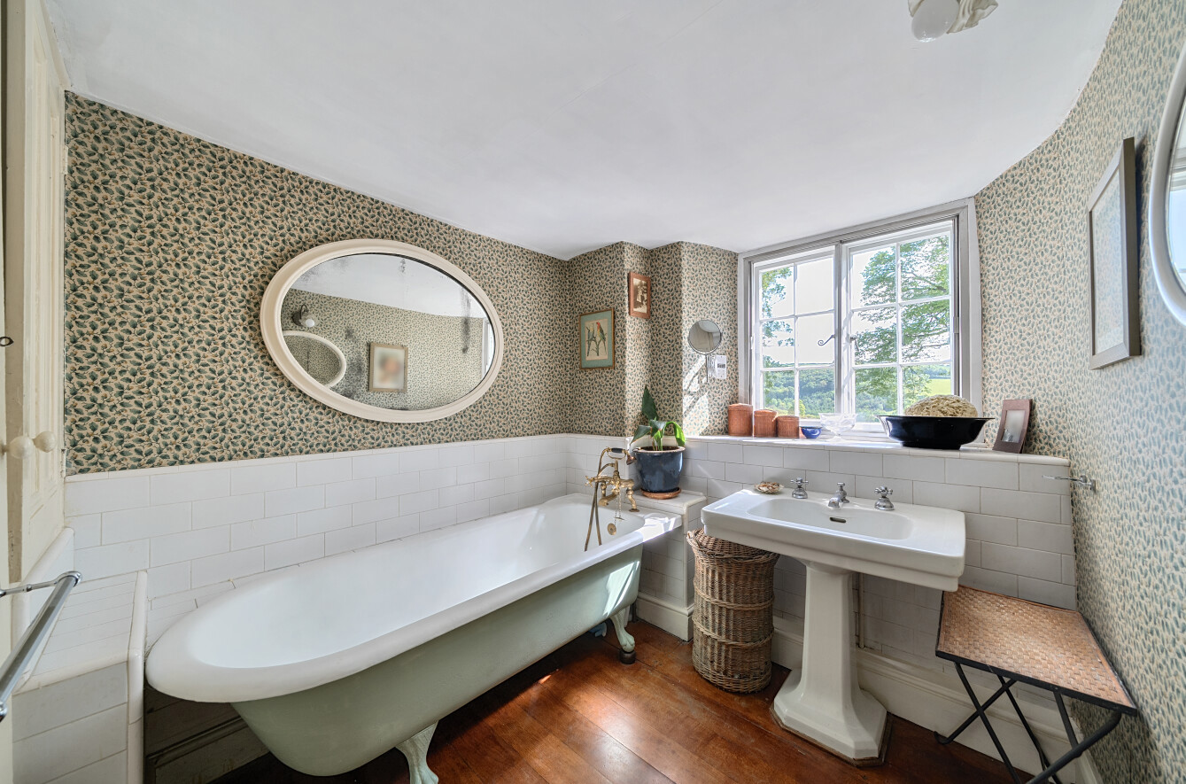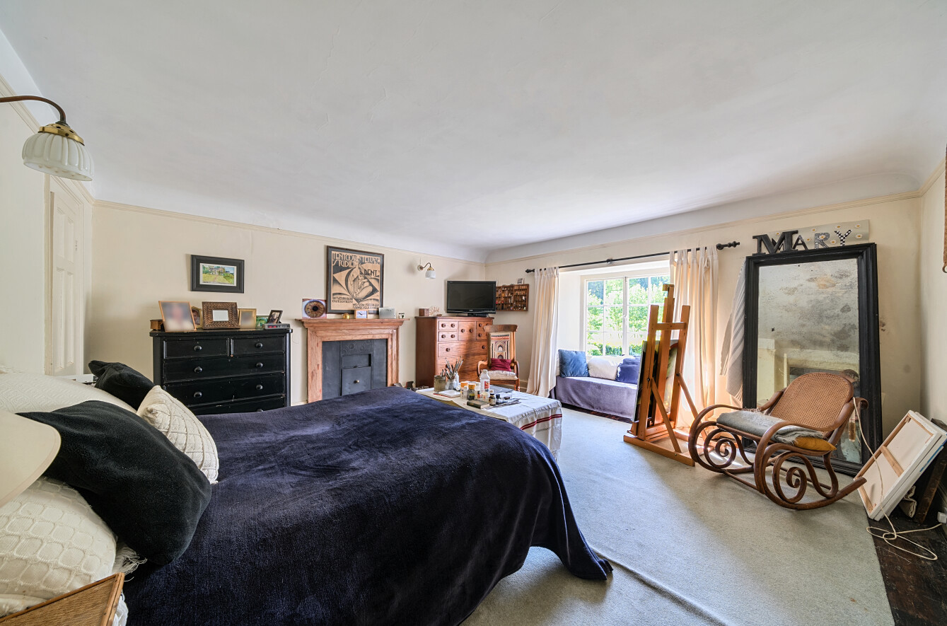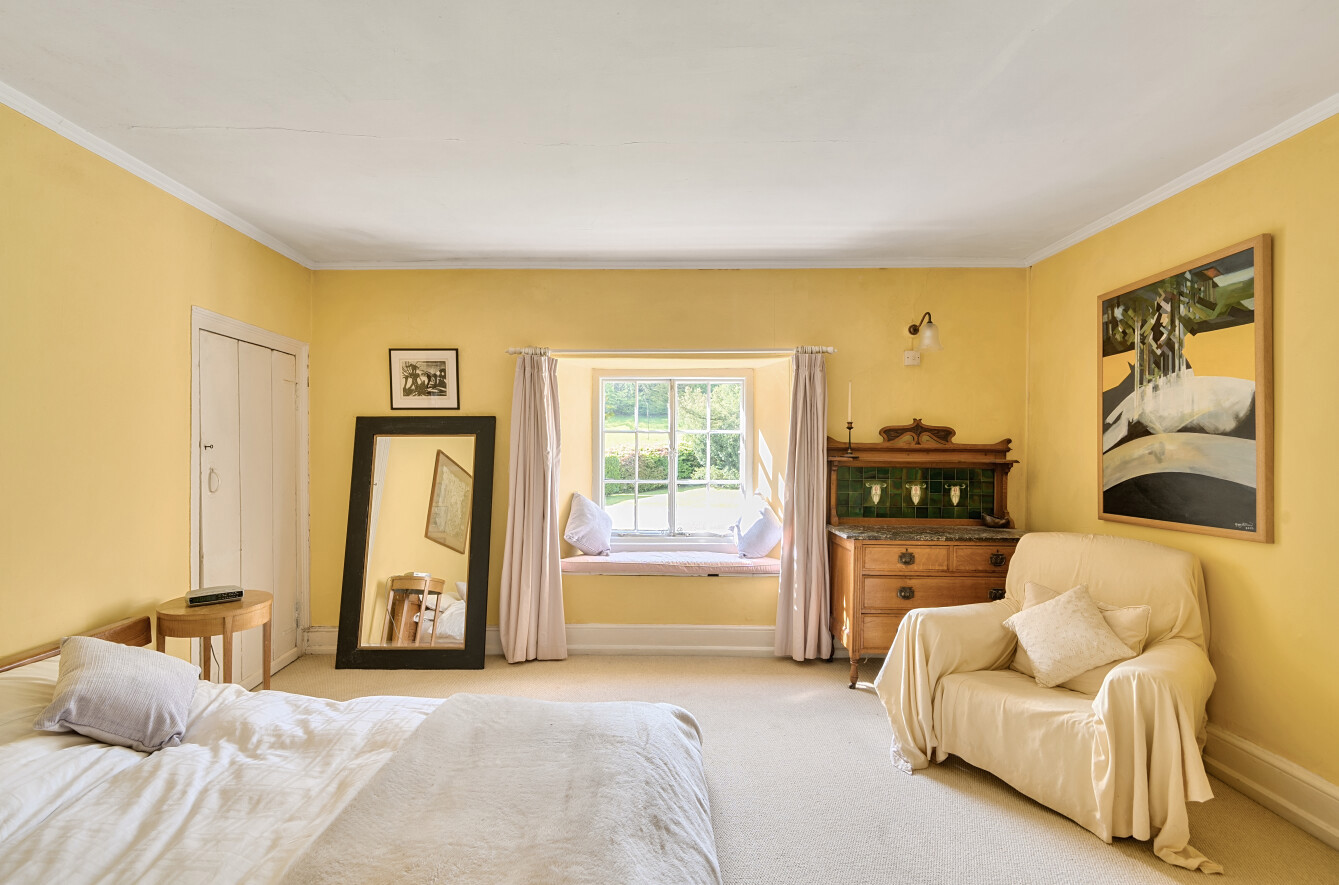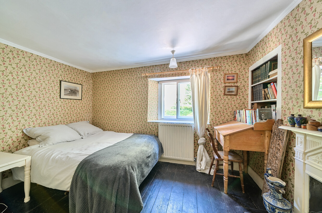 On the first floor, the landing divides the bedrooms into two wings. To the west side are two generous double bedrooms, both featuring charming character details and delightful views over the private drive and gardens.