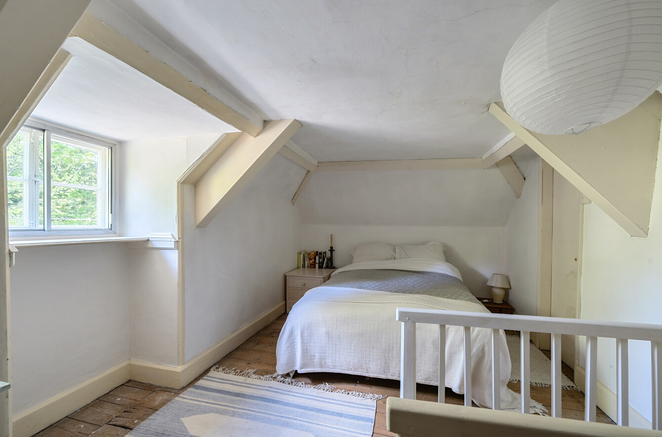 Continuing along the east wing, steps lead to an additional bedroom, ideal for guests or older children, as well as useful loft storage.