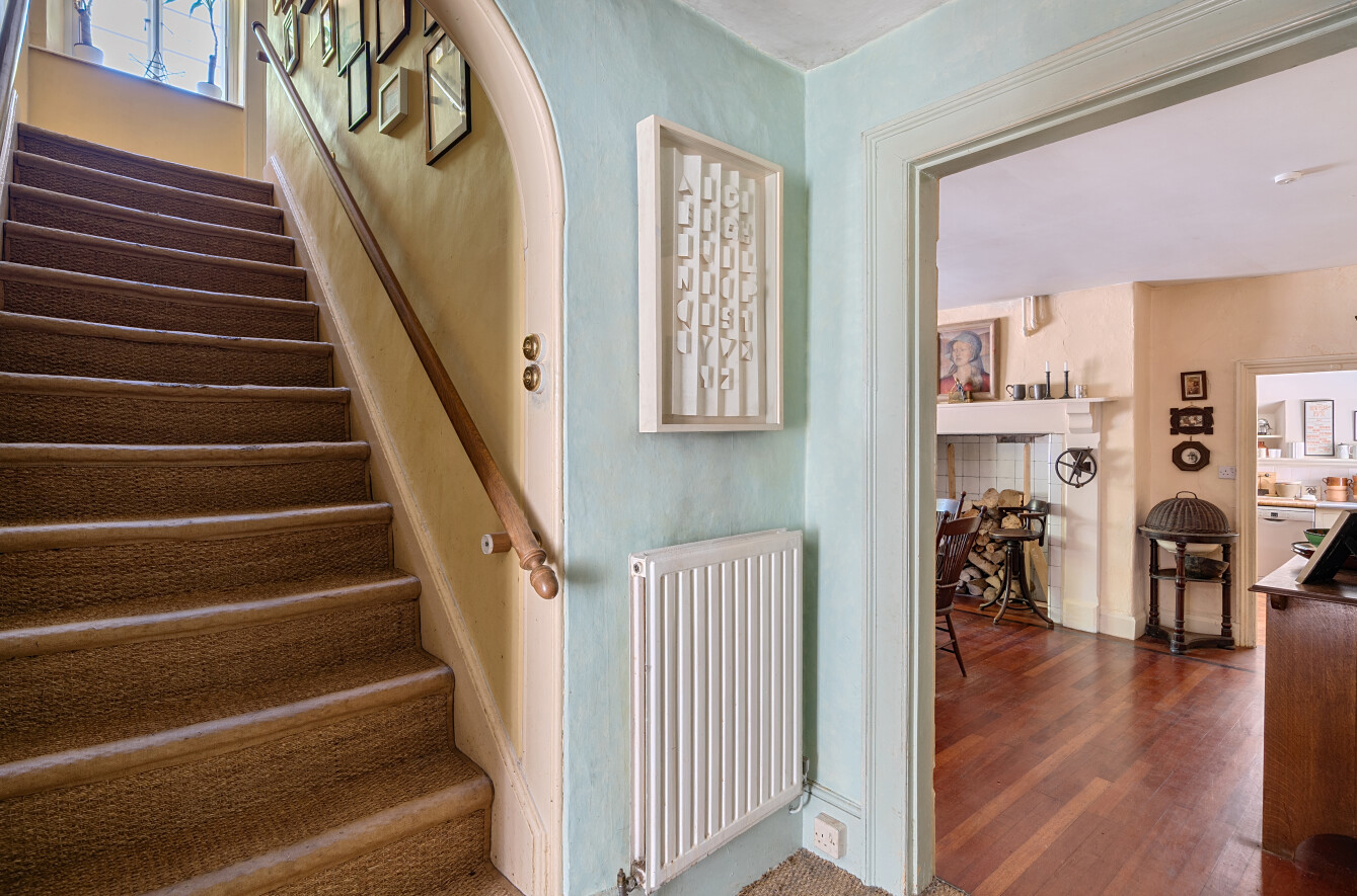 The farmhouse-style kitchen is thoughtfully fitted with ample units and work surfaces, combining rustic charm with modern practicality. A door leads to the rear corridor, which houses a Butler’s sink and provides convenient access back to the entrance hall.