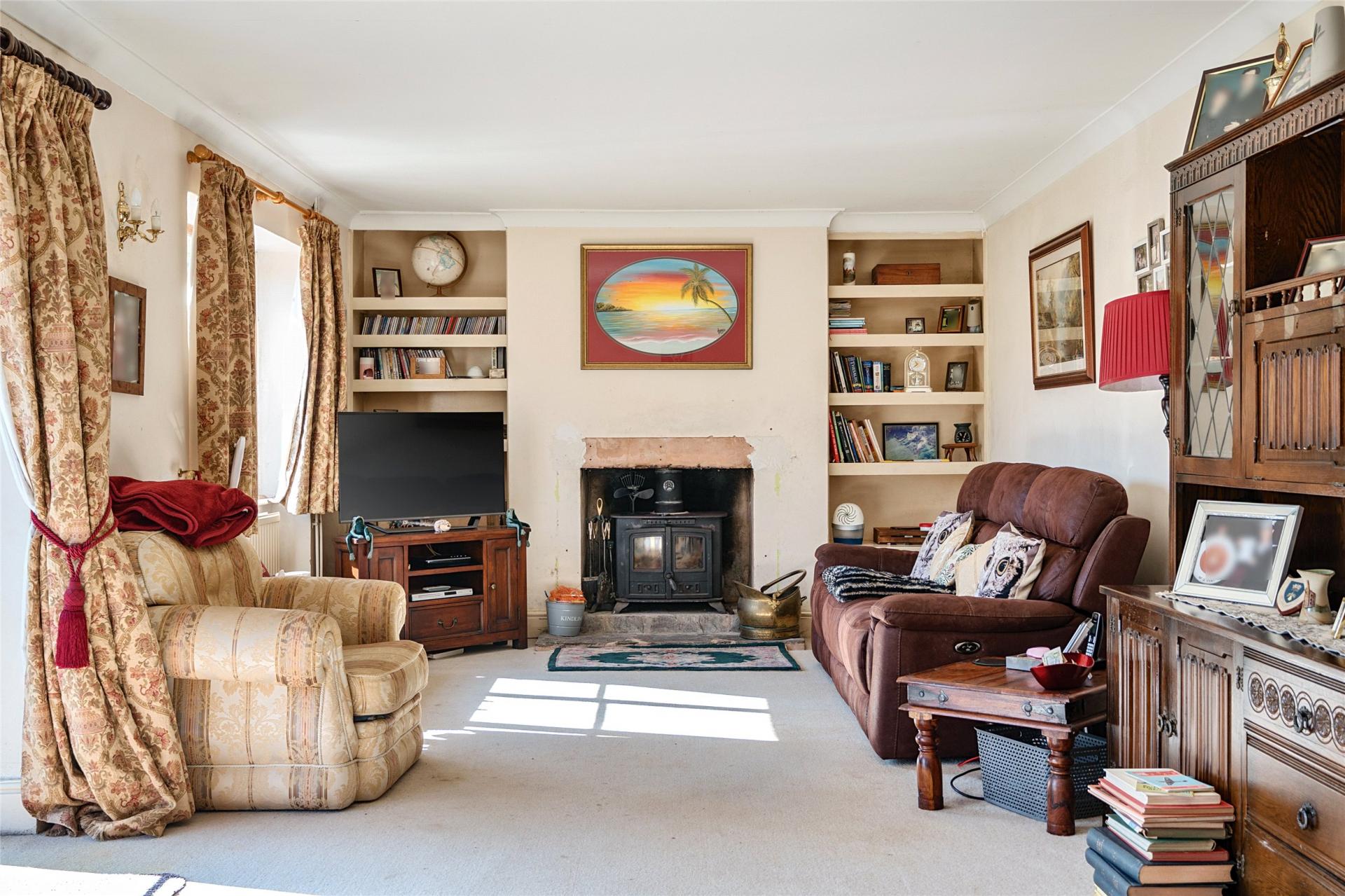 Continuing on the ground floor, there is a useful study/office, a separate dining room, and a downstairs cloakroom. The sitting room is a particular highlight, featuring an inset woodburning stove and doors opening directly onto the patio and gardens.