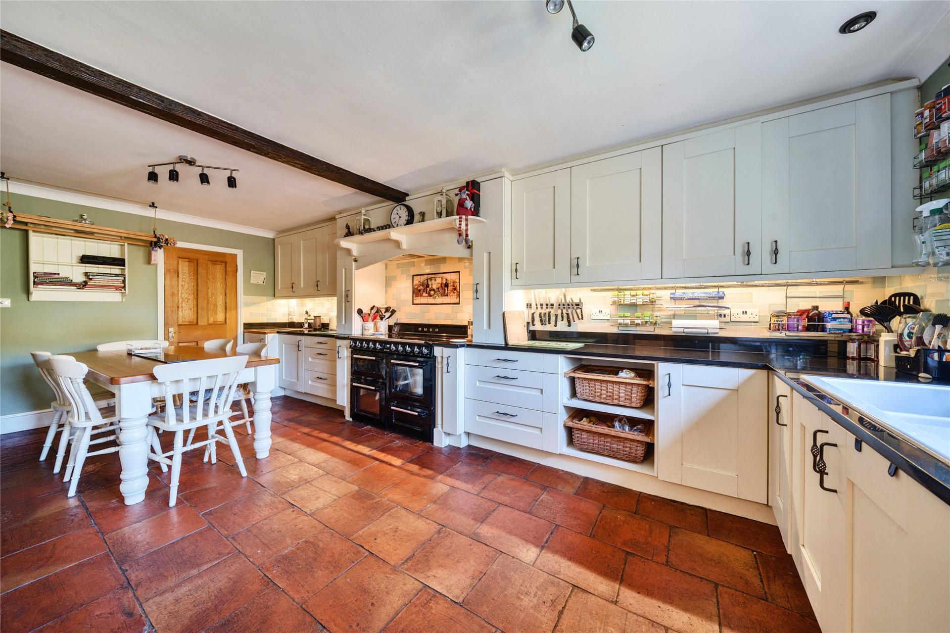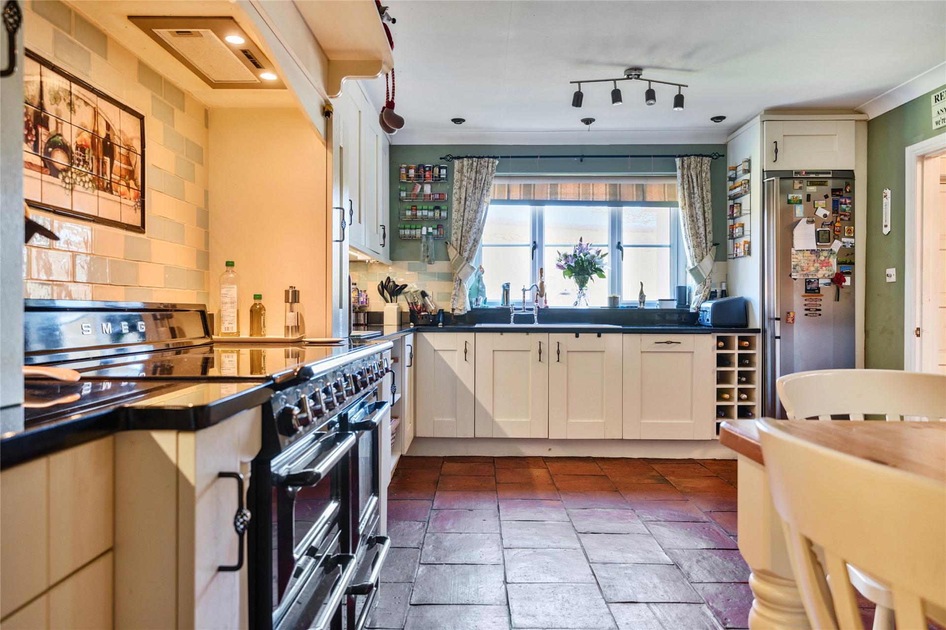 The farmhouse kitchen is fitted with a range of wall and base units and integral appliances, and is complemented by a separate pantry and utility room.