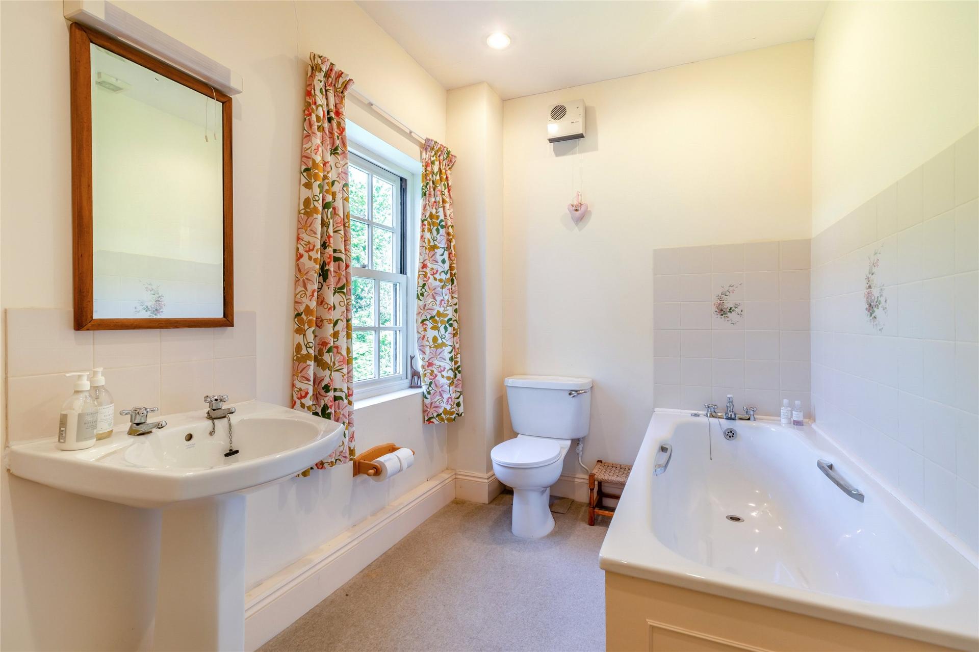The thoughtfully designed, dual-aspect kitchen is ideal for both keen cooks and relaxed family life, featuring extensive cabinetry, generous work surfaces, an electric AGA, a gas hob, and an eye-level double oven. This space opens to a cosy yet spacious family room, perfect for informal dining or lounging, enhanced by French doors to the terrace and a fireplace inset with a wood-burning stove. A large utility/boot room, fitted with additional storage units, provides access to the rear of the property and to one of two ground-floor W.C.s. Additional storage is found off the hallway.
