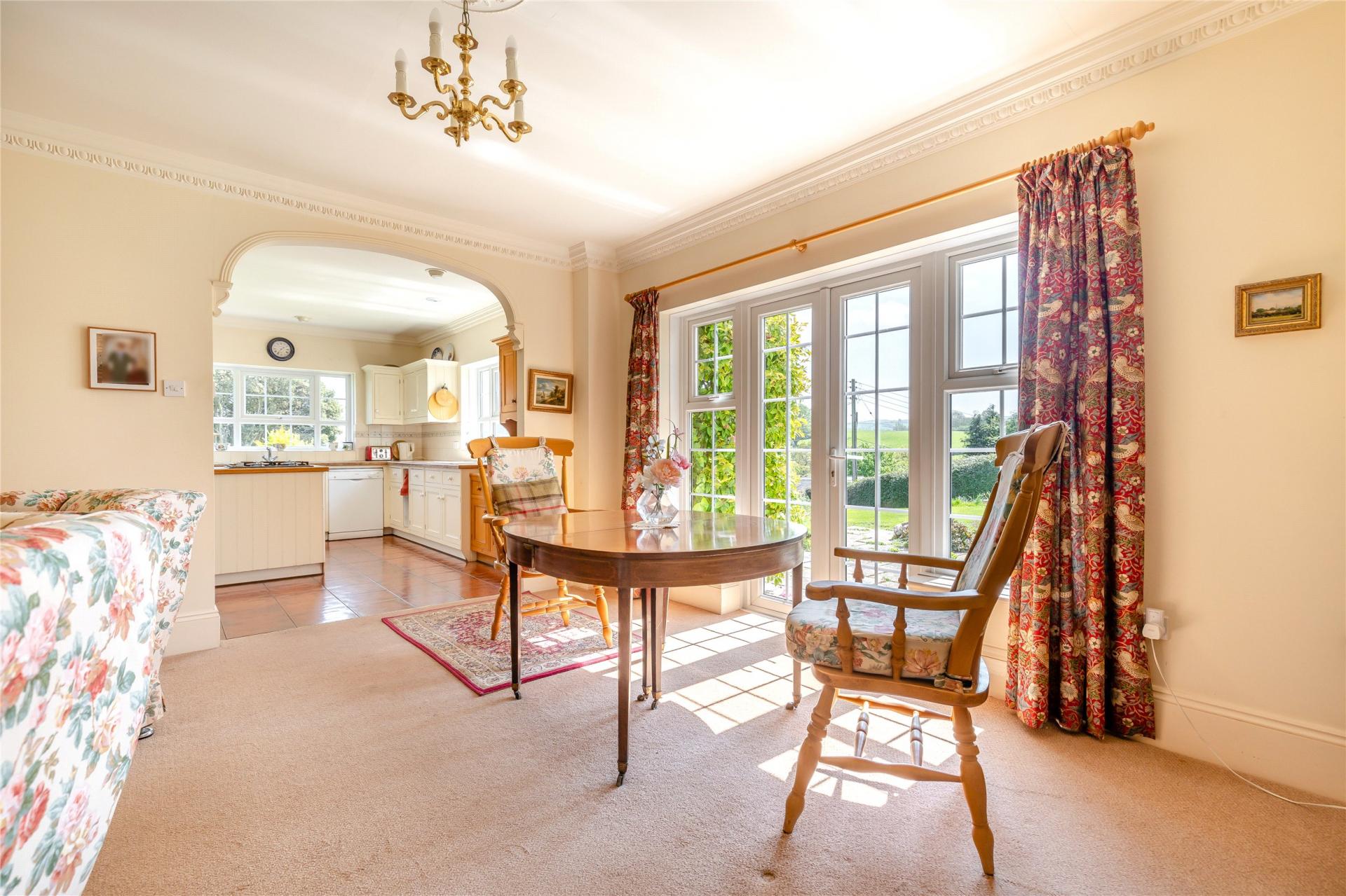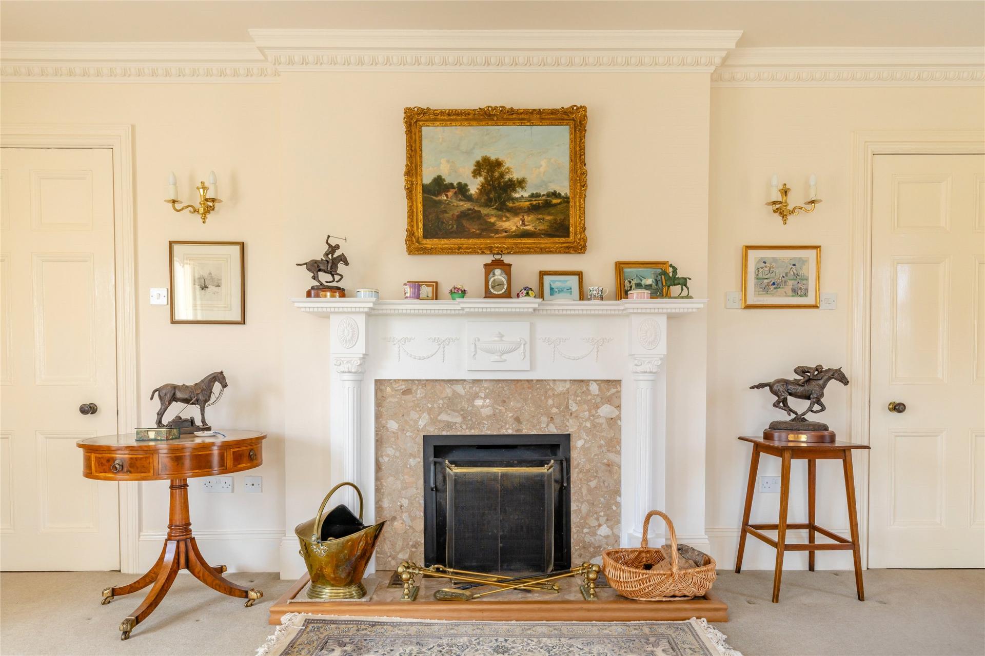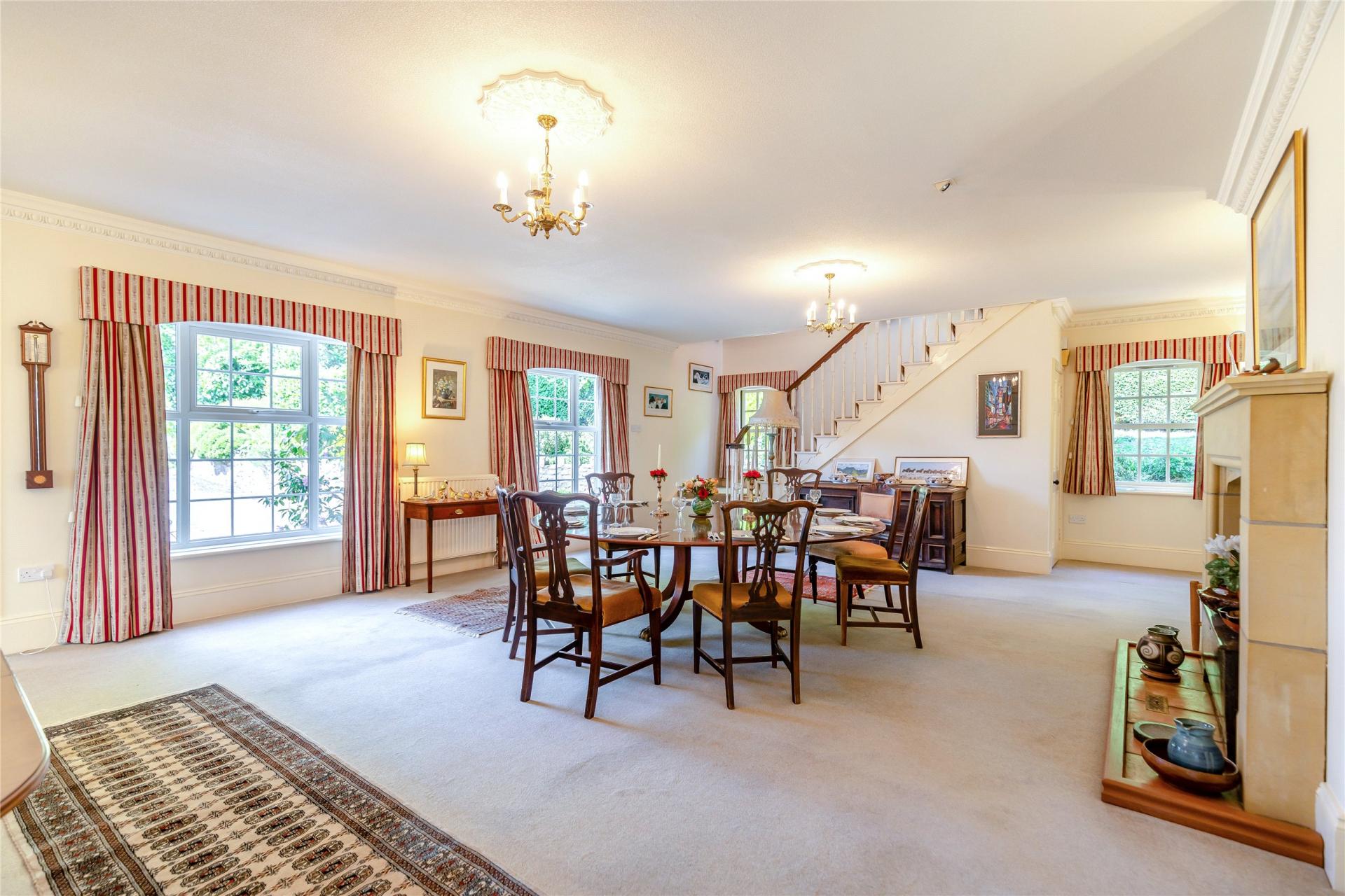 Upon entering, you’re welcomed into an inviting entrance porch, which flows into an impressive central dining hall—undoubtedly the heart of the home—complete with a grand stone fireplace and a sweeping staircase. The stunning, triple-aspect drawing room is light-filled and serene, featuring a handsome stone fireplace with an open fire, a square bay window, and French doors that open directly onto the patio, offering seamless indoor-outdoor living.