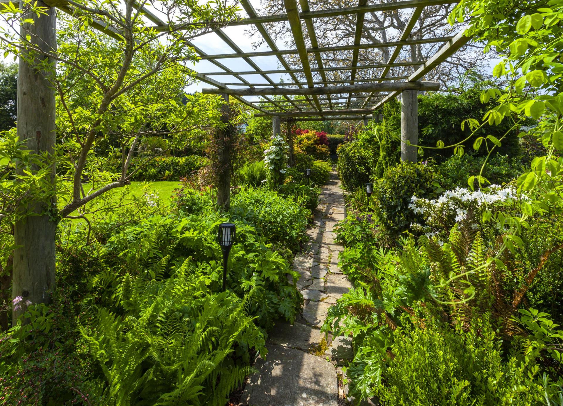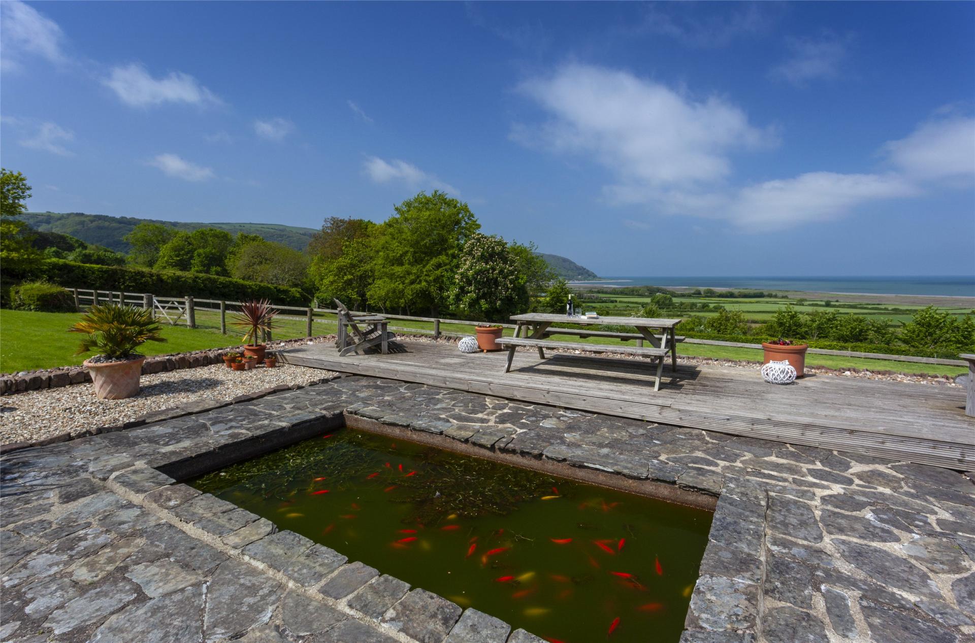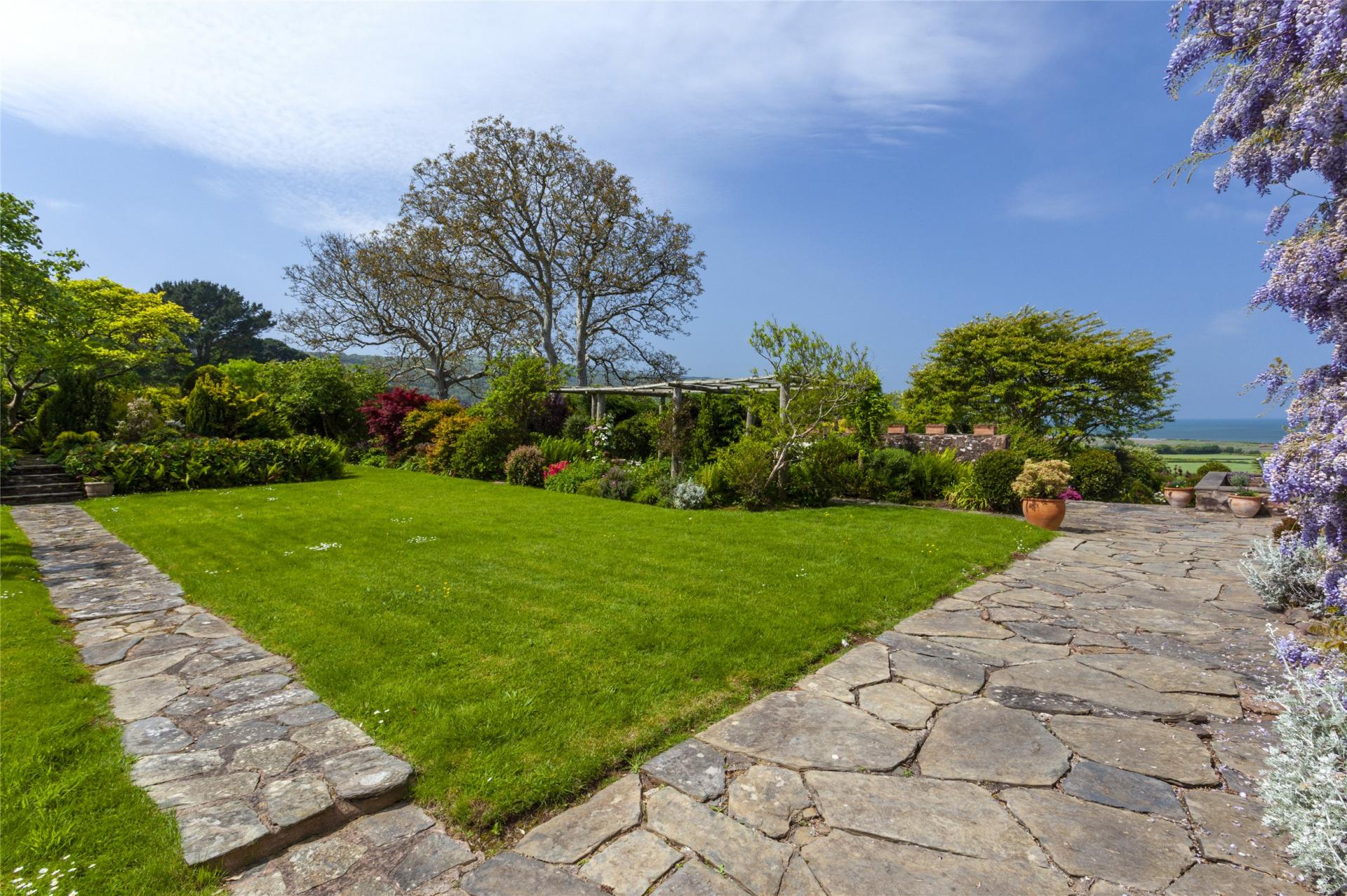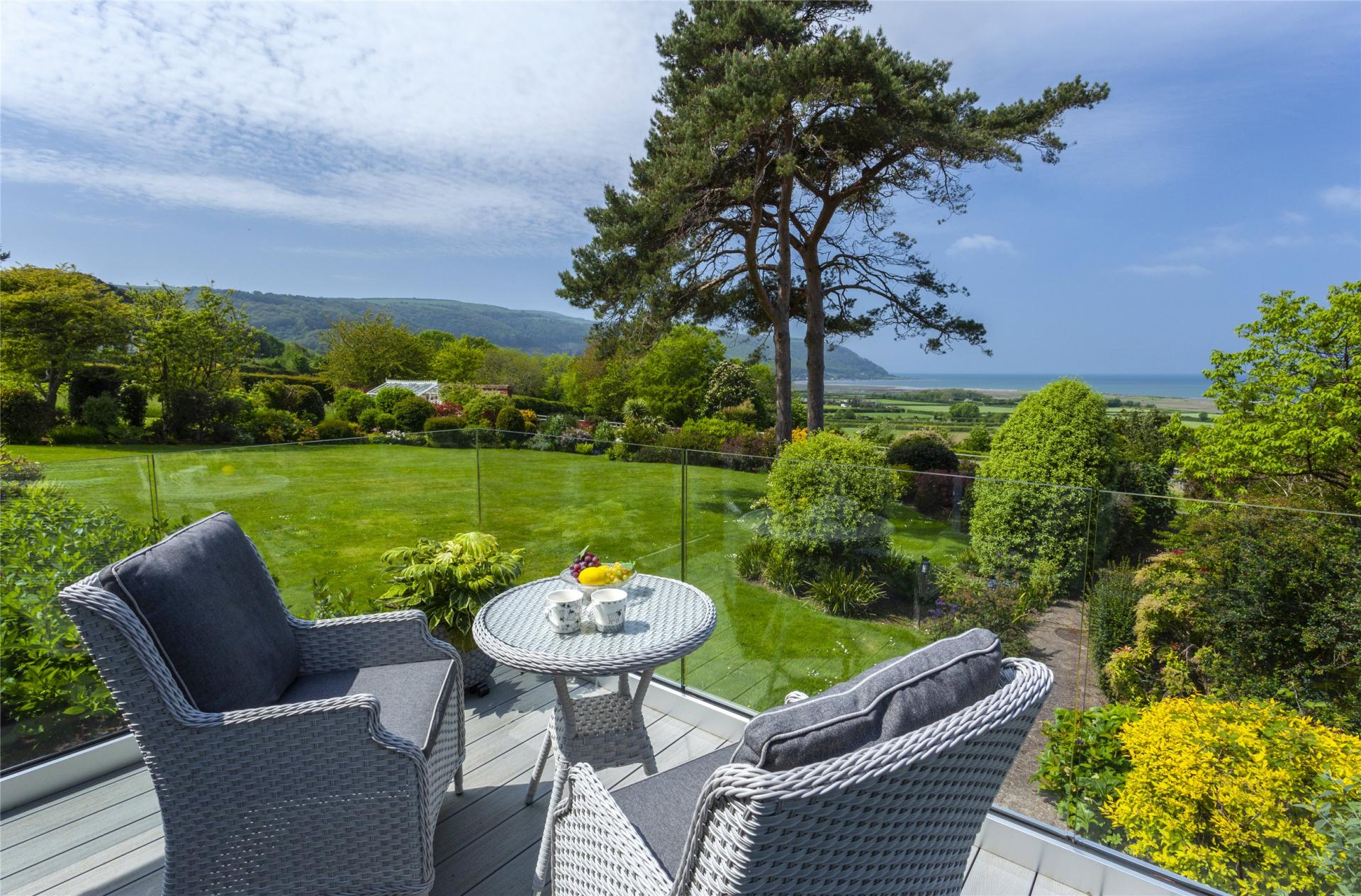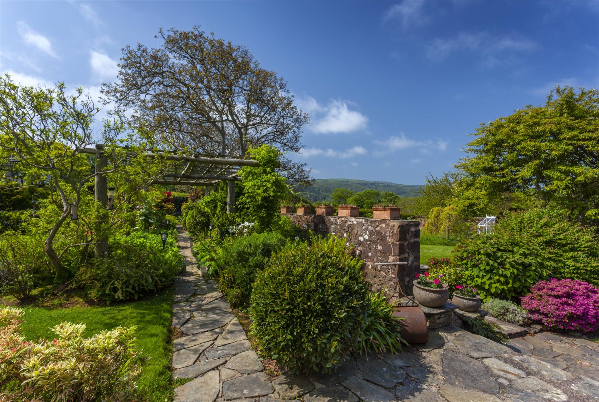 Stowleys stands in approximately 2.29 acres of mature formal gardens and is approaced off Bossington Lane through double gates onto a gravelled drive with ample parking, turn a round and access to the garaging. The beautifully manicured gardens include sweeping lawns with inset trees, shrubs and flower beds, pergola with climbing plants and stone path walkways. A low walled paved terrrace immediately outside of the garden room is ideal for alfresco dining with steps down to a further lawn with flower and shrub borders and a variety of trees. A futher raised decked terrace with sunken fish pond provides a superb view over the bay, there is a small orchard with young fruit trees, wild meadow and large greenhouse. A post a rail fence at the foot of the garden divides off a small paddock ideal for those wishing to keep small animals. Within the grounds there is also a range of buildings providing log and garden implement stores.