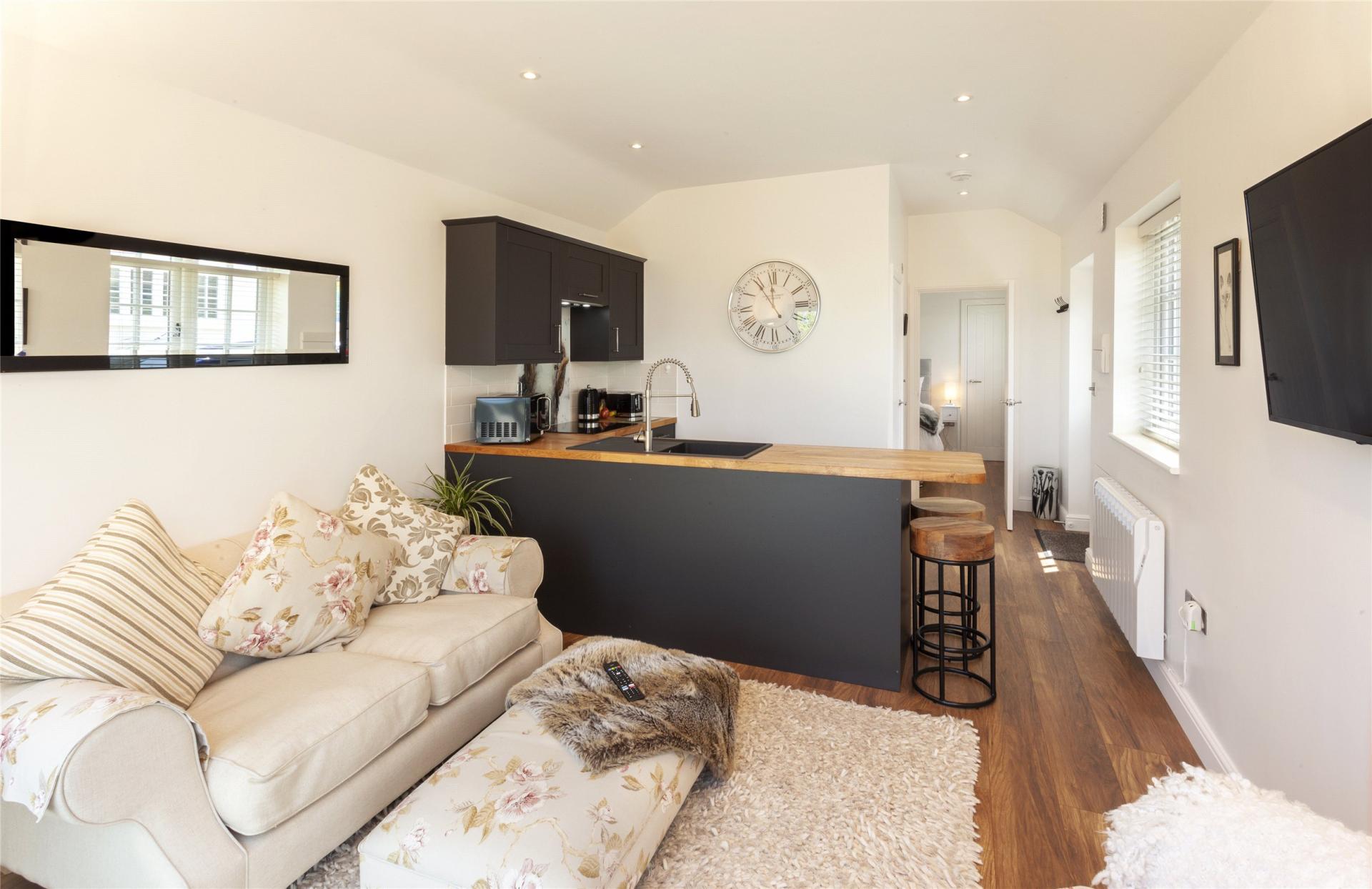 The former stable/tack room attached to the rear of the garage has been cleverly converted to provide studio/annexe offering a sitting room with kitchenette and bi-fold doors to a terrace, double bedroom and bathroom suitable for a variety of uses subject to the usual consents.