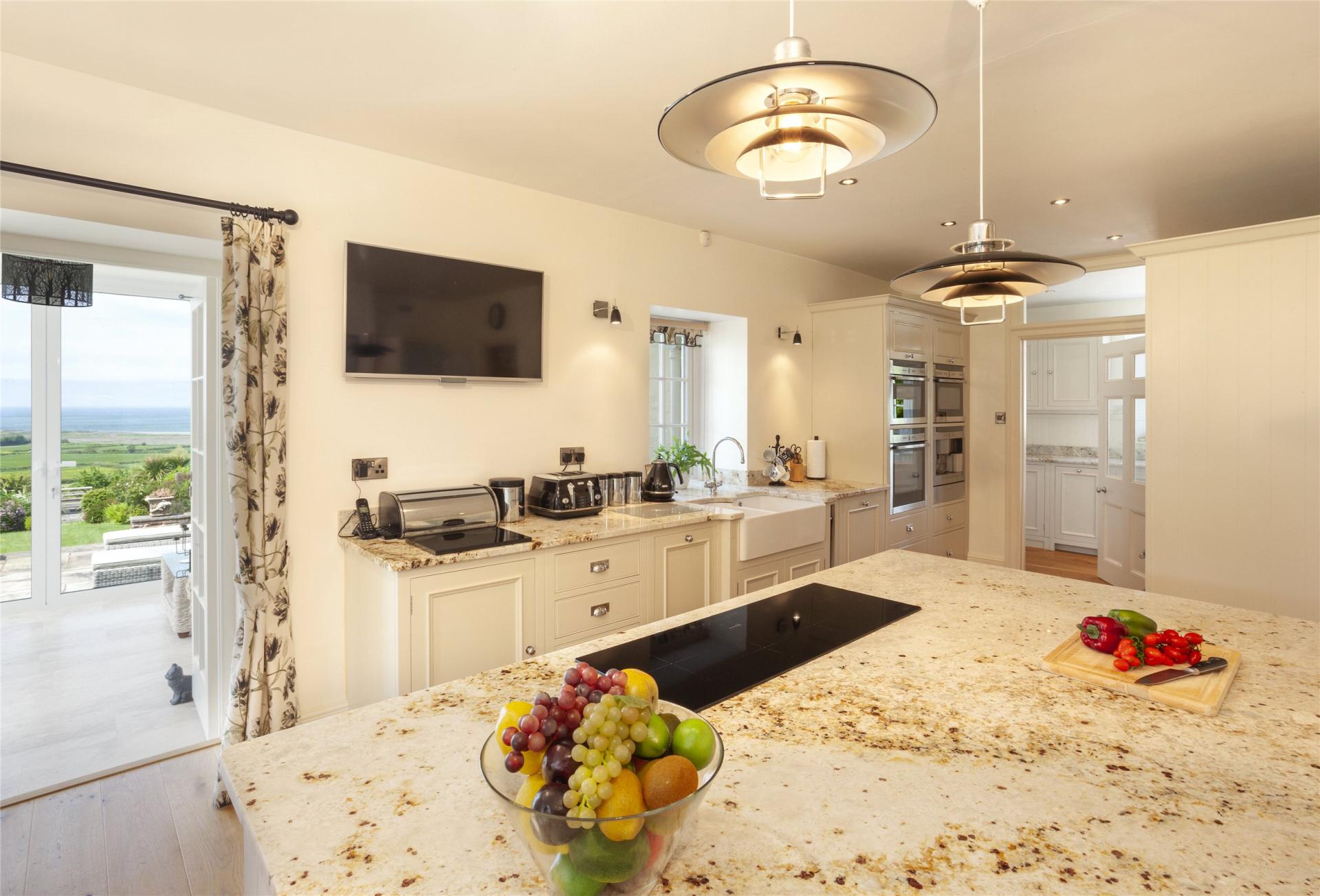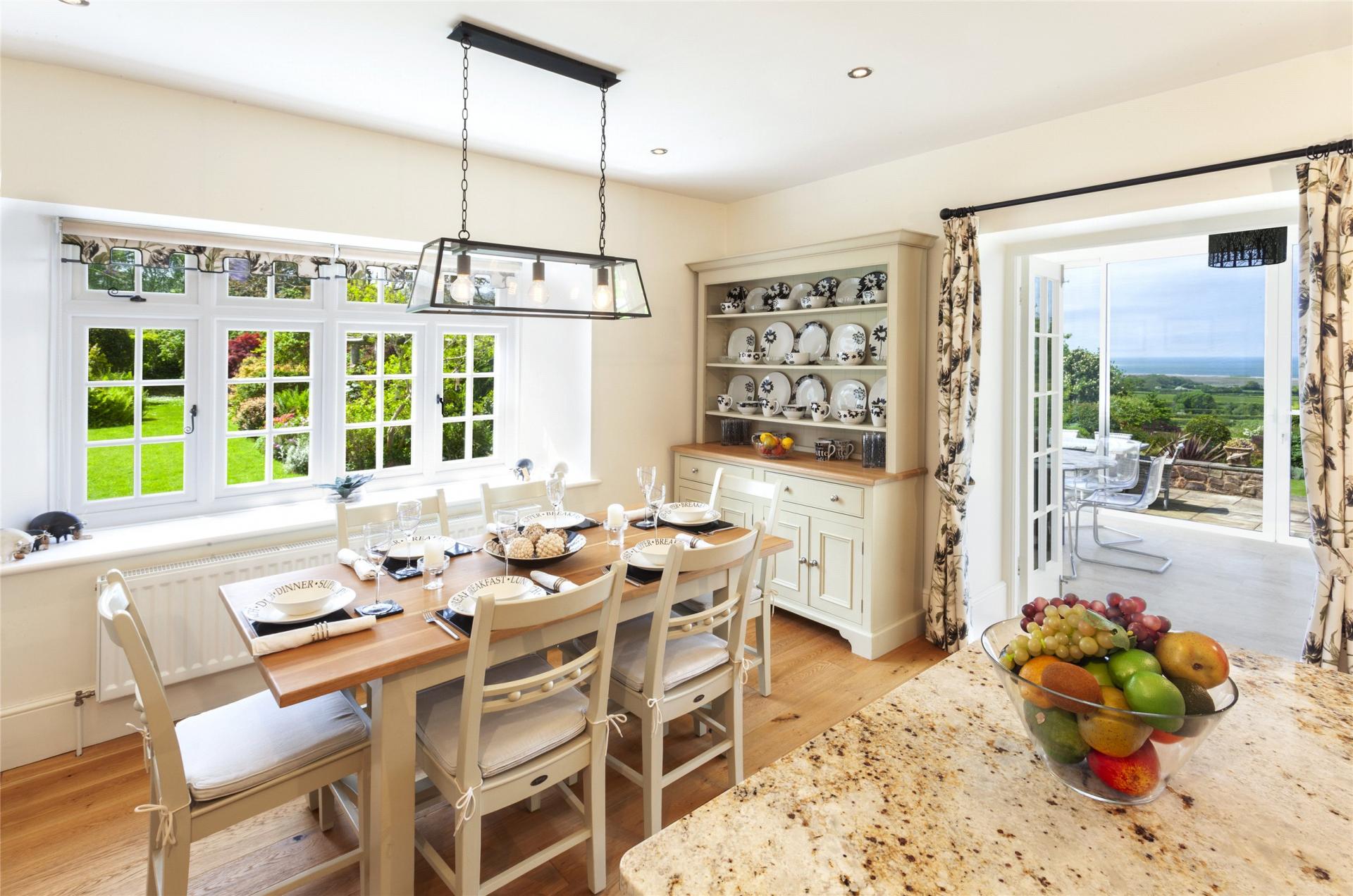 Passing through double wrought iron gates onto an ornamental gravelled drive with the back drop of the sea a handsome house A substantial slate floored entrance porch welcomes you through to a formal reception hall with tiled flooring flowing through to traditional cloakroom whilst the other side of the hall sits a study. An elegant double aspect drawing with marble fireplace and bow window with seating overlooks the gardens and a sitting/dining room with stone firelpace and woodburner has double doors into to the gardens. The bespoke Neptune kitchen/breakfast room with a walk in pantry is an undoubted feature offering an excellent range cupboards and drawers with matching island unit, granite work tops, double deep sinks and integrated appliances to include a four oven electric Aga, Neff induction hob, eye level double ovens, microwave, coffer machine, dishwasher and Rangemaster american style fridgefreezer. Multi pane double doors lead through to a double glazed garden room enjoing stunning views over the gardens Porlock Bay and with access onto the terrace. Staying on the ground floor there is a separate matching utility room, boot room with walk in storage cupboard.