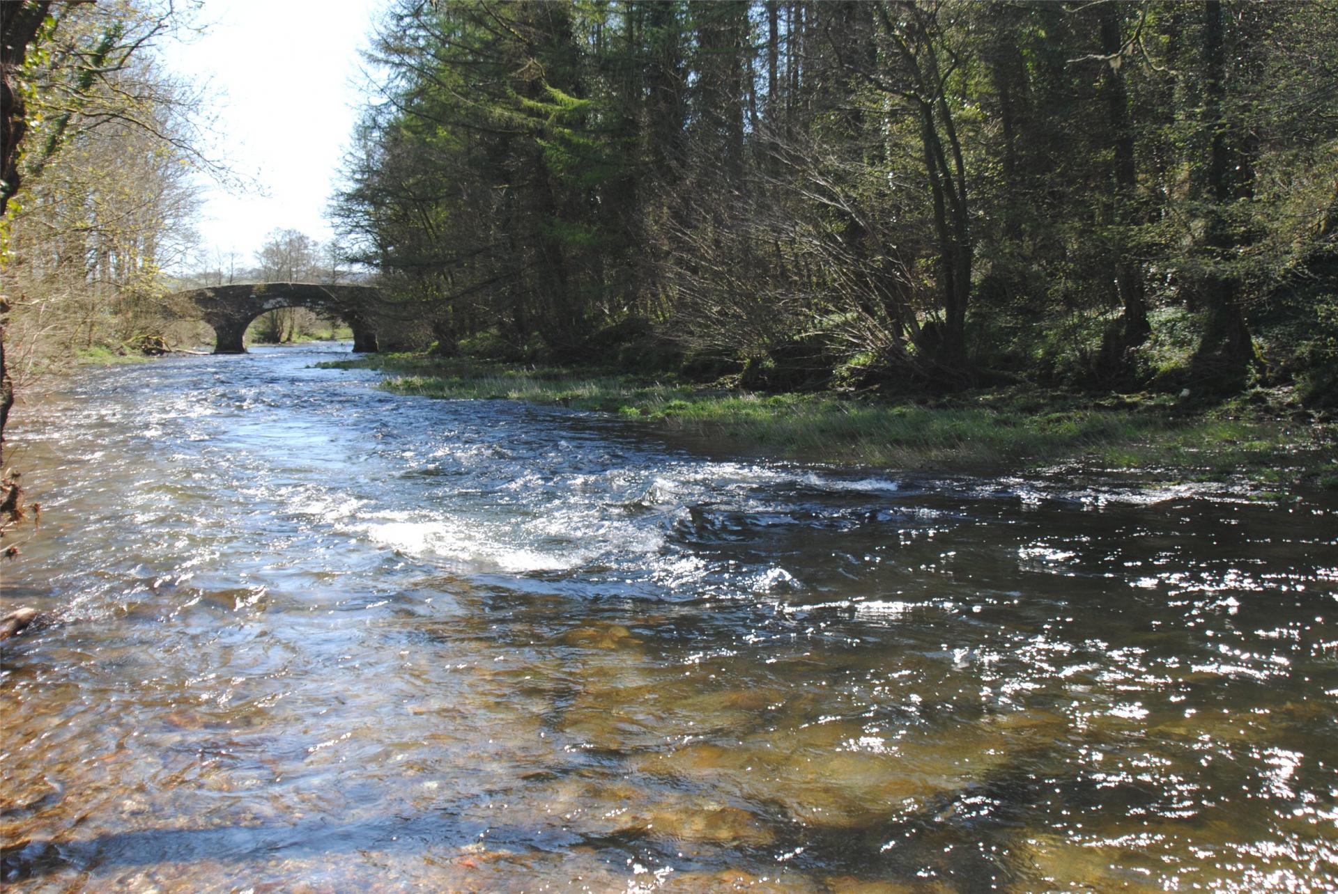Double and single bank fishing on the Barle The left bank running from approximately the lower side of New Bridge to the Kissing Gate and Telegraph Pole Hedge two fields upstream. 811 yards (741 metres). The right bank runs from the lower side of New Bridge to the garden fence of Penlee, Dulverton (the first property on entering the outskirts of the town). 1473 yards (1347 metres). The stretch includes both named pools and The Salmon Leap