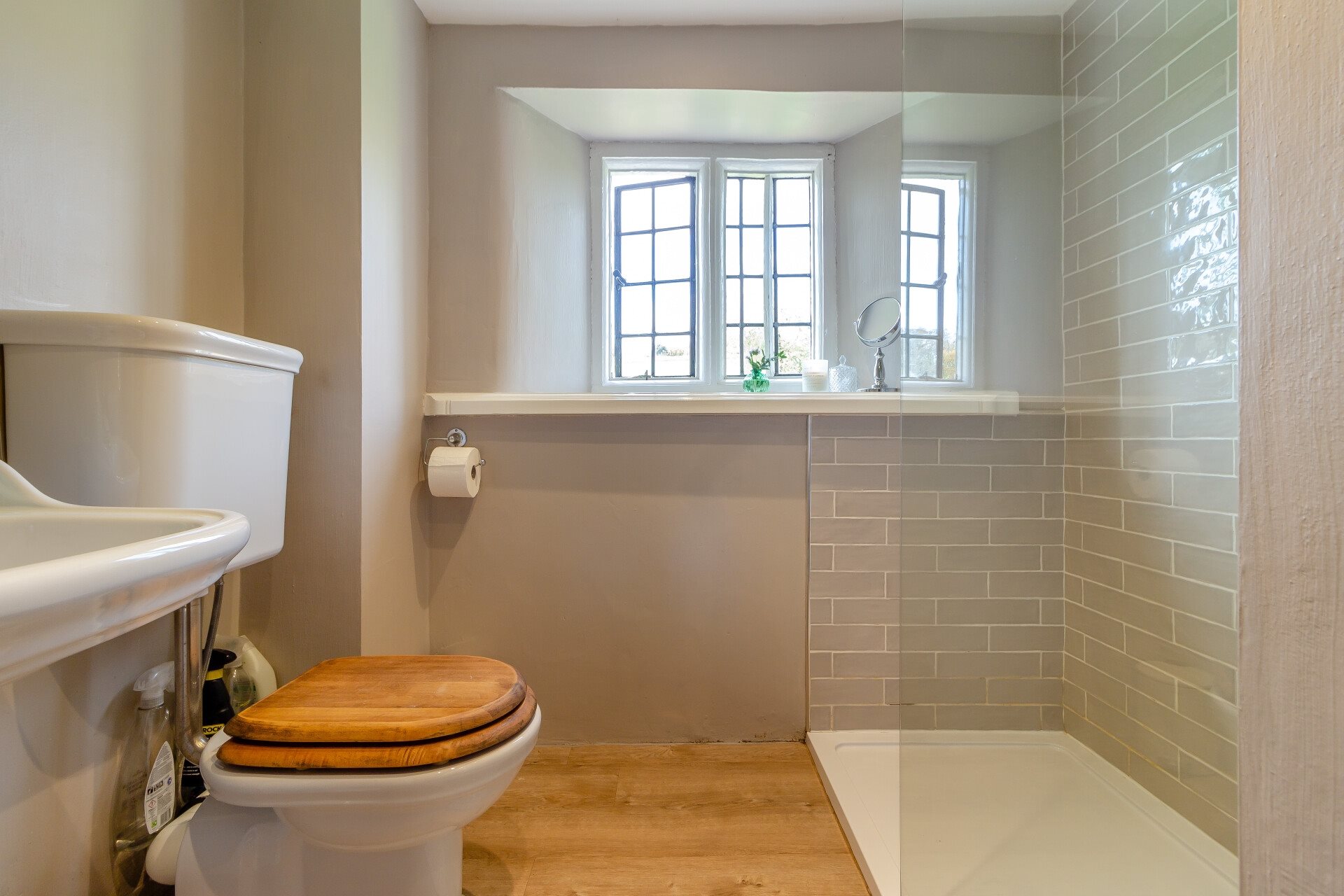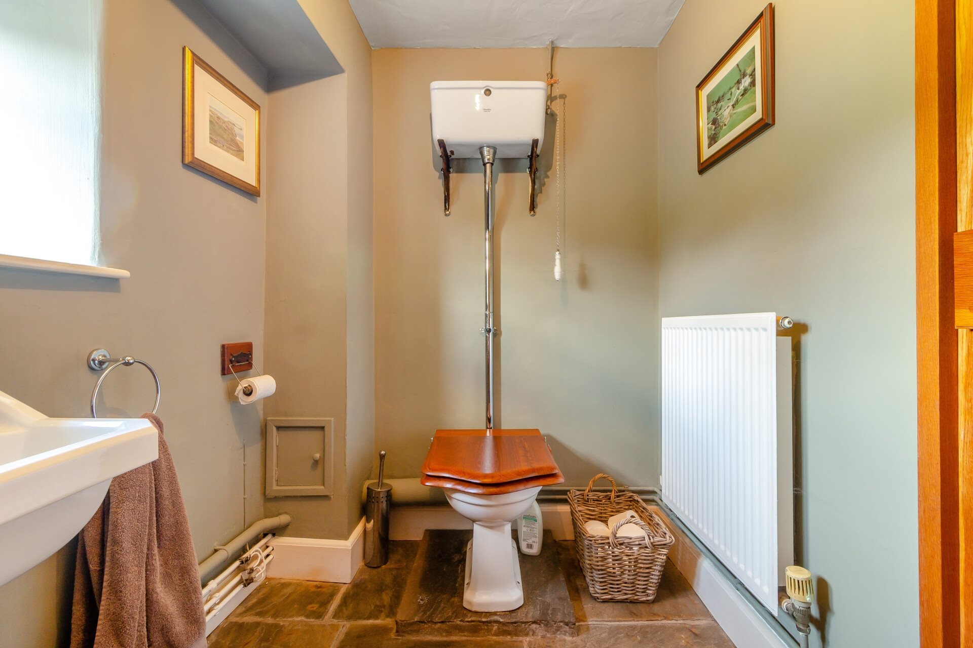 boasts a wonderfully traditional toilet and flagstone floor, and a handy storage cupboard next to the third staircase that this historic home offers.