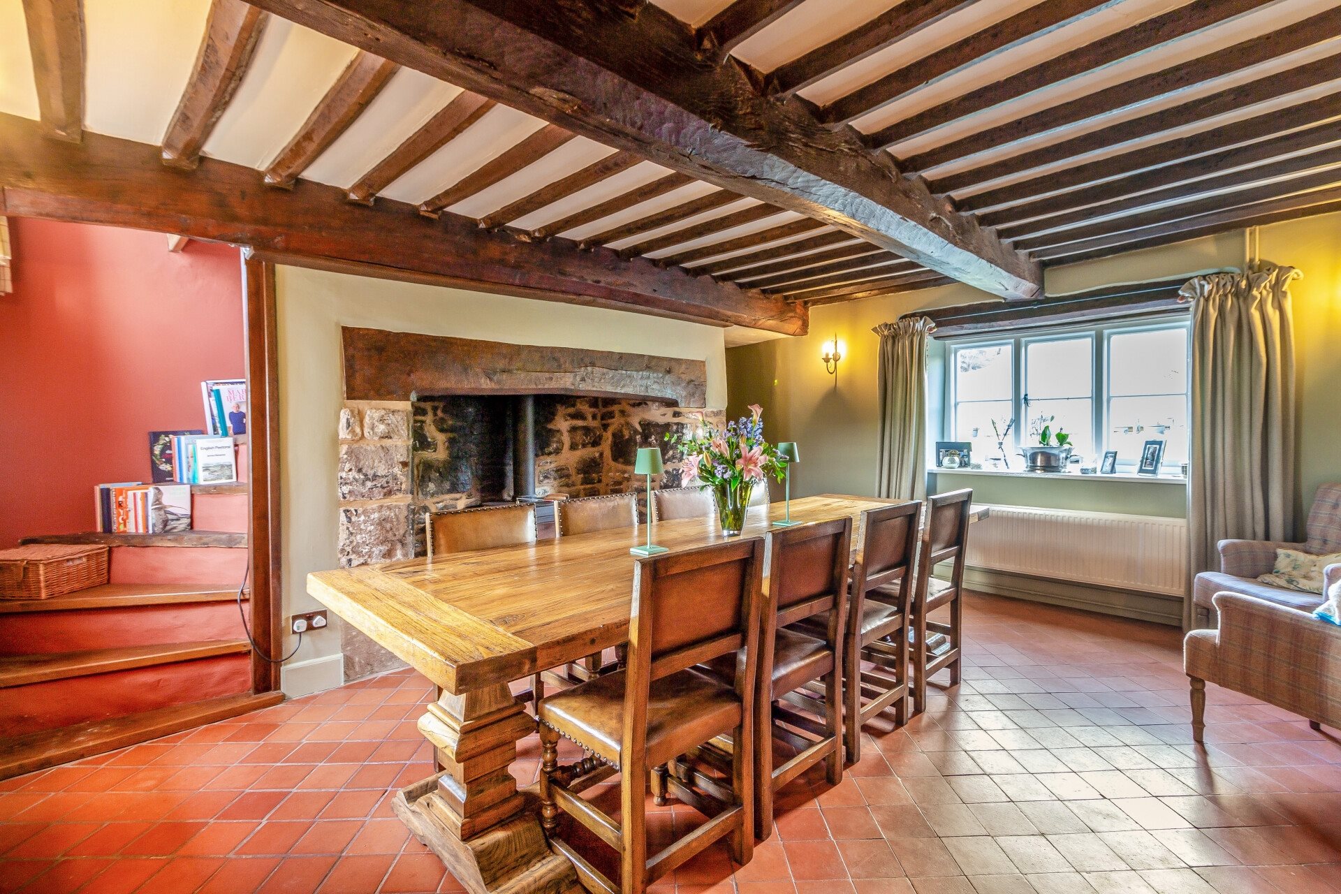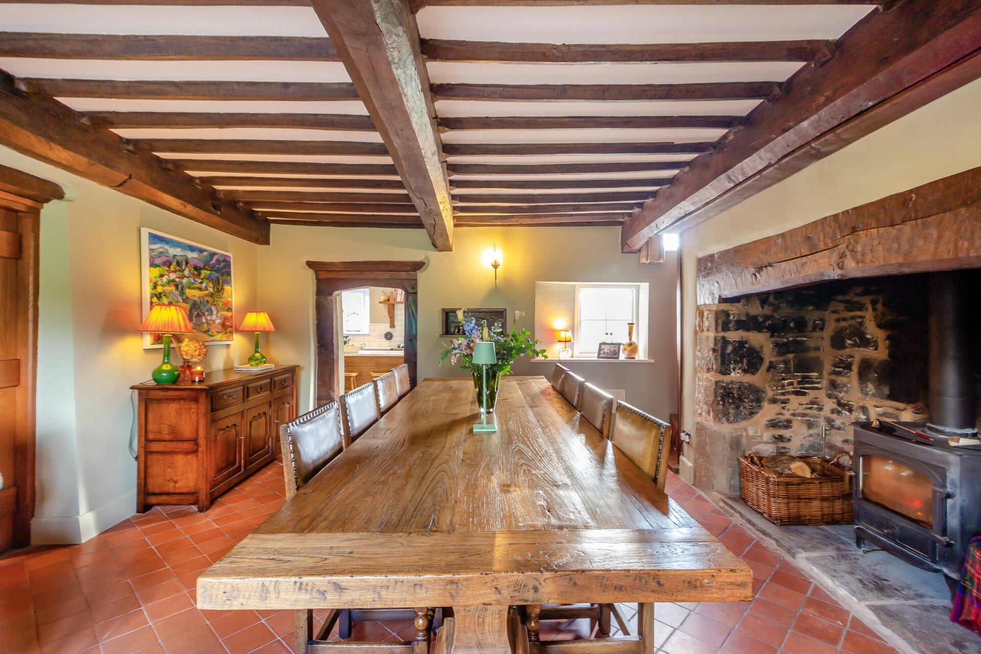On the opposite side of the central hall is another charm and social area. The dining room can boast a beast of an inglenook fireplace with exposed stone walls, a flagstone hearth and a robust log burner nestled inside that throws