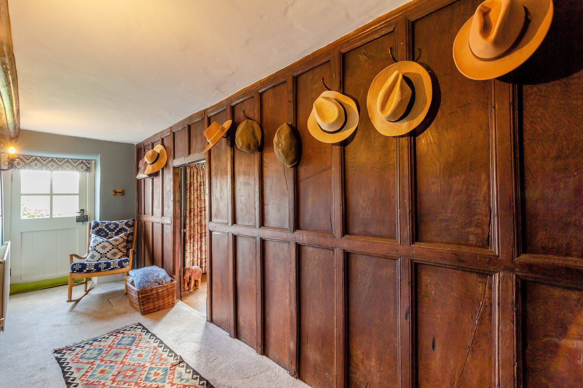There are a number of ceiling beams, as you might expect, a charming latch door that dates back to the 17th century by the fireplace that leads to an original stone staircase to the first floor and original leaded windows, but maybe it's the wall of wood panelling that is the most impressive historic gem to delight within this room.