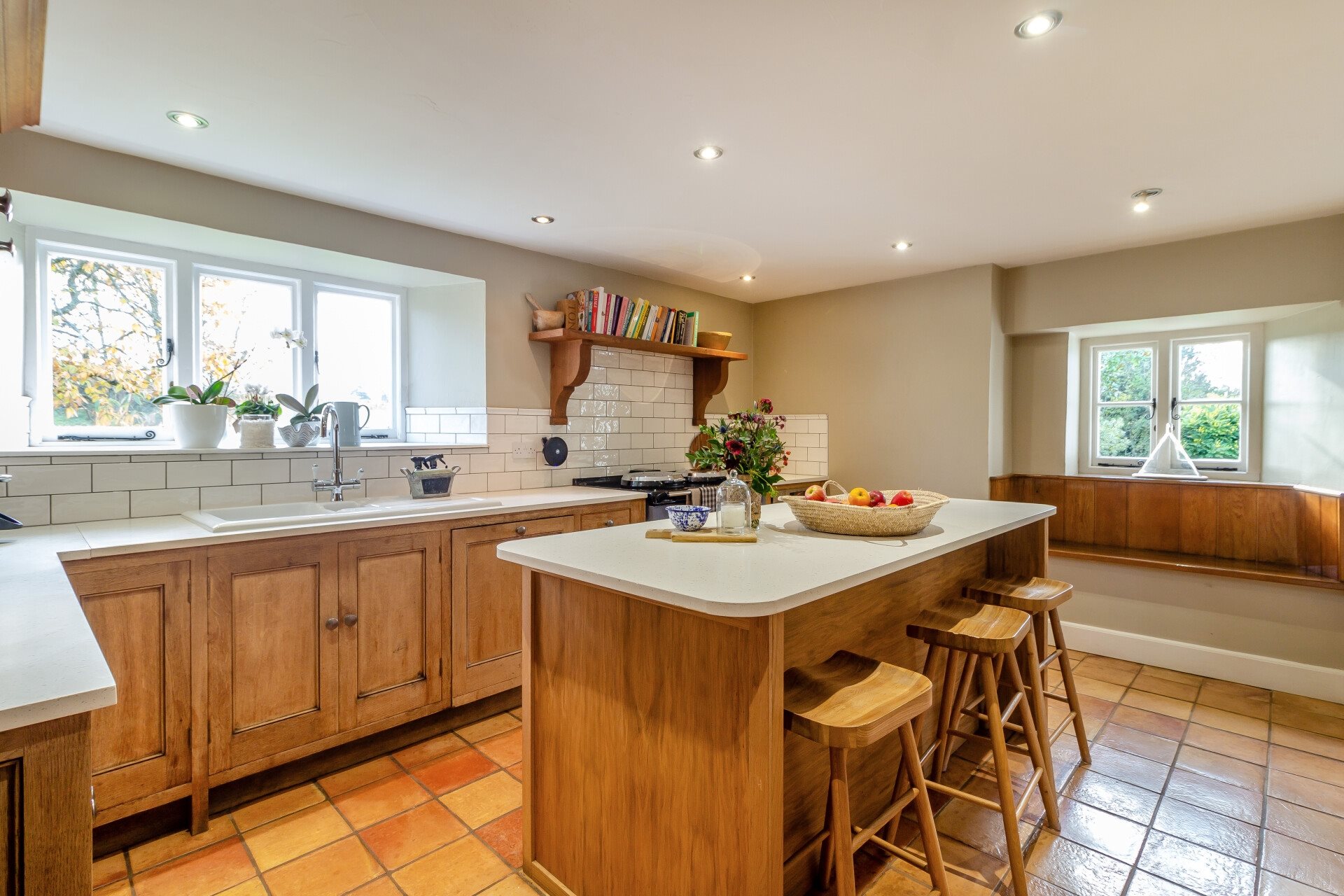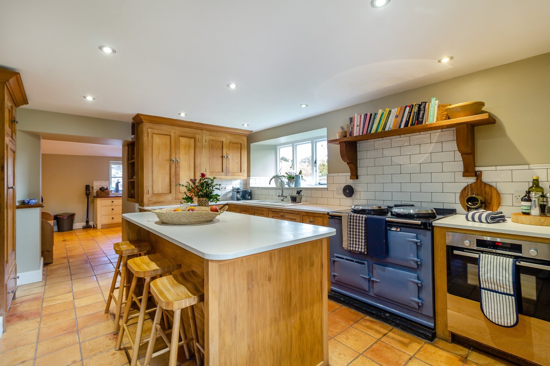 The quarry tiled floor and ceiling beams top and tail the space in period character and creates an intimate and inviting atmosphere within which to enjoy family meals and dinner parties sat around the substantial central table. An open double doorway leads into the country kitchen that effortlessly combines a traditional style with the modern appliances and storage - everything a cook requires with the stunning deep blue Aga a standout feature.