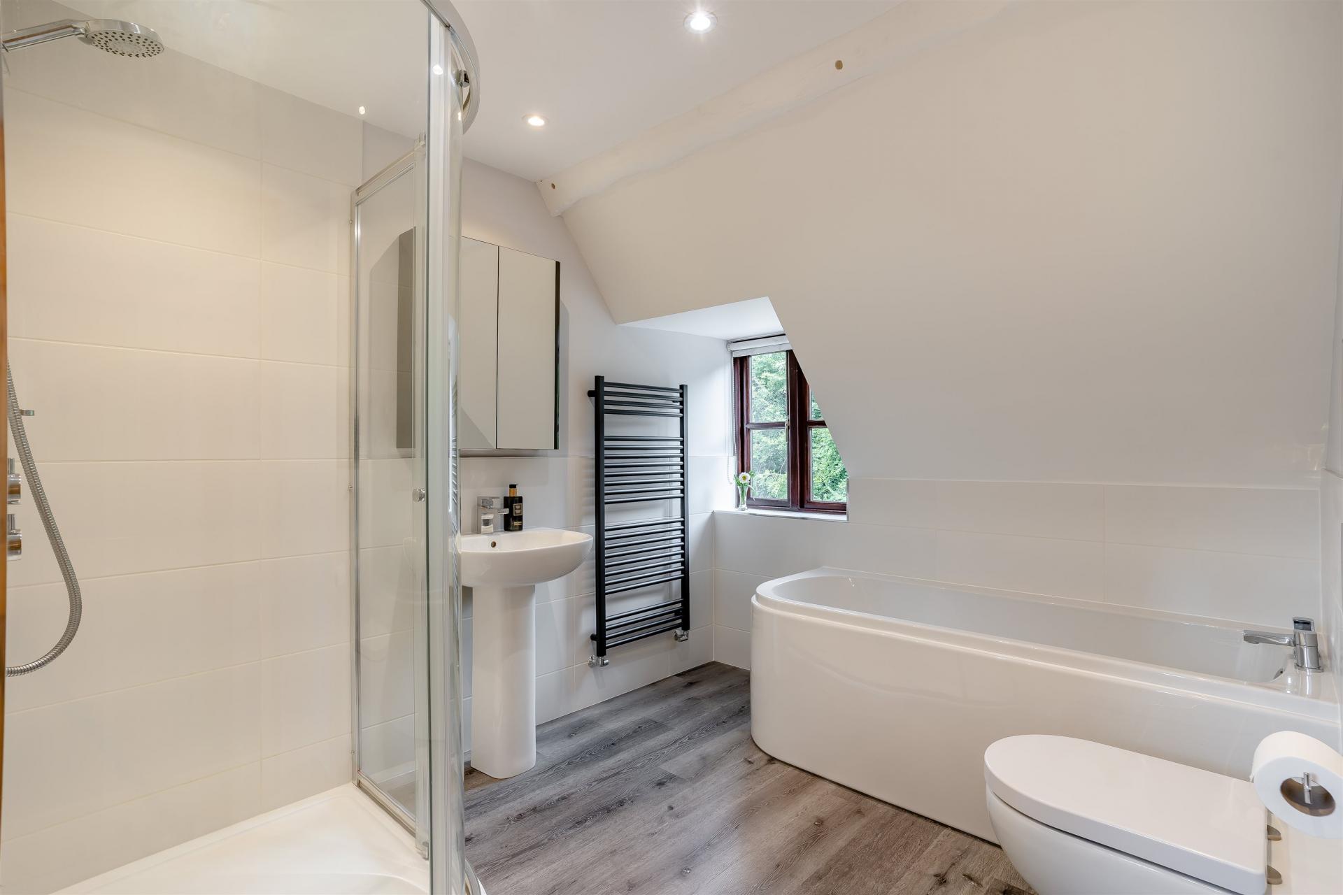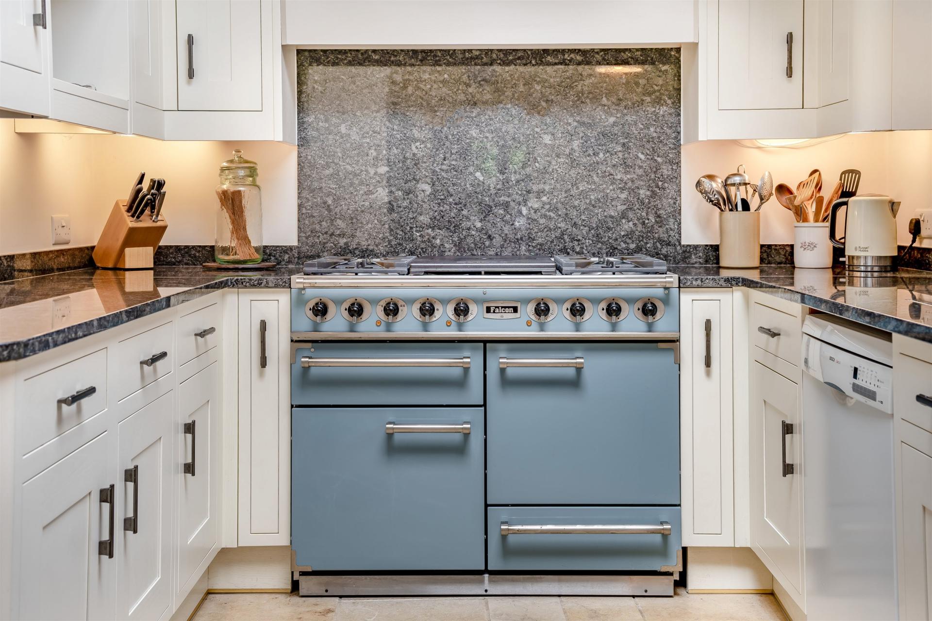 The jewel in the crown of the ground floor is the modern kitchen diner, a later extension that blends the old and new parts of the house seamlessly. The Shaker-style kitchen is well-equipped with space for a Falcon range cooker, dishwasher, and American-style fridge freezer. The dining and family area enjoys a vaulted ceiling and is flooded with light from four large Velux-style windows, while two sets of French doors open onto an alfresco dining area at the rear. Just off the kitchen lies a generous utility / boot room, providing ample space for white goods as well as a practical area for shedding muddy shoes and boots.