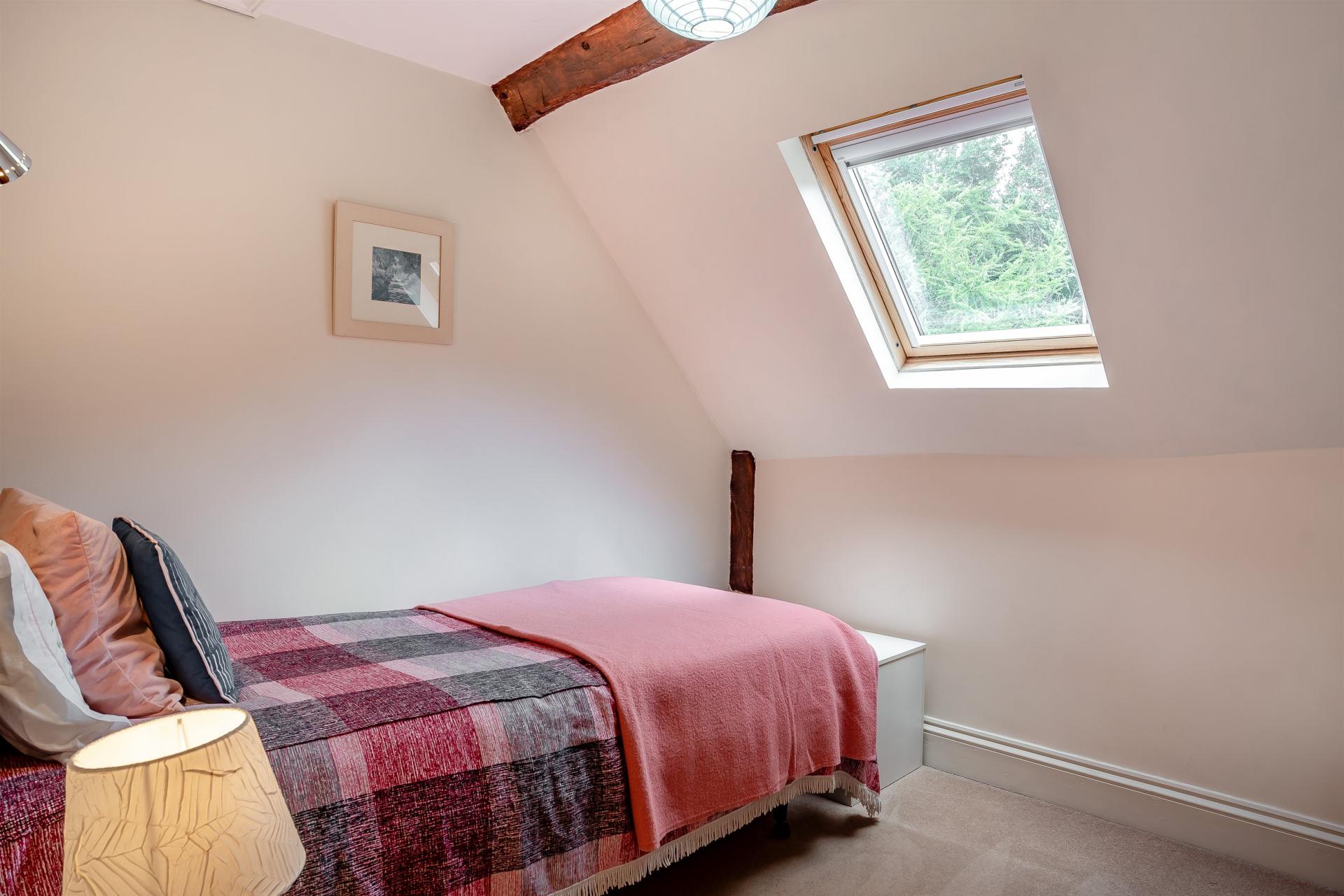 Upstairs, there are four bedrooms in total. Two could easily be considered principal suites: one to the front enjoys a triple aspect outlook, a dressing room, and an en-suite; the other is a light-filled room with stunning views across neighbouring fields, fitted wardrobes, and its own en-suite. Another bedroom features a characterful fireplace and enjoys dual aspect views across both the fields to the rear and the garden to the front, while the fourth bedroom sits adjacent to a modern family bathroom.