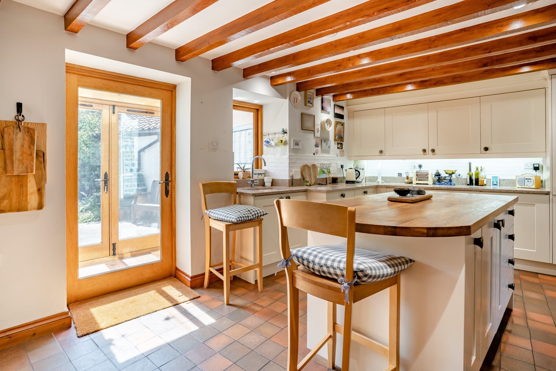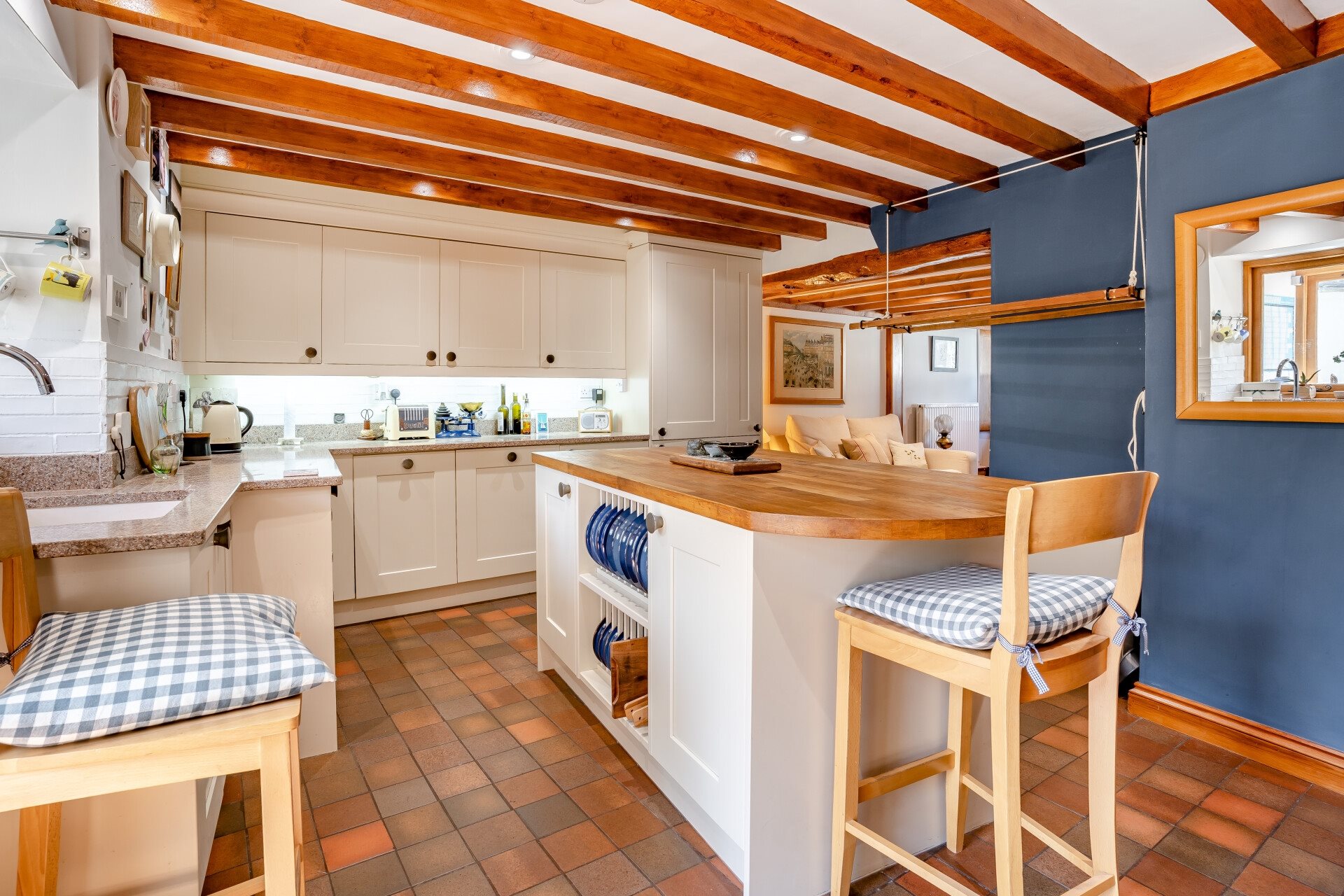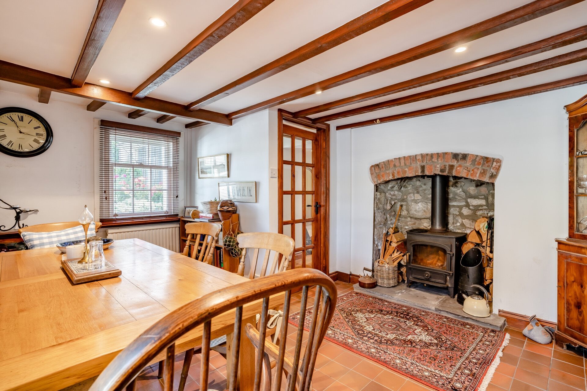 Behind its charming cottage frontage, this home opens into a surprisingly spacious and stylish interior, showcasing a beautifully flowing layout ideal for modern living. Entering through the welcoming kitchen, you are greeted by a central island and direct garden access, seamlessly connecting to the cosy snugonce a shop, now a relaxing retreat. A practical utility area with a cloakroom adds everyday convenience. The snug leads into a formal dining area featuring a fireplace and wood-burning stove, providing a warm and inviting atmosphere for gatherings. From the entrance hall, the property opens into a generously sized formal sitting room with French doors leading out to the rear garden, perfect for entertaining or enjoying quiet evenings.