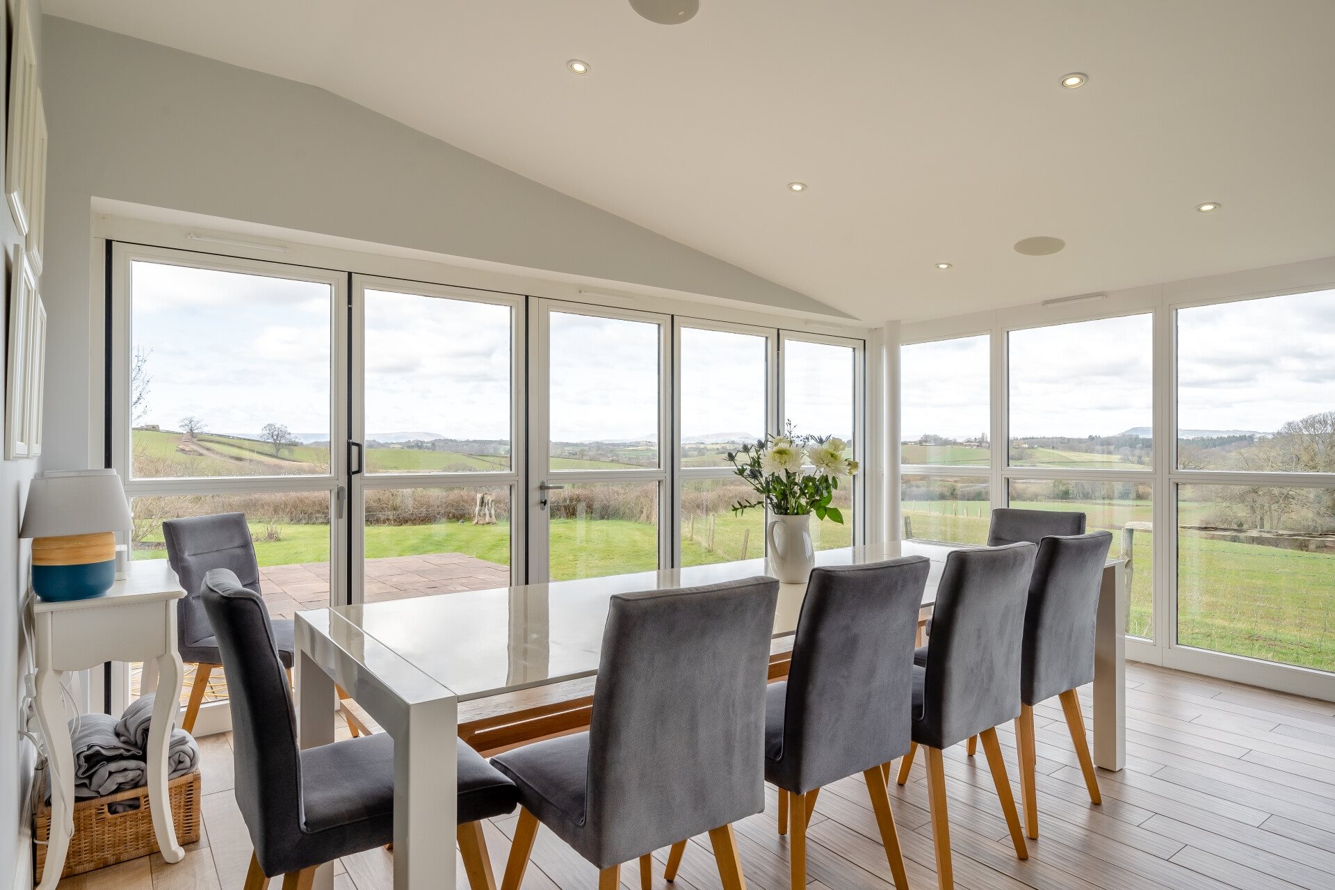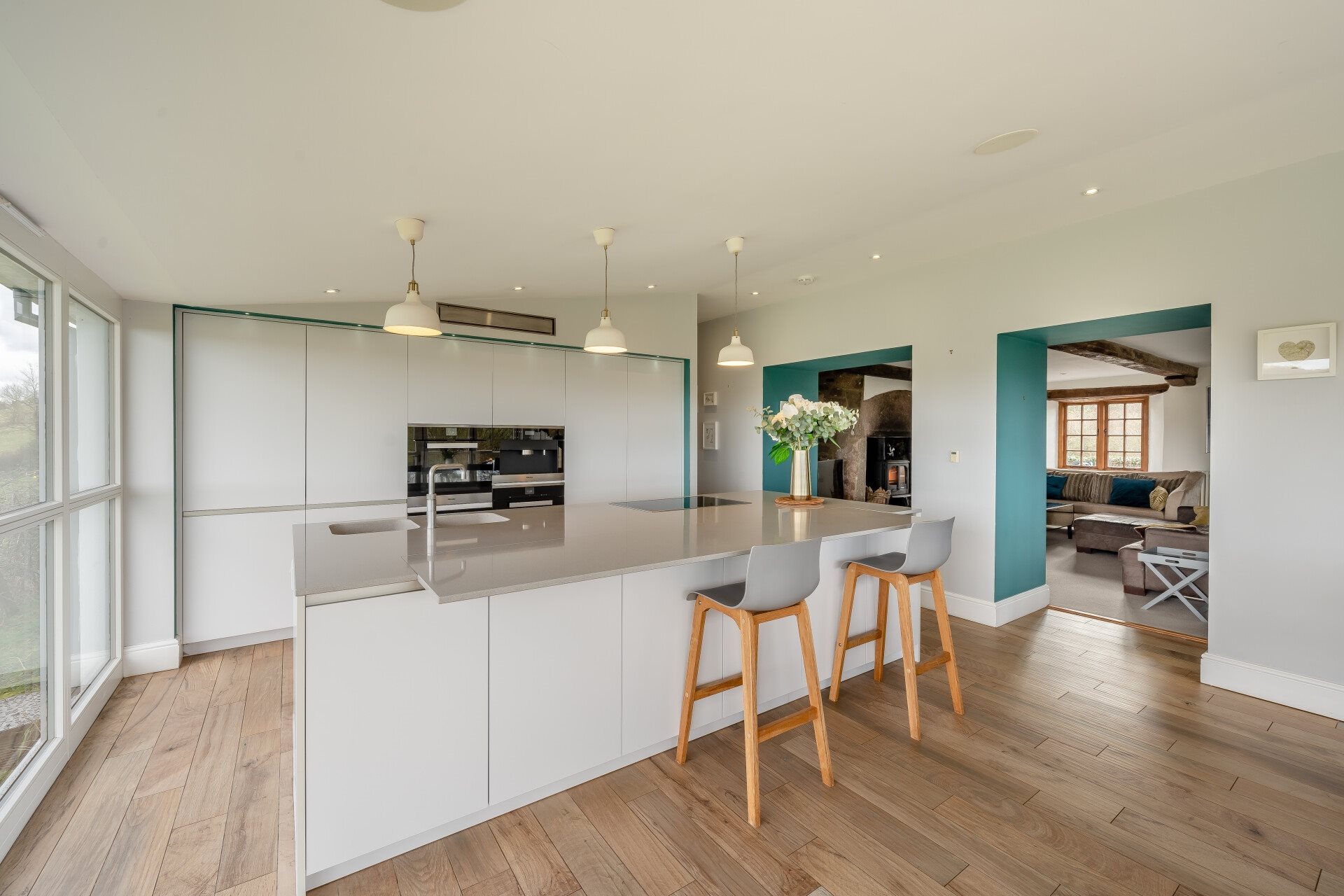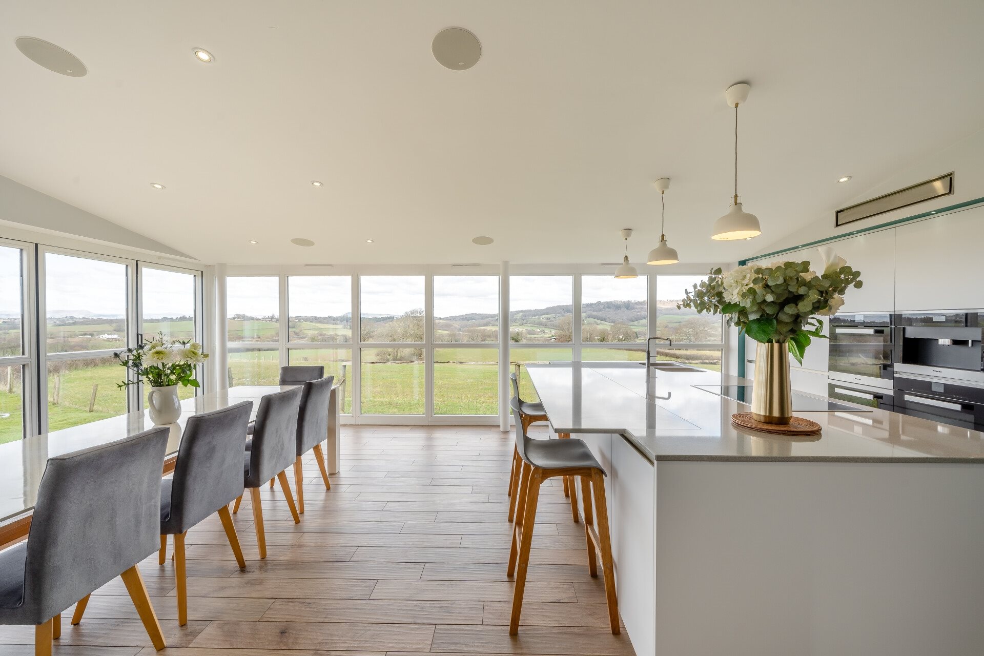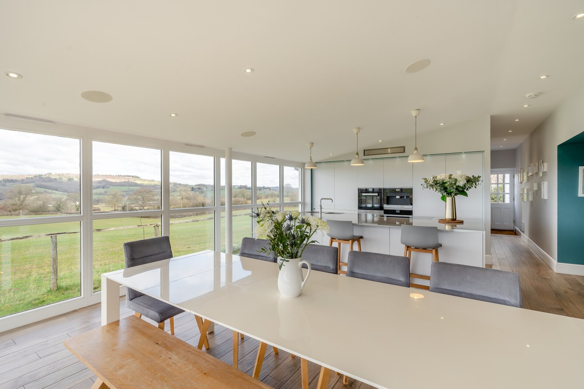 The heart of Lower House is undoubtedly its open plan kitchen and dining room that makes the most of the panoramic views over Bannau Brycheiniog and the Black Mountains, with full-height glazing on two sides to create an unforgettable backdrop for family life.