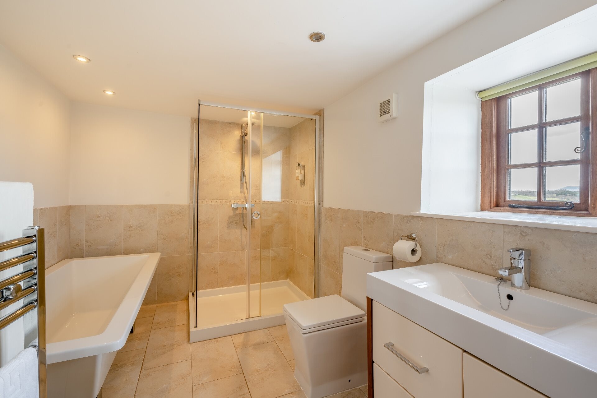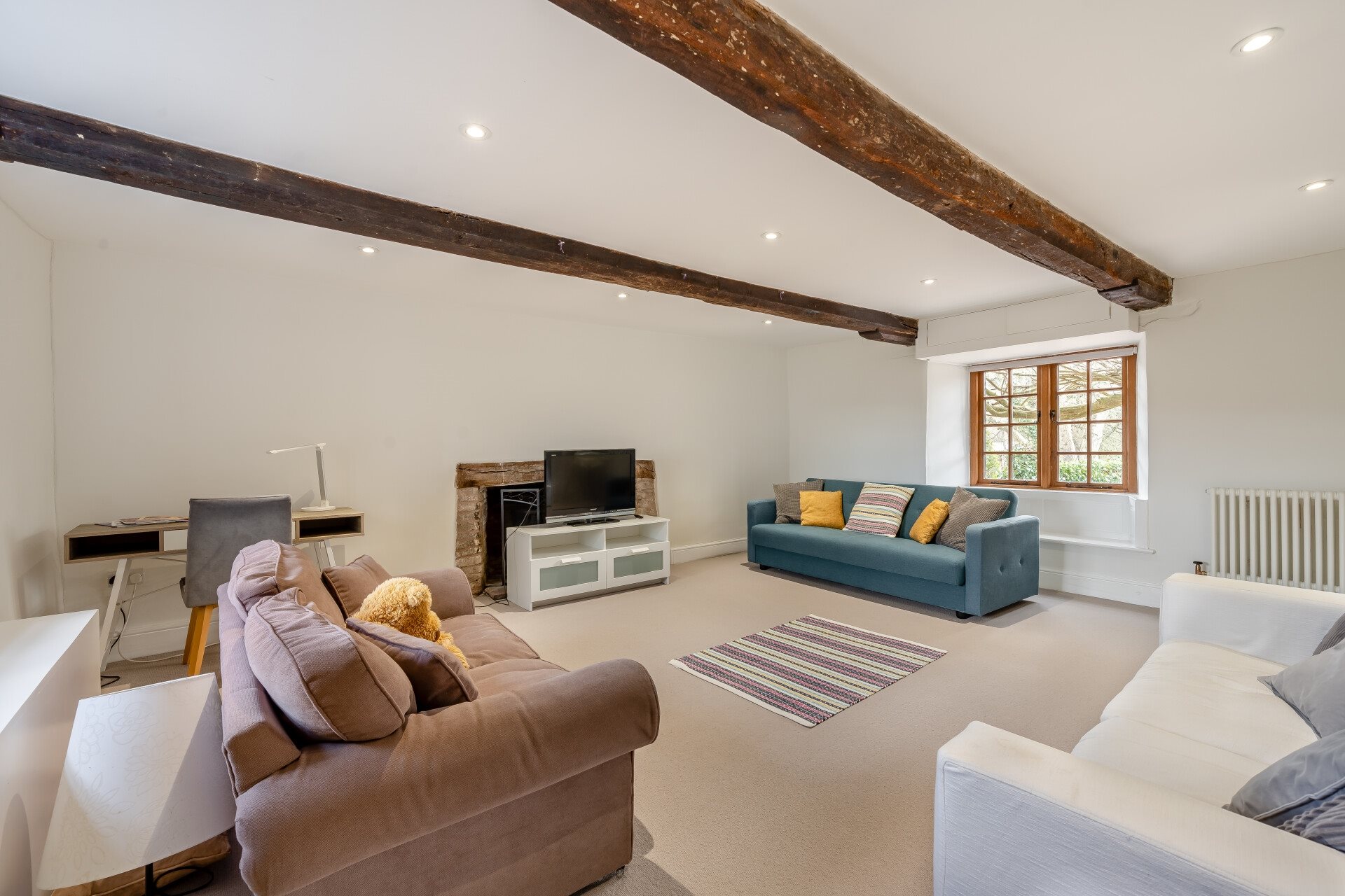 Elsewhere the interior of this spacious home is rich in character, with beamed ceilings, wooden floorboards, striking fireplaces, exposed stonework and windows with deep ledges that frame the views. Decoration is of a high standard throughout. There are two sitting rooms, both of which provide elegant spaces to relax. One lies off the kitchen, benefiting from the natural light flooding through the large windows, and has a stunning inglenook fireplace.
