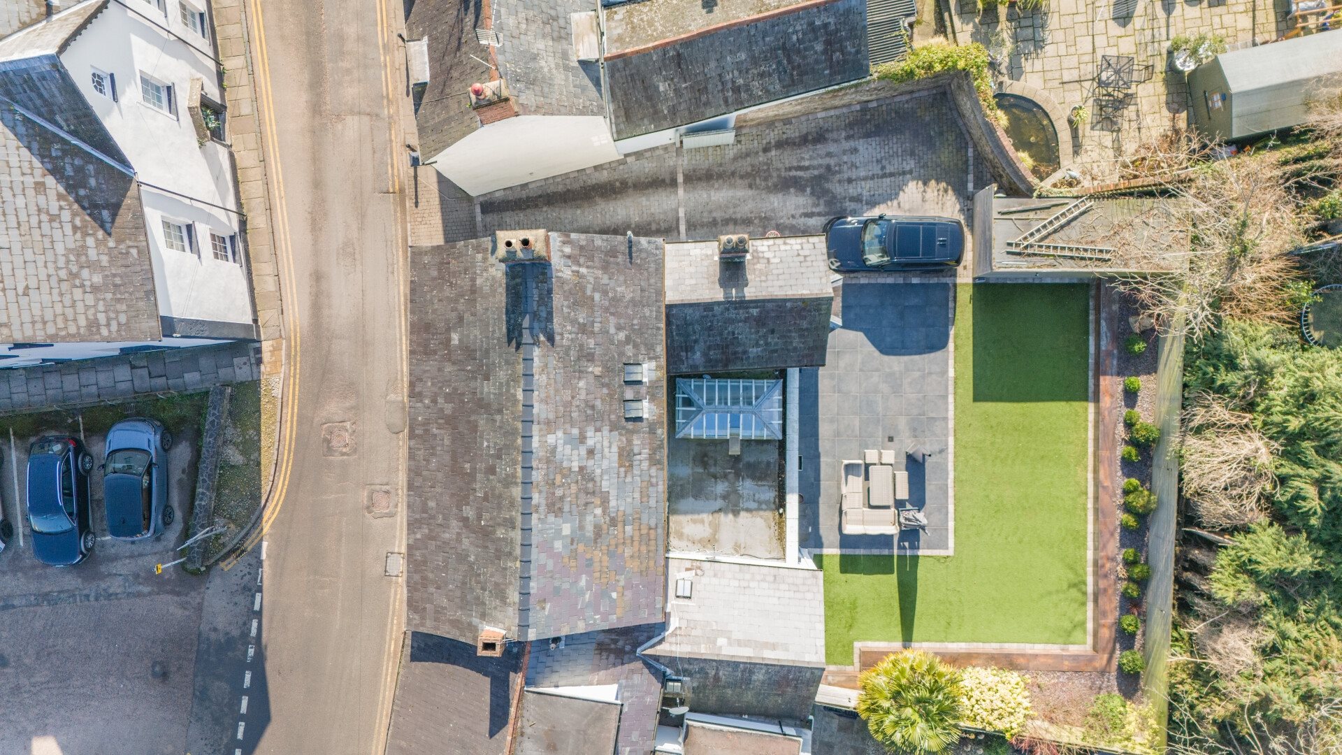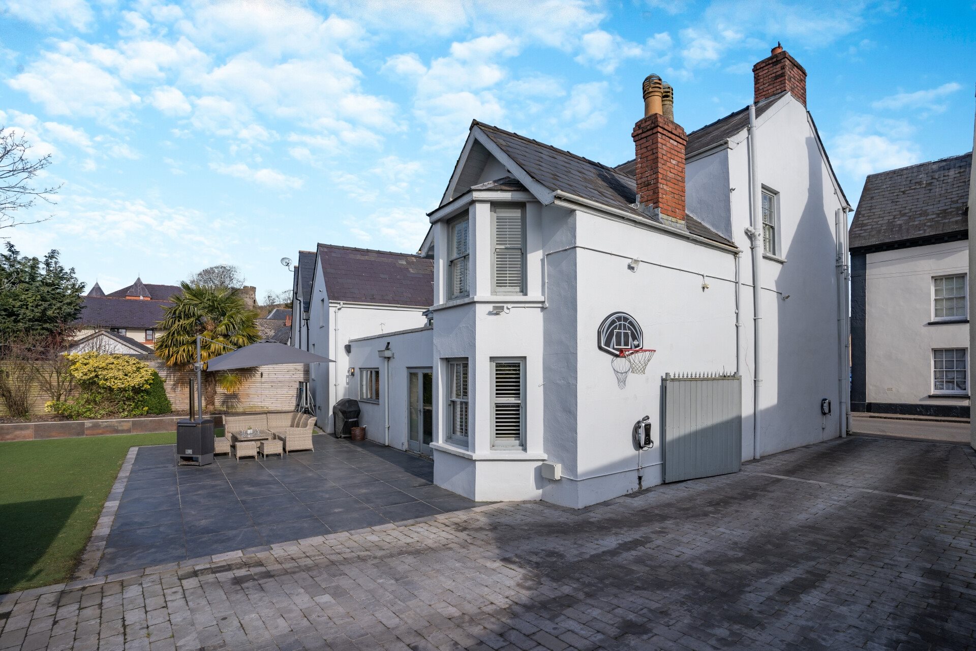 Outside - Gated driveway, parking, and a private garden in the heart of Usk. A side vehicular entrance is controlled by electrically operated double gates, providing valuable parking for several vehicles, including a pair of EV charging points.
