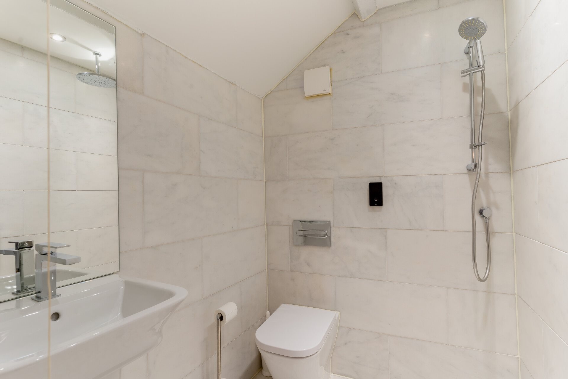 The first floor is mainly dedicated to the sumptuous master suite, featuring a spacious bedroom with exposed beams, a fireplace, and wooden flooring. The suite also boasts a large dressing room with extensive fitted wardrobes and an elegant en-suite bathroom with both a separate bath and shower, styled in a classic black and white theme. A second bedroom overlooks the tranquil rear garden.