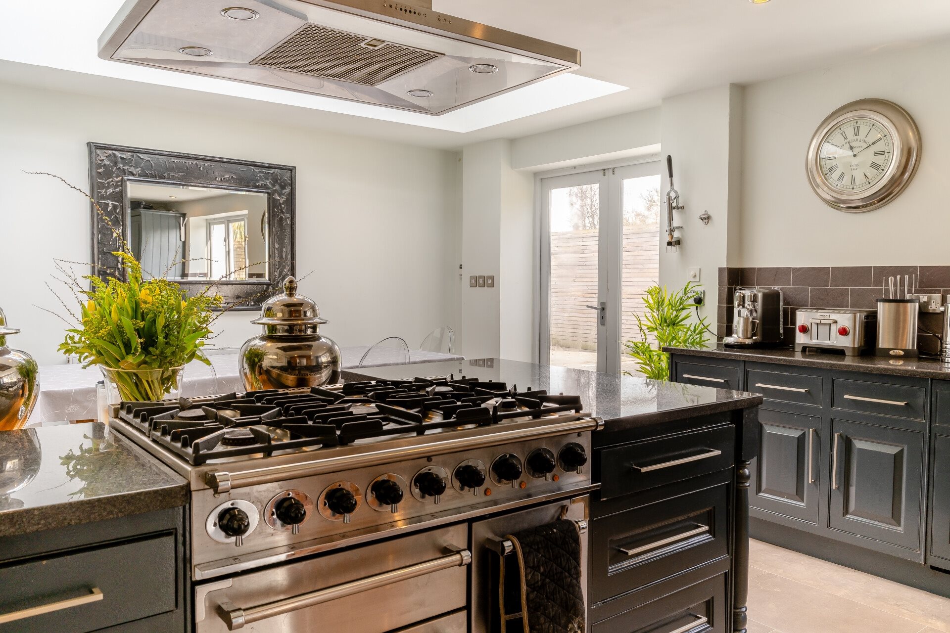 The kitchen is a chef's dream, complete with slate grey cupboards topped with granite and wooden work surfaces. A peninsula unit incorporates a large range-style cooker with an extractor hood, whilst built-in appliances include a microwave, dishwasher, and full-height freezer. An American-style fridge/freezer is tucked within a stunning bespoke pantry cupboard and storage unit, crafted by Quails of Usk.