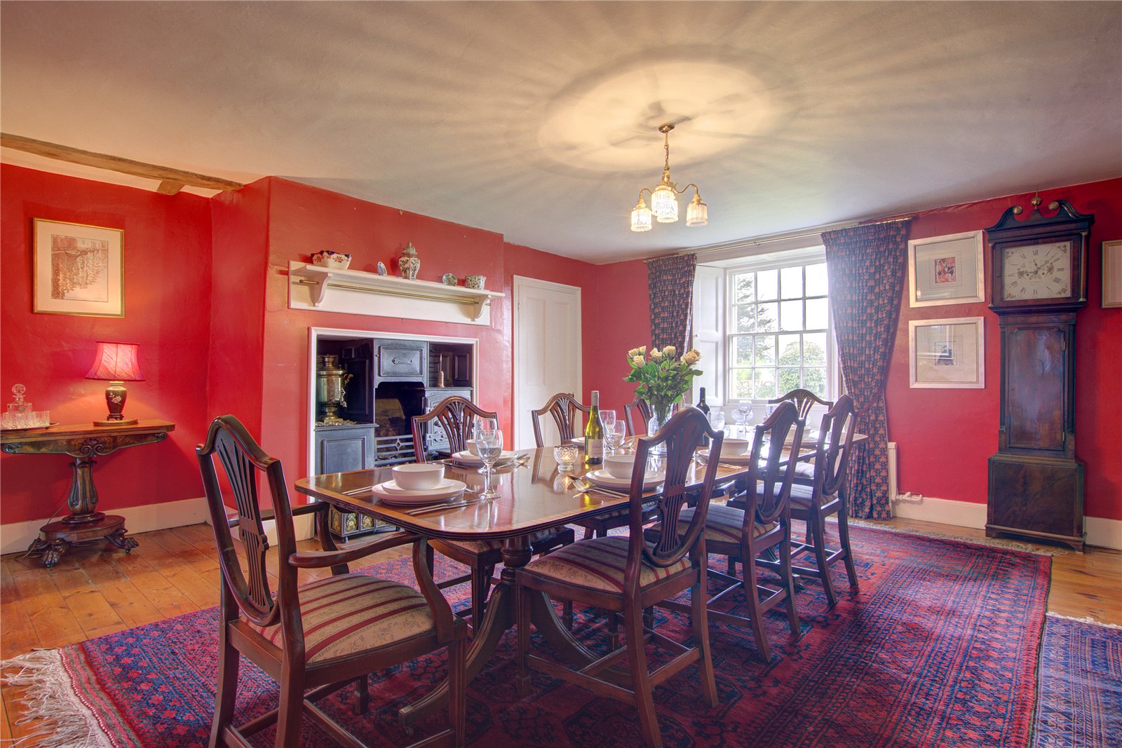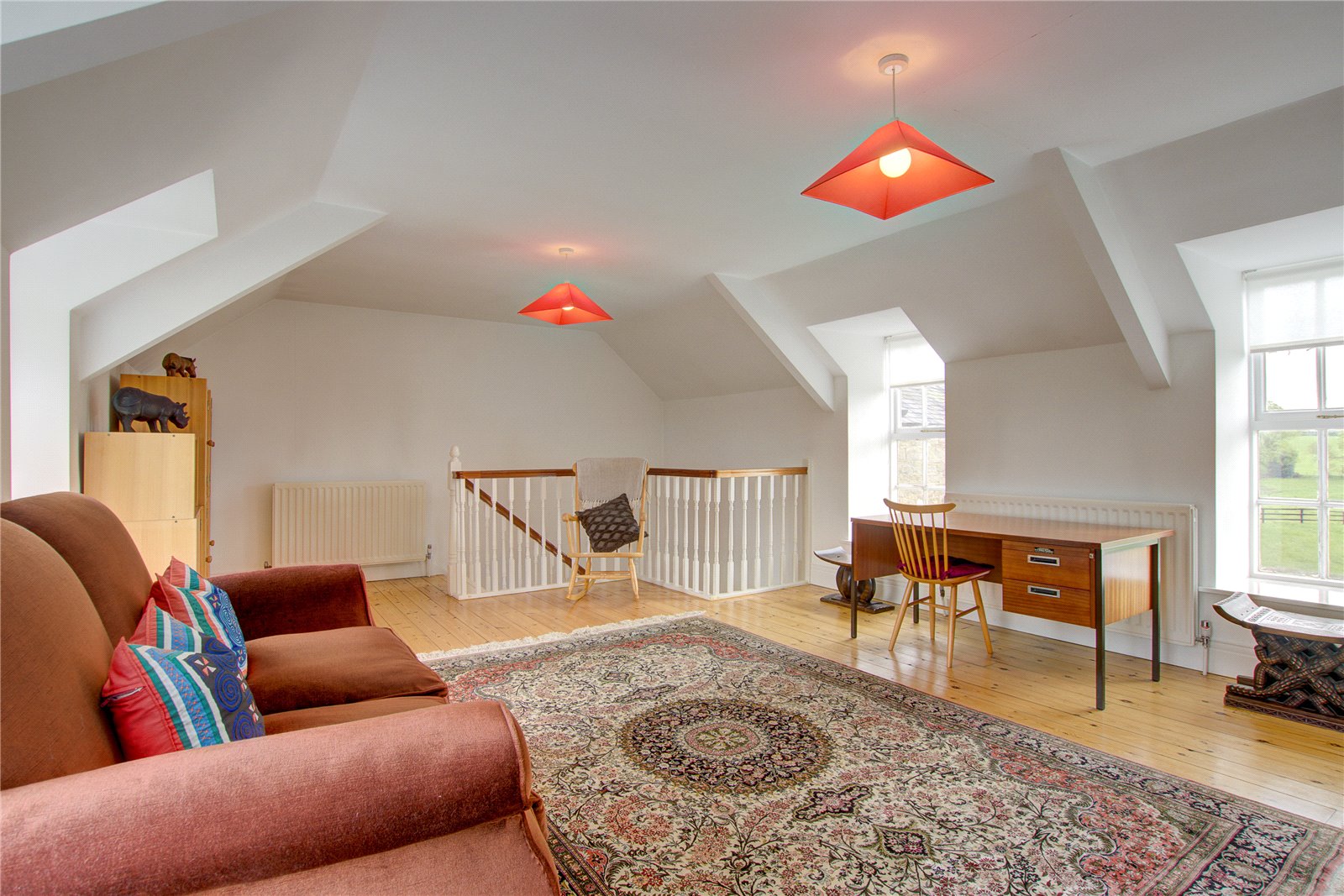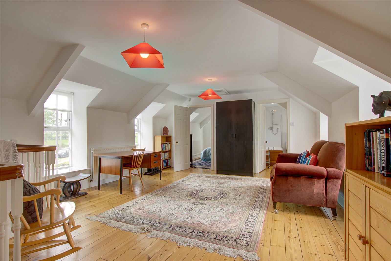 From the kitchen, a charming stone-flagged rear passageway featuring original exposed stone walls leads to a cold store, the rear door into the gardens and on into the beautiful, airy garden room. This is a delightful room with the original byre window arches and offering a tranquil space to relax and enjoy views of the surrounding lush green landscape. A study, which could also be a snug or a family room, provides flexibility to accommodate various lifestyle needs and preferences, and the traditional dining room features an original iron stove, creating a homely ambience for enjoying meals and gatherings with family and friends.