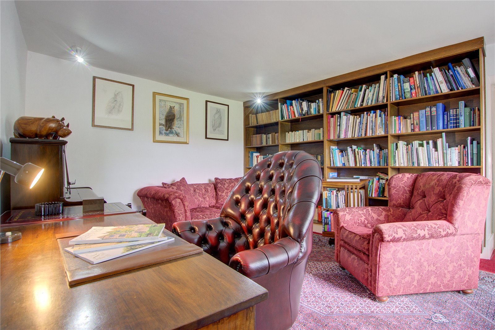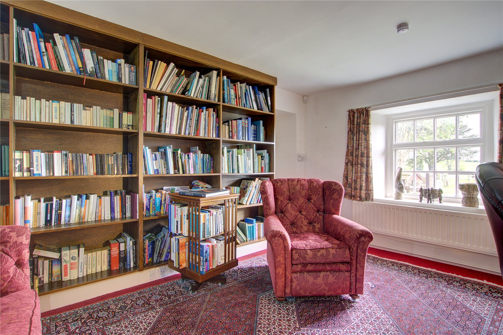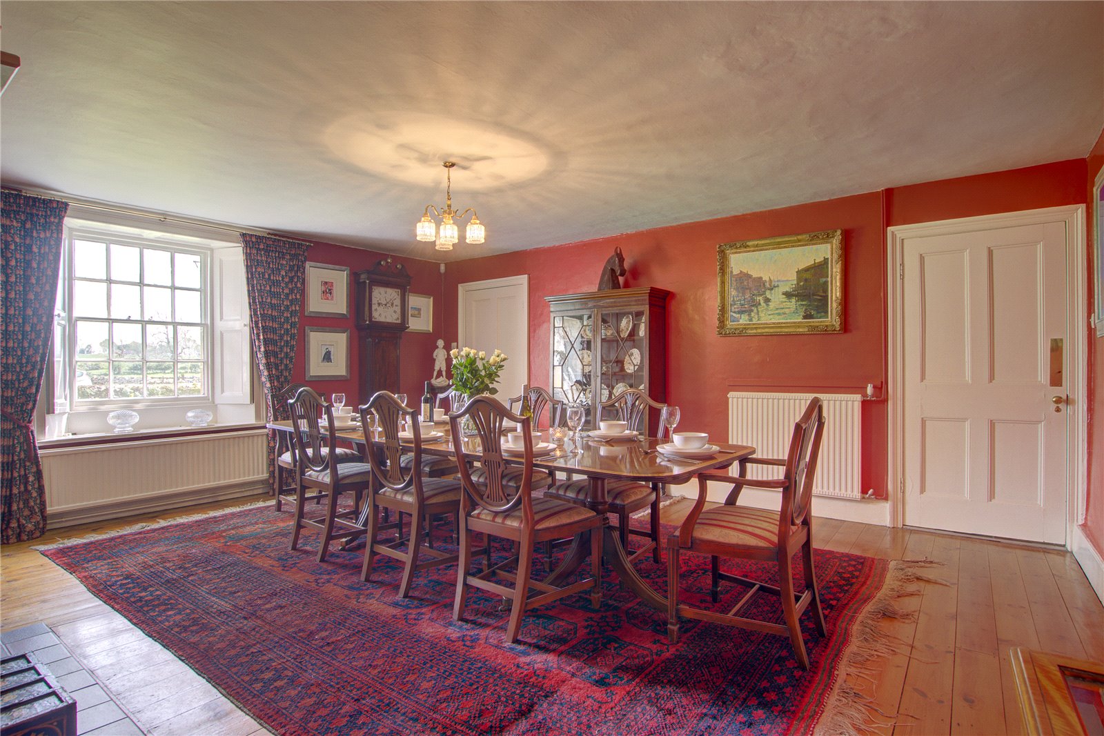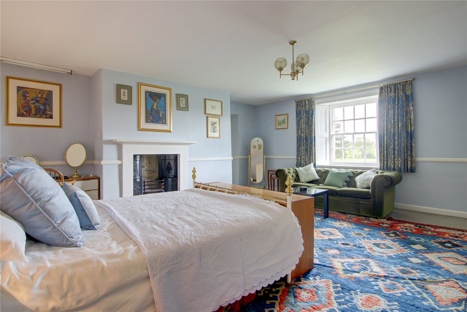 From the kitchen, a charming stone-flagged rear passageway featuring original exposed stone walls leads to a cold store, the rear door into the gardens and on into the beautiful, airy garden room. This is a delightful room with the original byre window arches and offering a tranquil space to relax and enjoy views of the surrounding lush green landscape. A study, which could also be a snug or a family room, provides flexibility to accommodate various lifestyle needs and preferences, and the traditional dining room features an original iron stove, creating a homely ambience for enjoying meals and gatherings with family and friends.