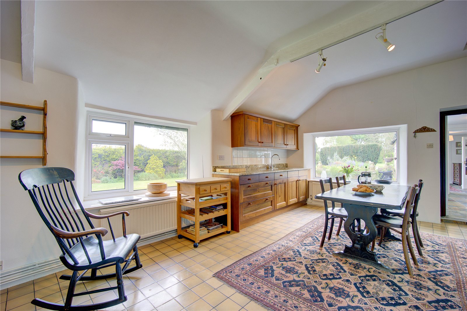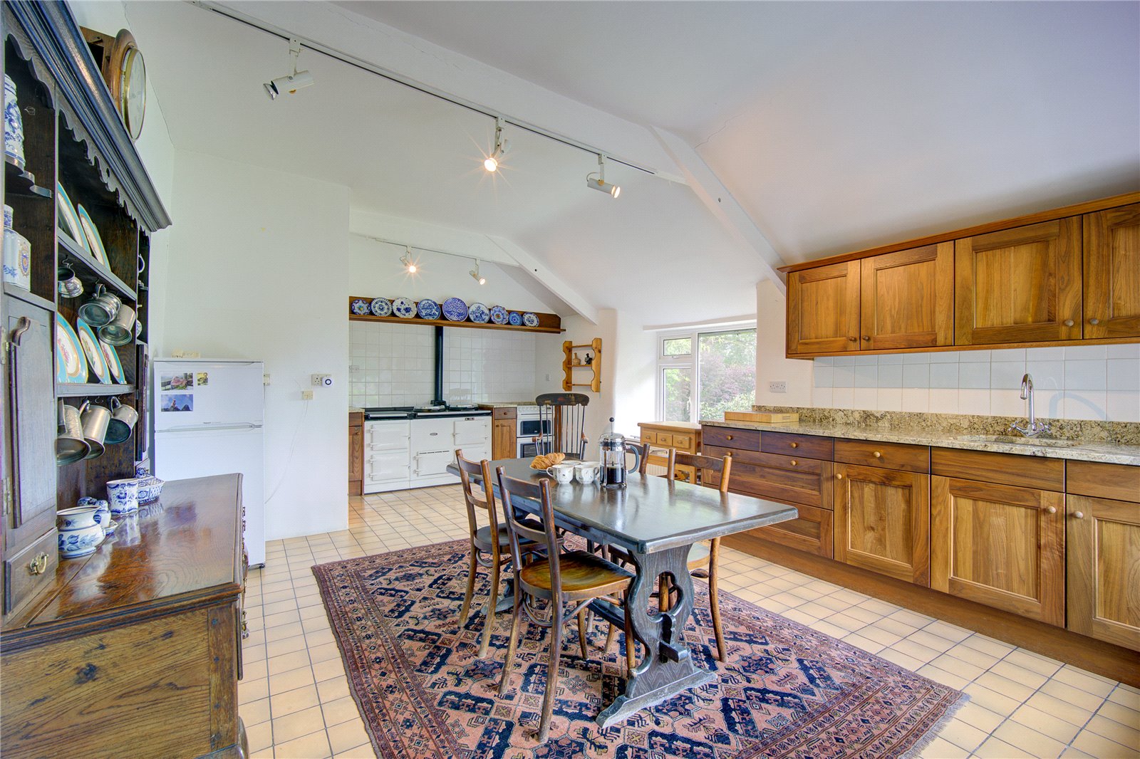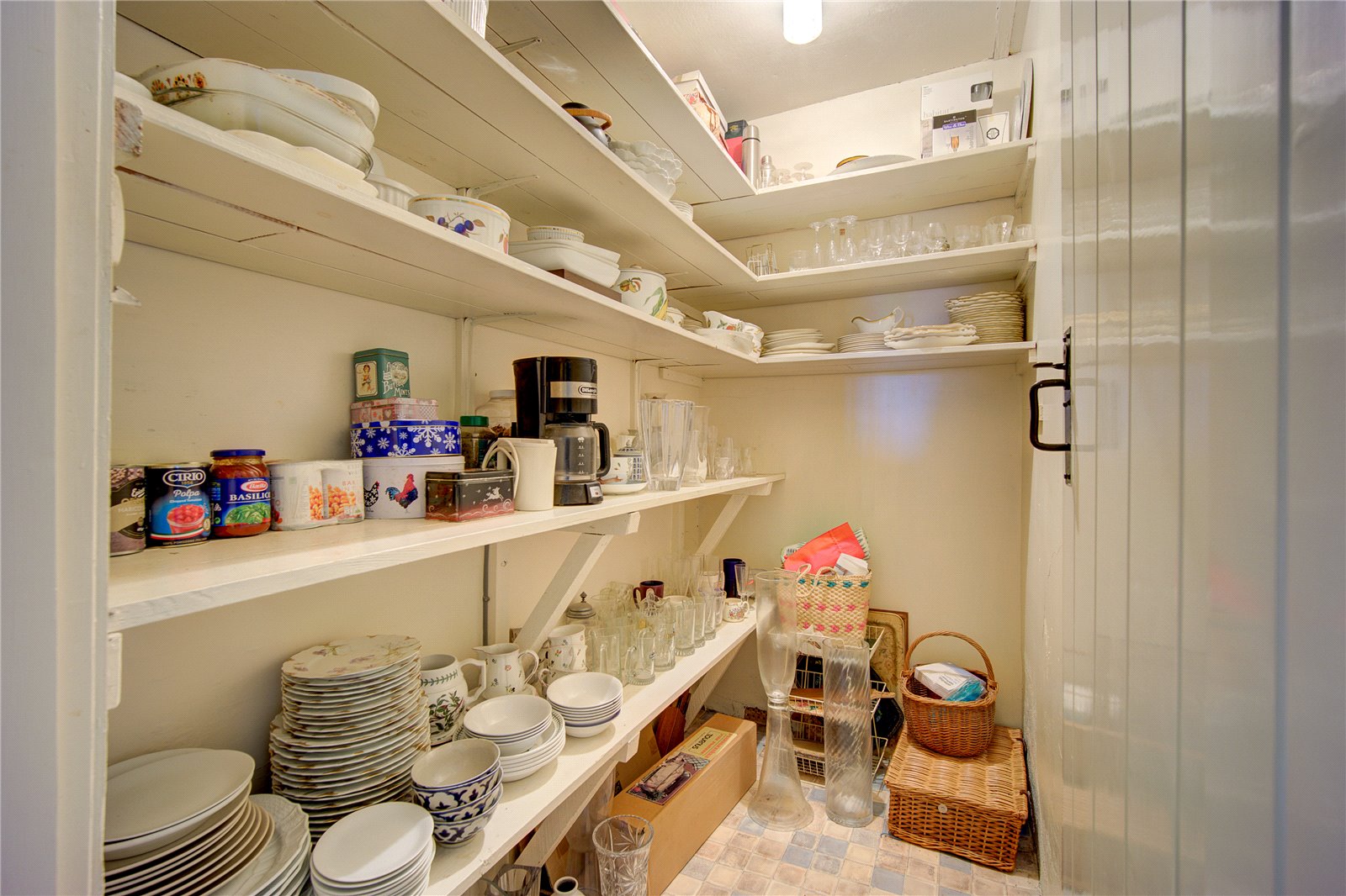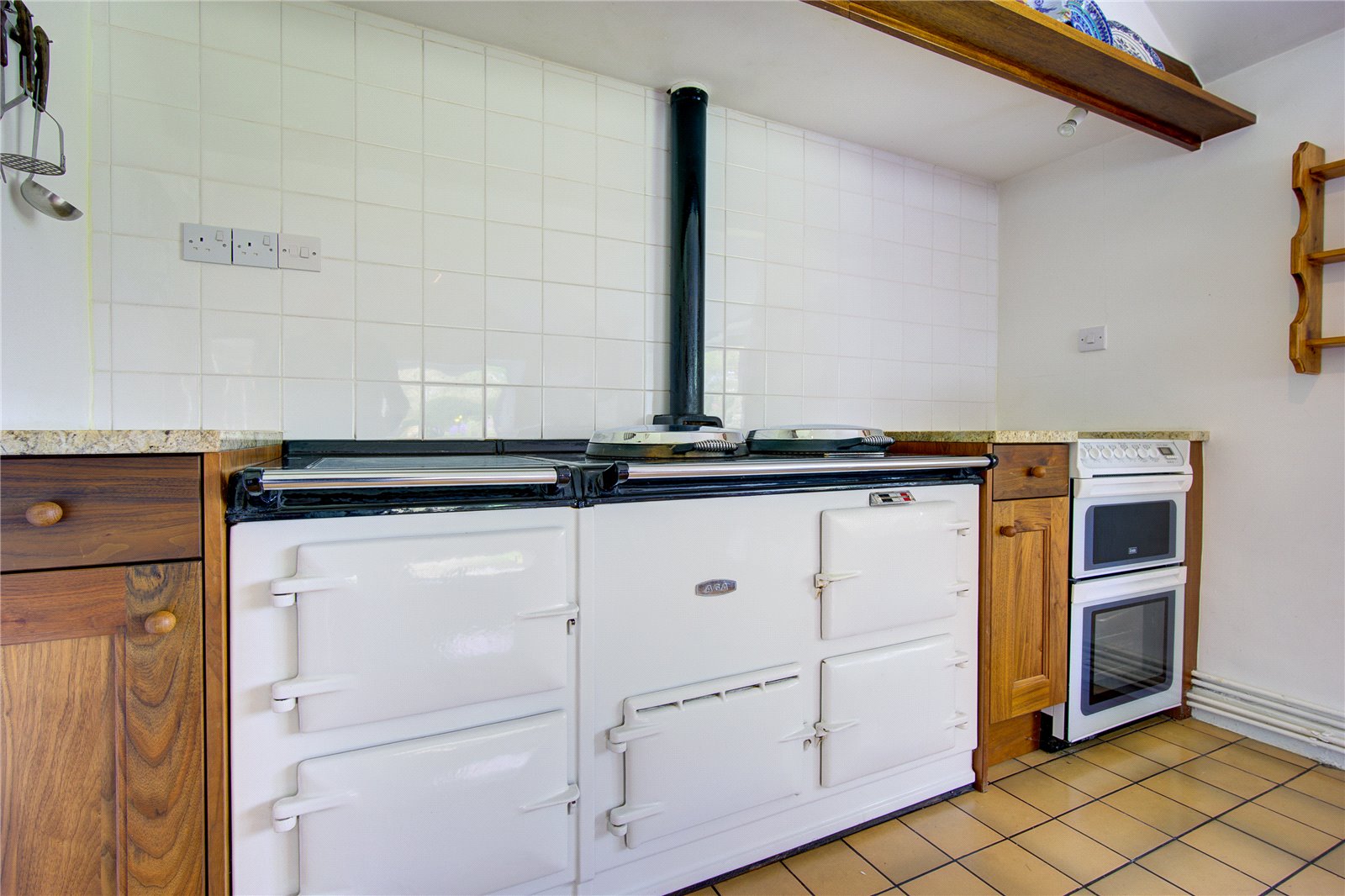 Step through the front door into a welcoming entrance hall with understairs storage and into the elegant sitting room, boasting an open fire, perfect for creating a warm and inviting atmosphere. Across the rear hall, an expansive utility room offers ample storage space and plumbing for laundry facilities with direct access to the gardens. A spacious walk-in pantry featuring floor-to-ceiling shelves is ideal for keeping groceries and kitchen essentials organised and easily accessible. A generously sized downstairs shower room affords convenience and comfort for residents and guests. The well-appointed light-filled kitchen with stunning views out over the gardens, benefits from a good range of wall and floor units and is equipped with an attractive white AGA, complemented by an electric oven and hob.