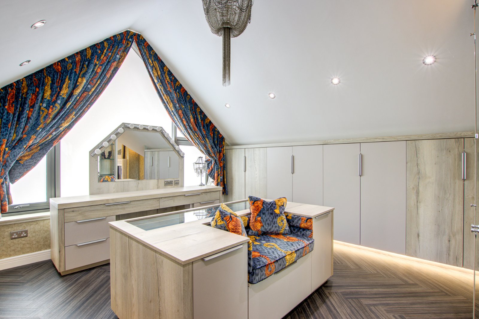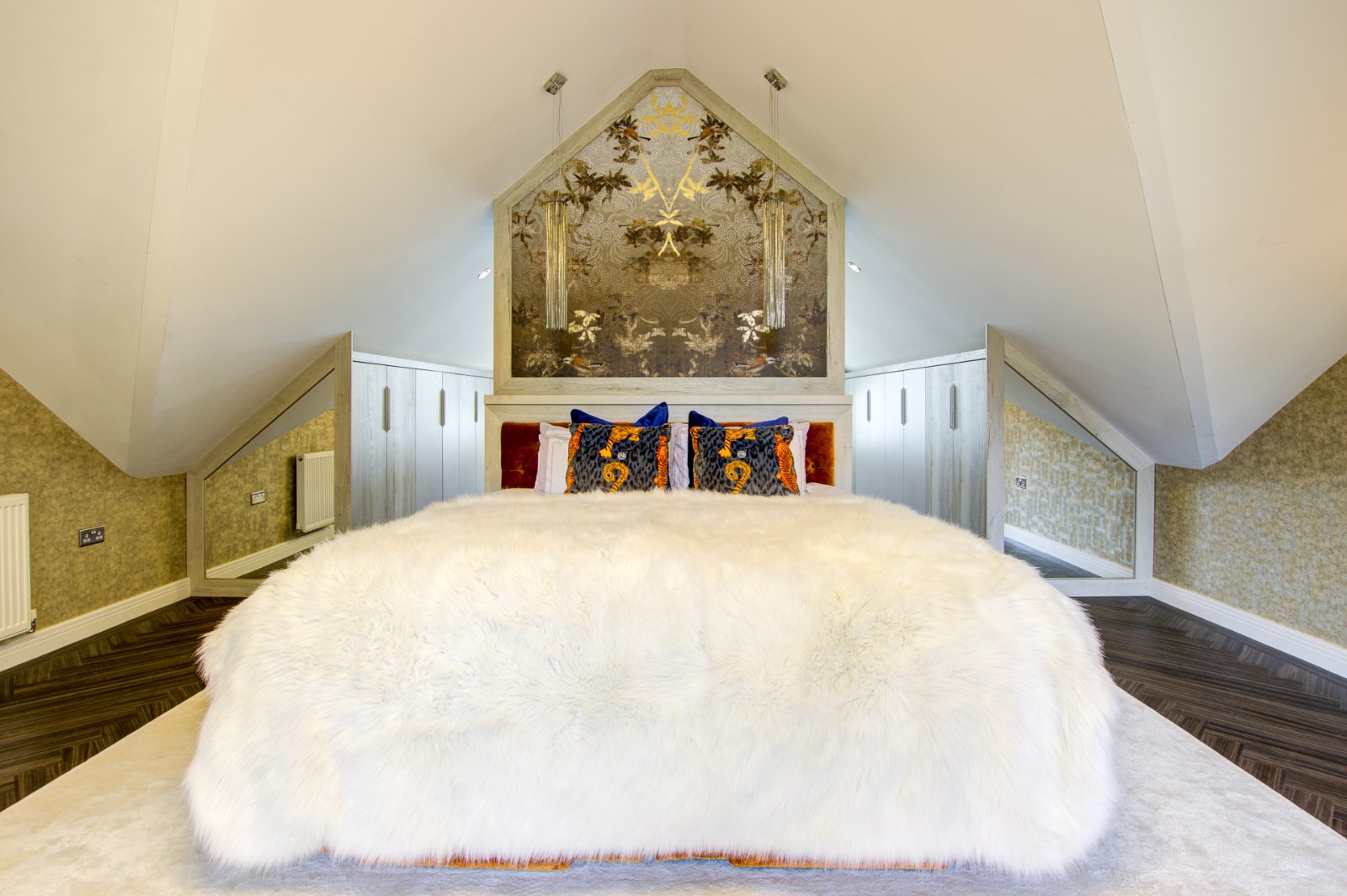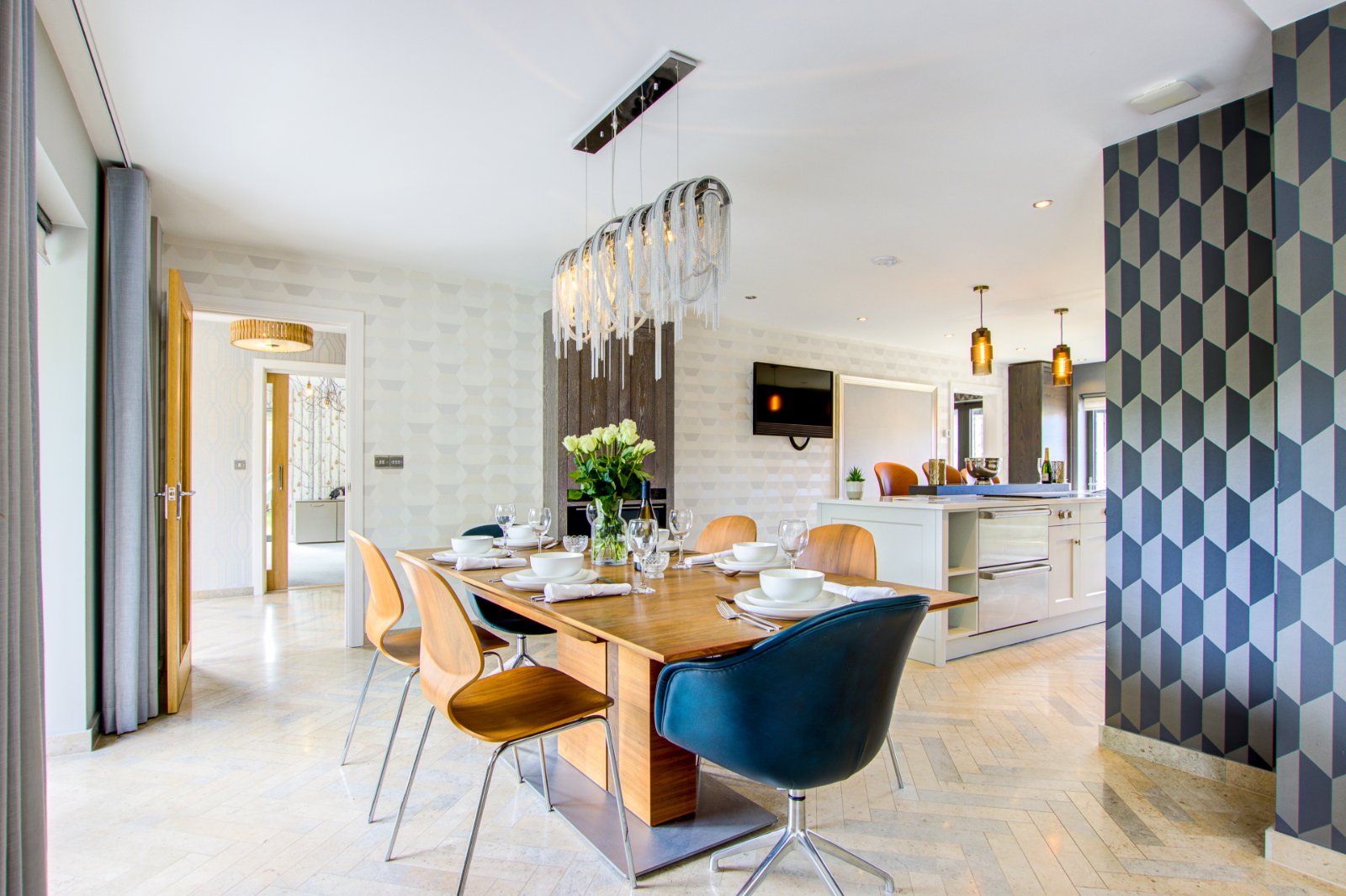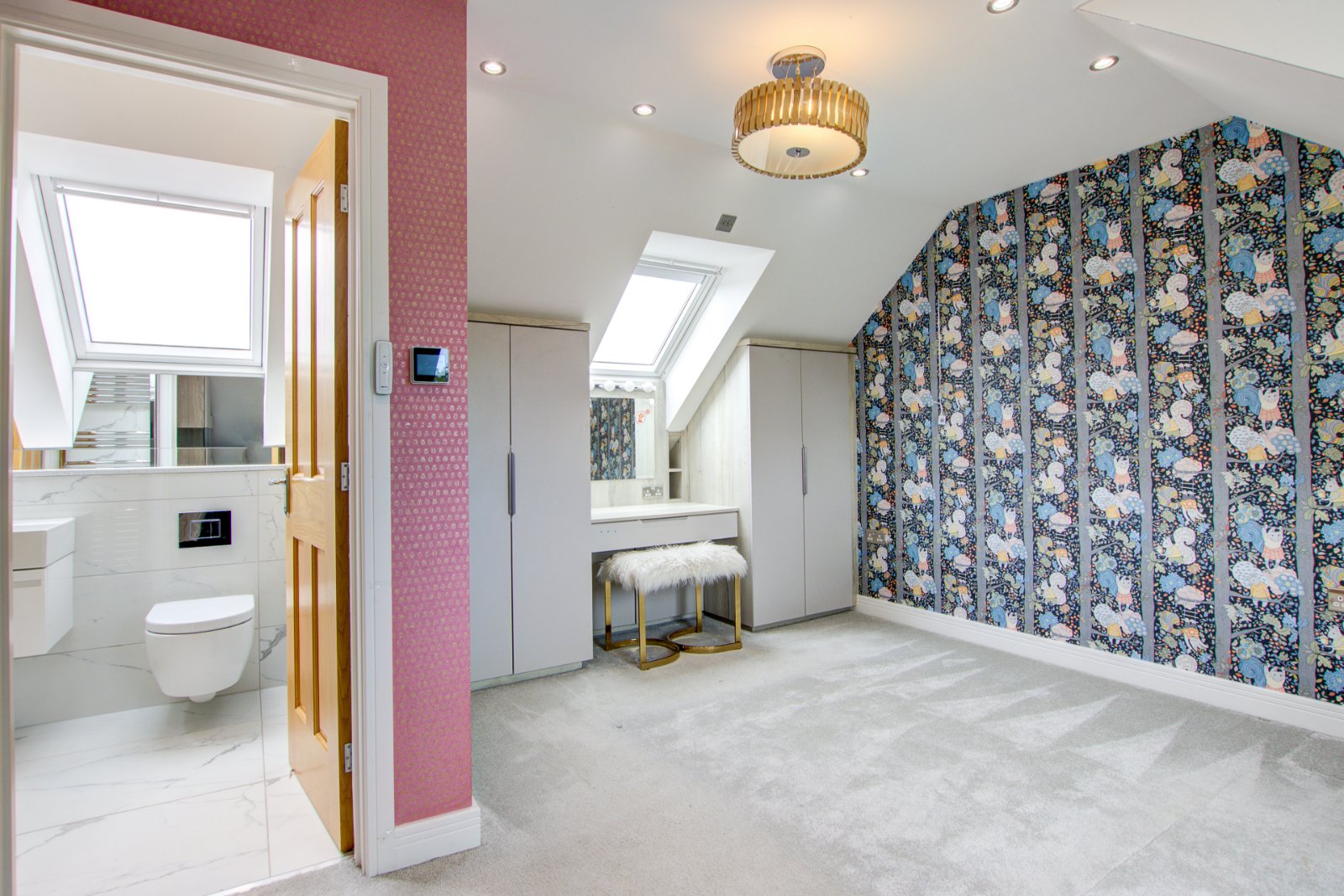 Entertain in style in the expansive open-plan kitchen, dining and living space, blending a bespoke luxury kitchen, an elegant dining space and an inviting sitting area. The kitchen is a culinary masterpiece with bespoke cabinetry and high-specification integrated appliances. This stylish social space is ideal for cooking and chatting with friends over a glass of wine before sitting down for dinner, whilst the spacious sitting area is perfect for entertaining and family living. A convenient laundry room sits just off the kitchen and a boot room/cloakroom leads through into the double-integrated garage, where a handy utility space has been created.