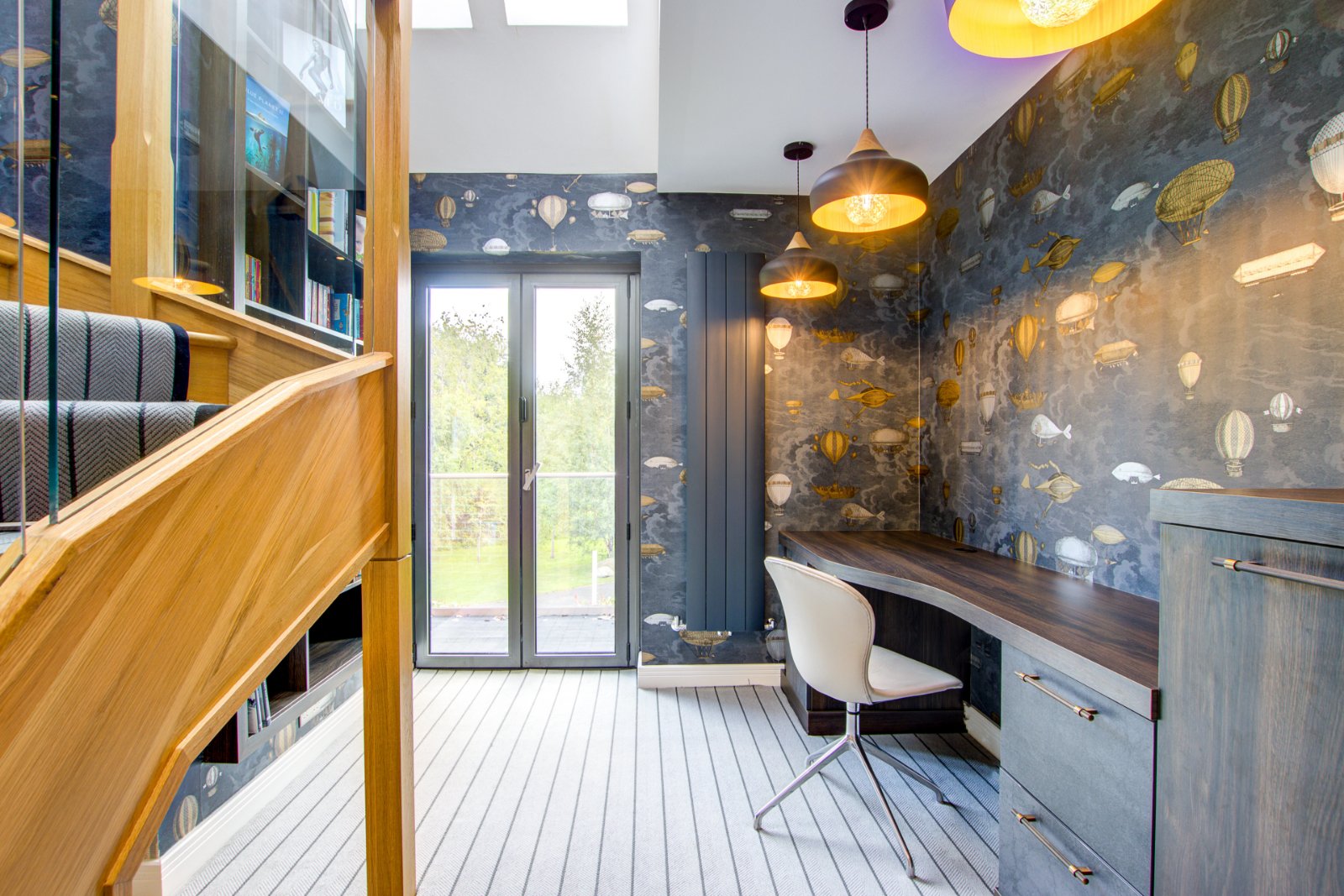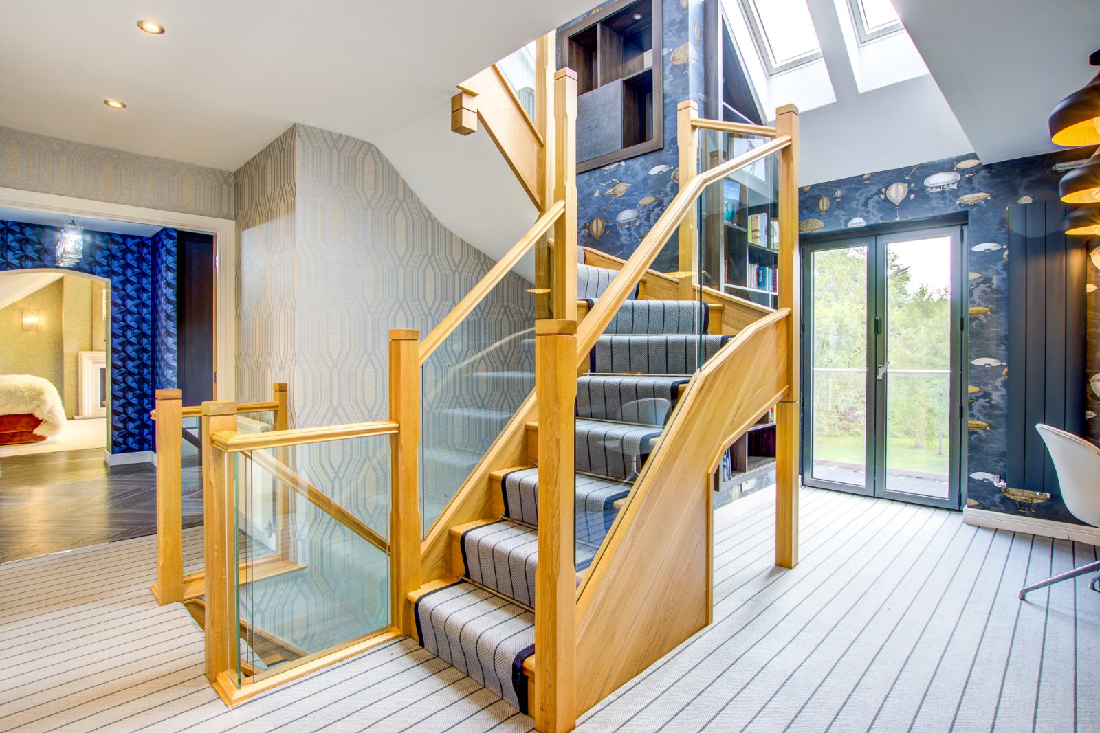 The spacious landing, bathed in natural light, houses a study area, which is perfect for working from home and features a wonderful open wood and glass staircase leading up to the second floor.