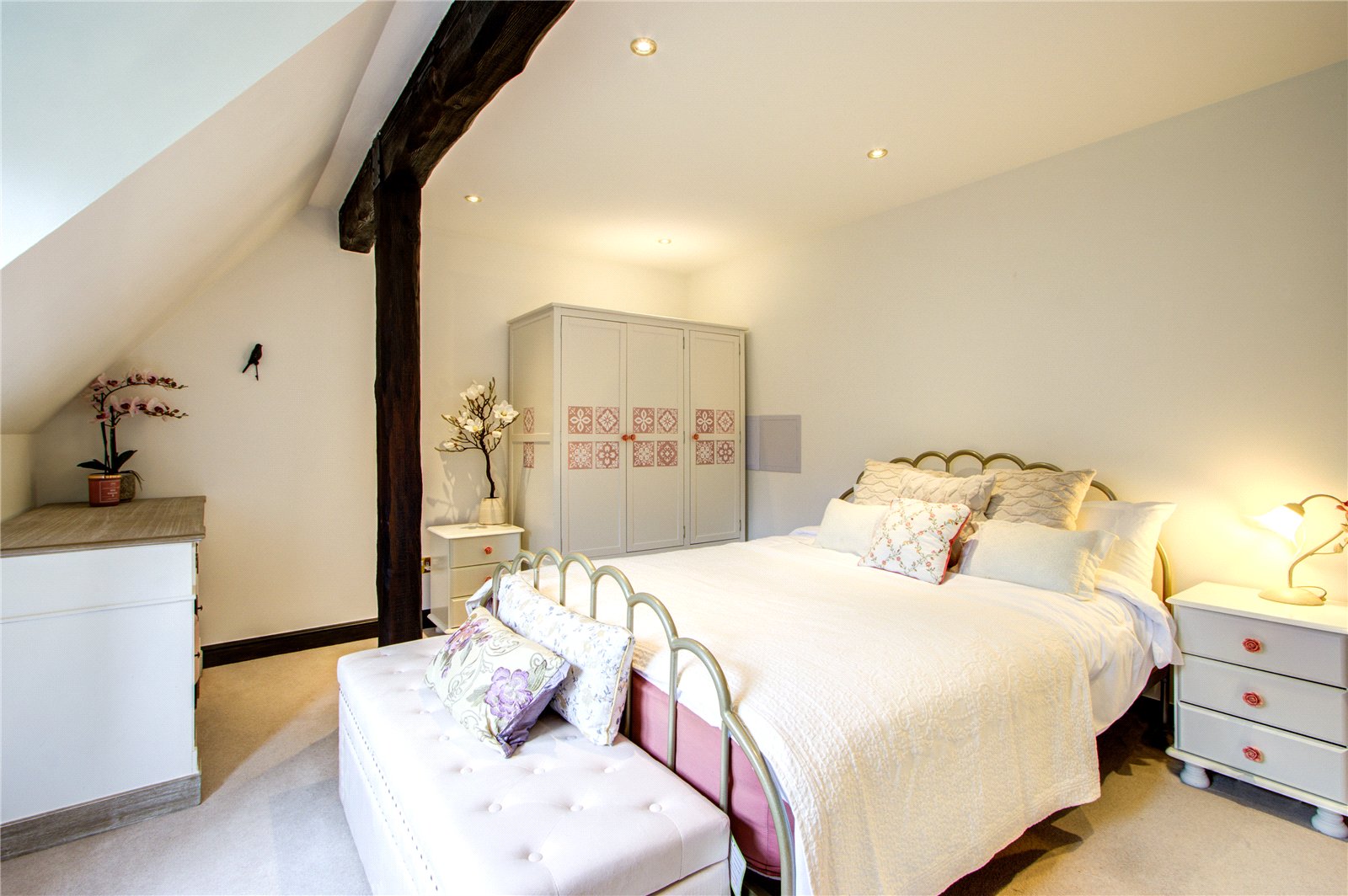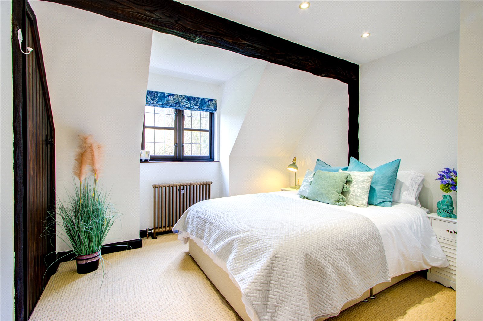 Four additional charming double bedrooms, all offering serene garden views, complete the first floor. Two of these rooms benefit from fitted wardrobes and under-eaves storage, and one is currently being used as a spacious dressing room. The impressive family bathroom features a stunning freestanding bathtub and a walk-in shower, providing both style and functionality.