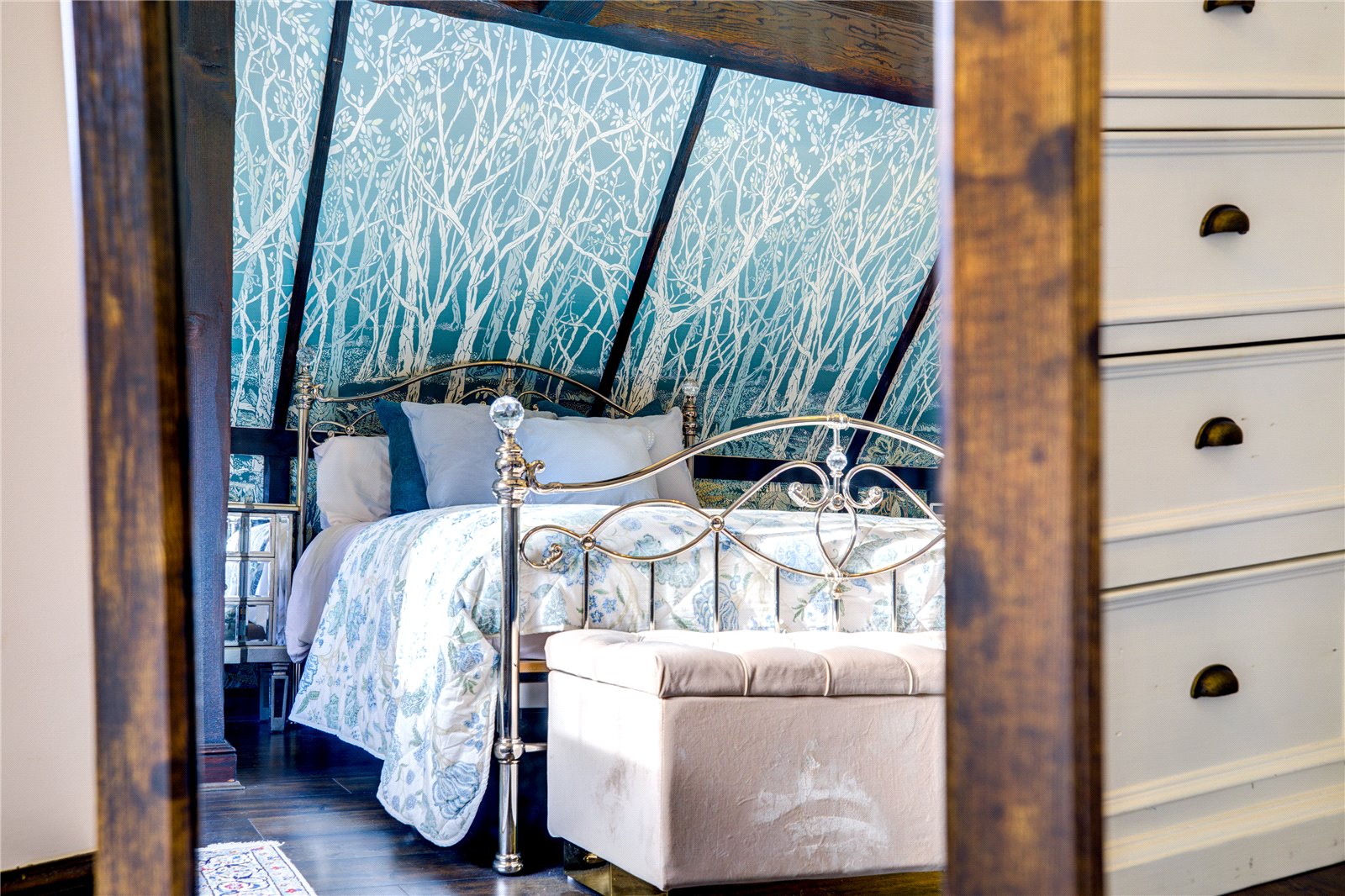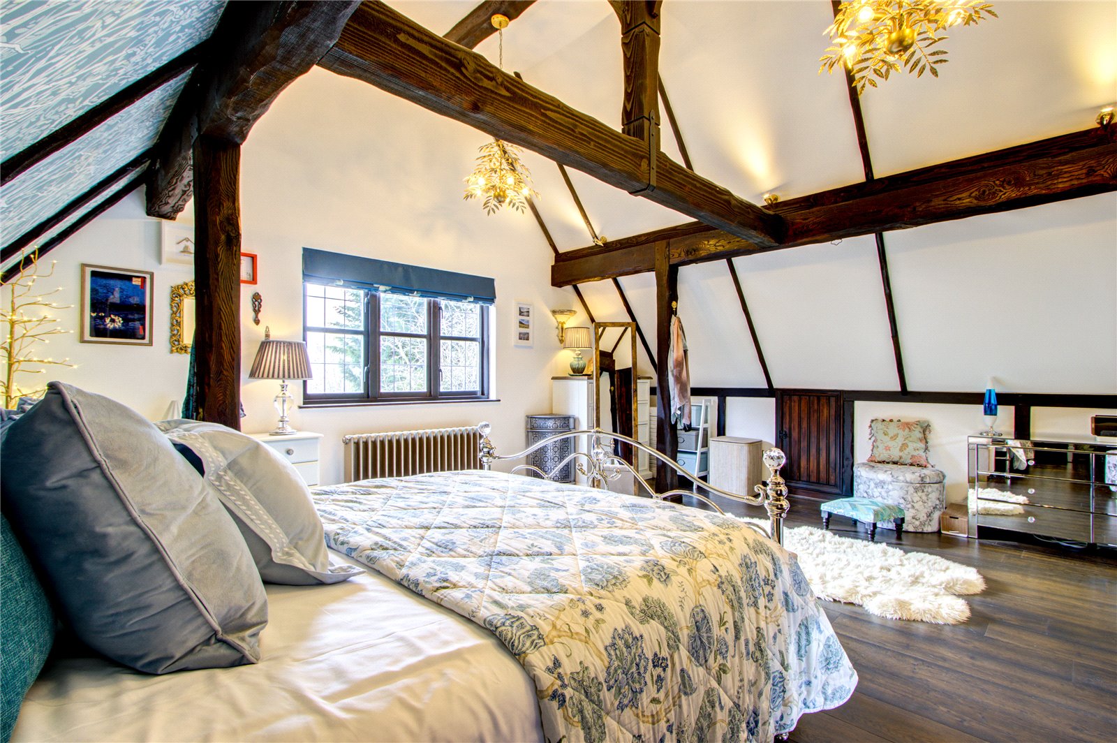 The principal suite is a true sanctuary, boasting exposed beams, vaulted ceilings, and a luxurious en-suite bathroom complete with a freestanding roll-top bath, a spacious walk-in shower, and dual basins.