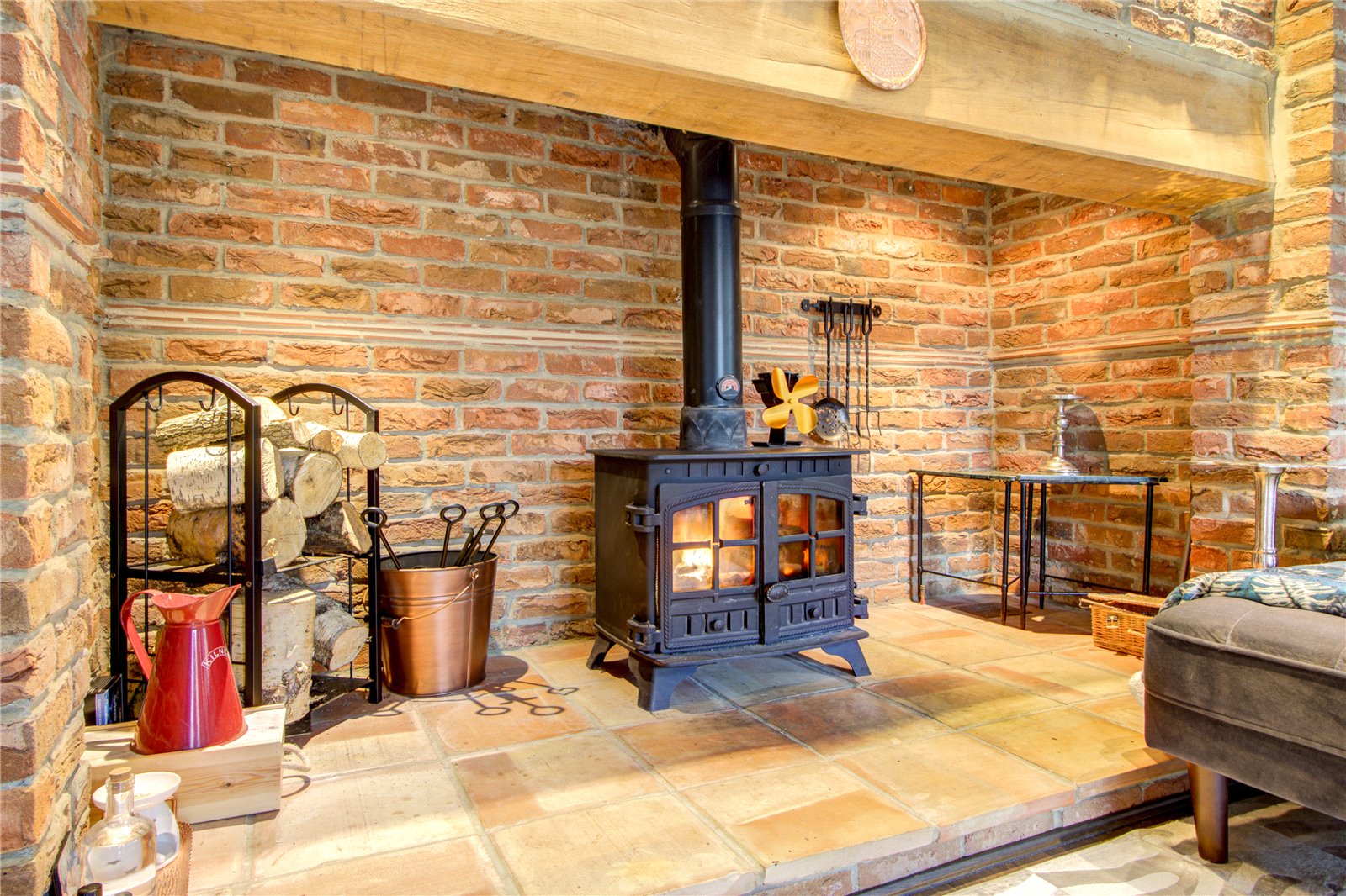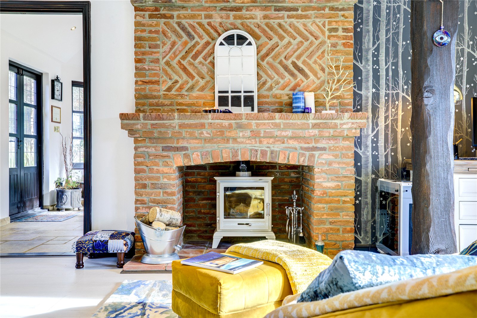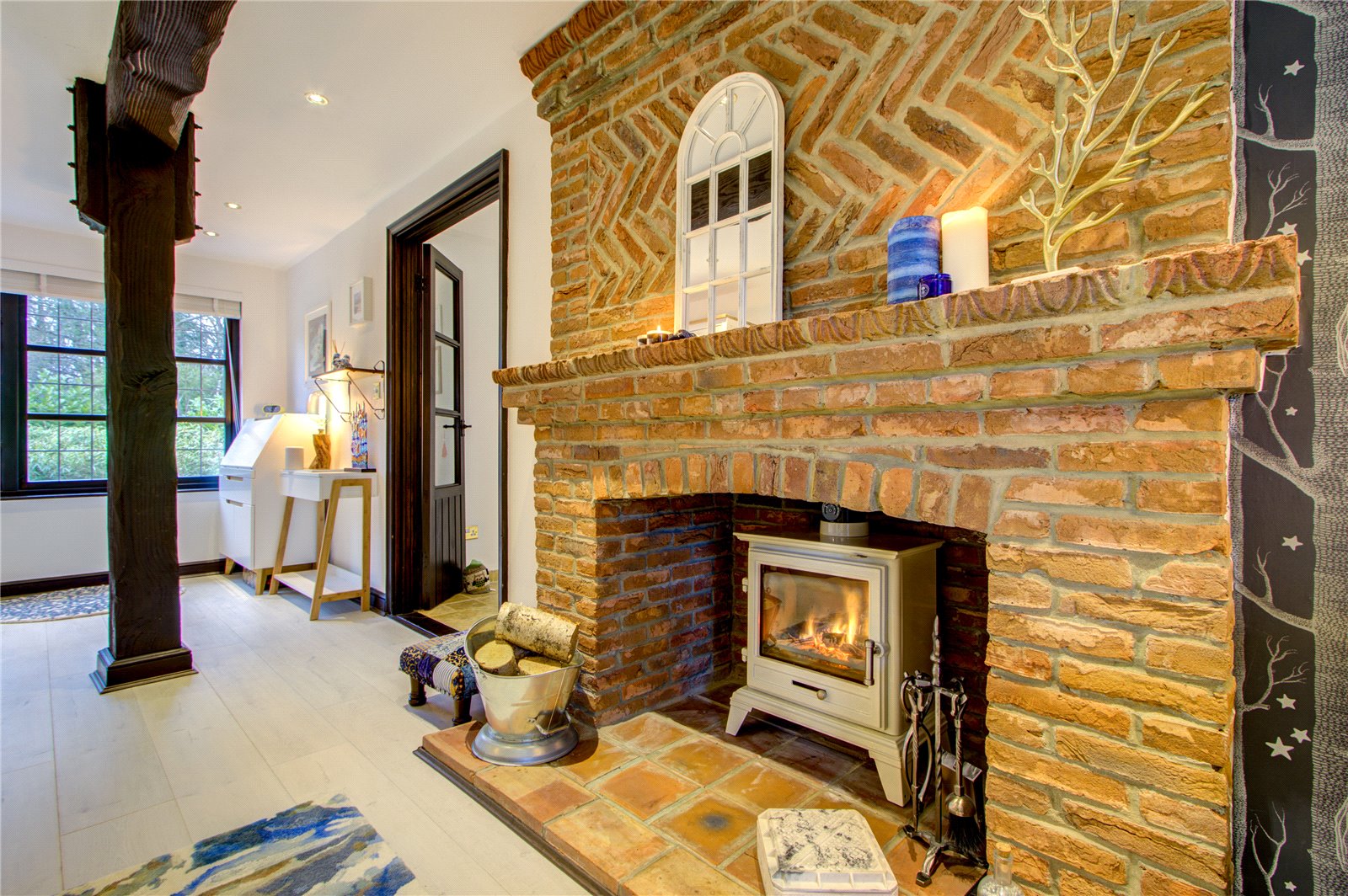 Beyond the reception hall, the interconnected dining and sitting rooms create an exceptional entertaining space, complete with two impressive brick inglenook fireplaces, wood-burning stoves, and expansive triple-aspect windows that bathe the room in natural light. French doors open onto the wrap-around decked terrace, seamlessly blending indoor and outdoor living.