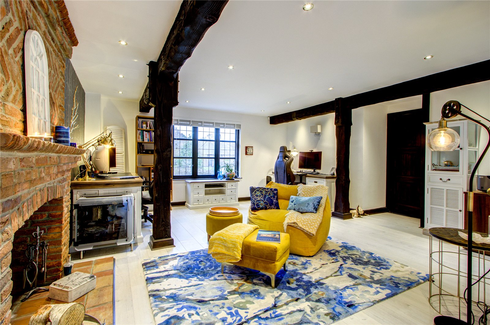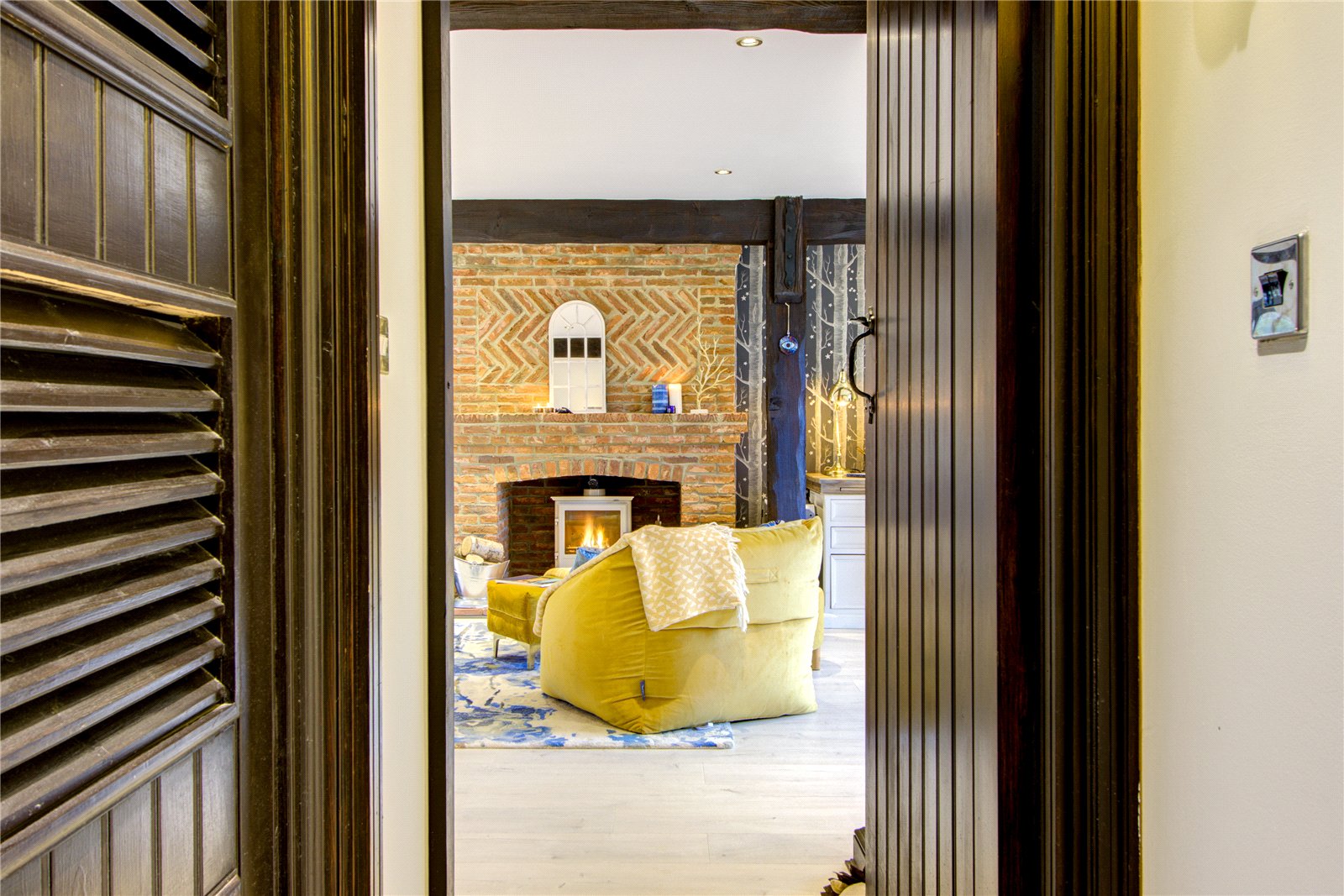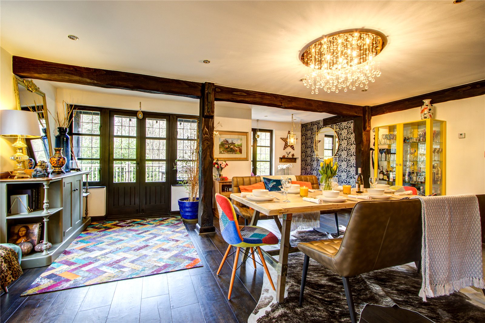 Beyond the reception hall, the interconnected dining and sitting rooms create an exceptional entertaining space, complete with two impressive brick inglenook fireplaces, wood-burning stoves, and expansive triple-aspect windows that bathe the room in natural light. French doors open onto the wrap-around decked terrace, seamlessly blending indoor and outdoor living.