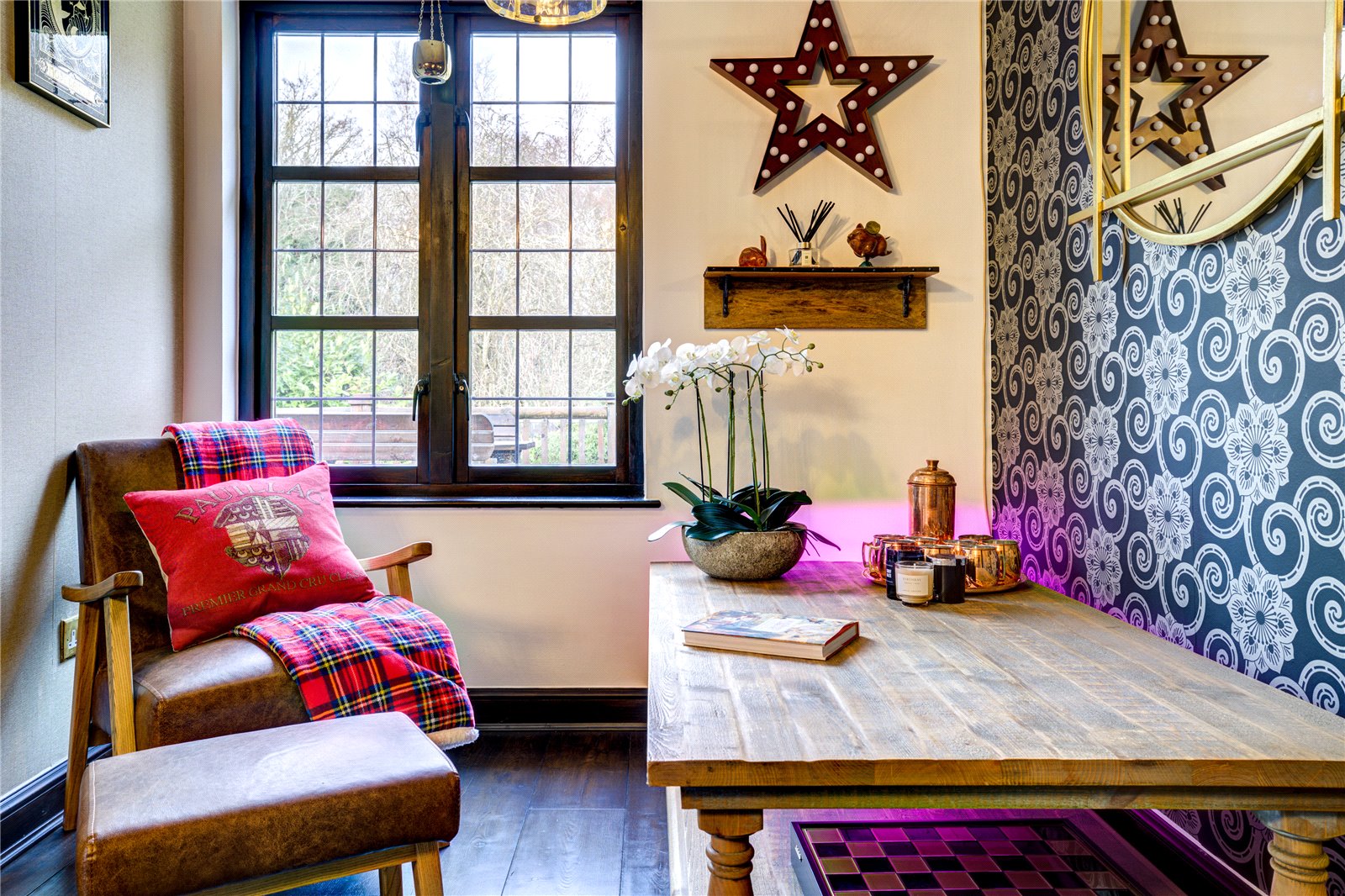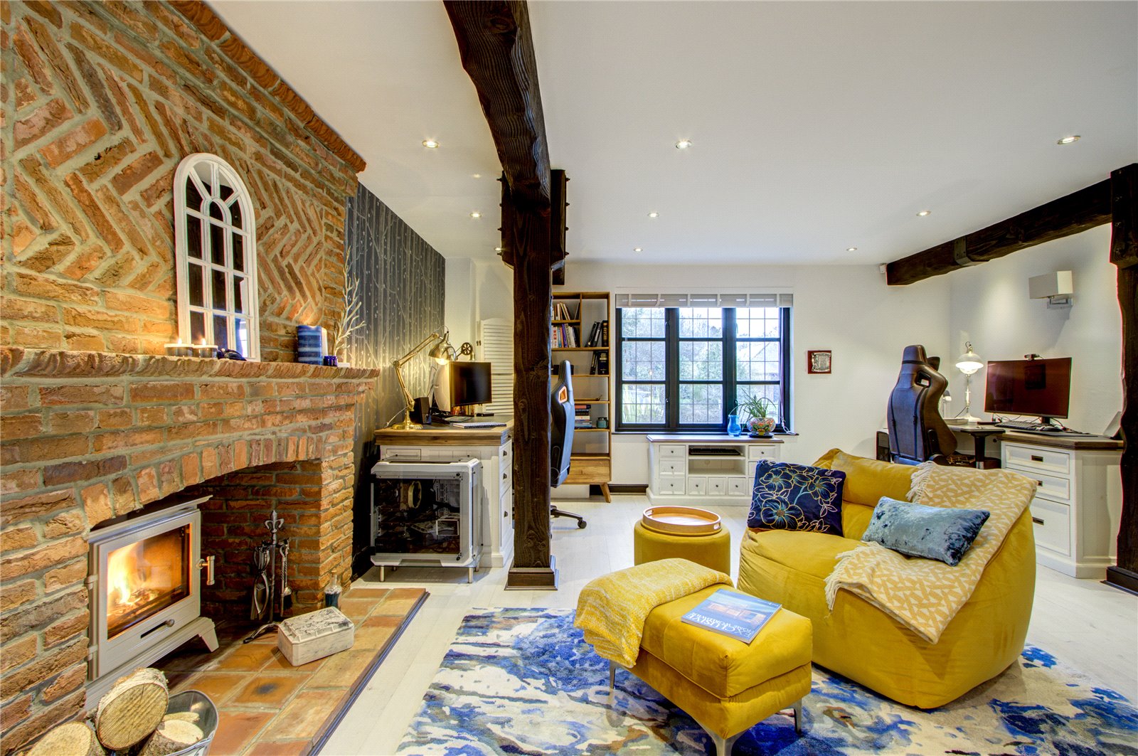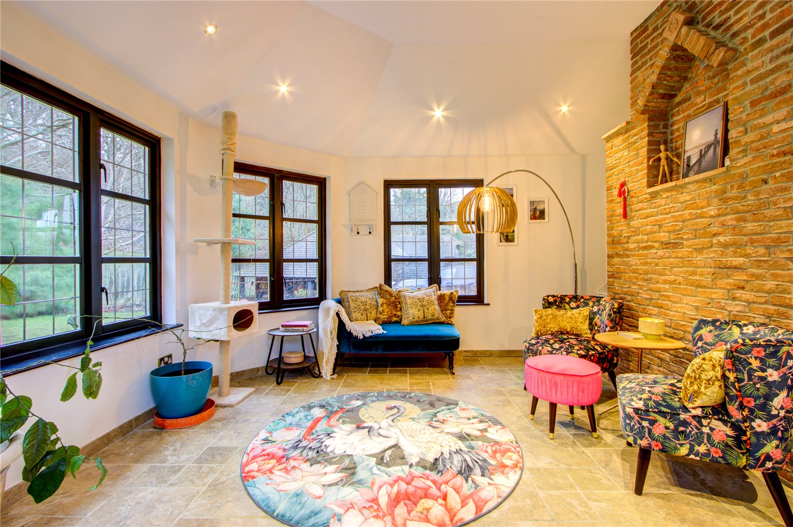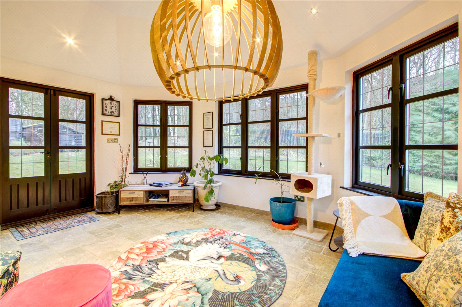 To the right of the hall, a delightful living room, recently fitted with a new wood-burning stove, serves as a versatile space - ideal as a TV room, reading room or home office. This room leads to the impressive garden room, where French doors frame picturesque woodland views, creating a tranquil retreat.